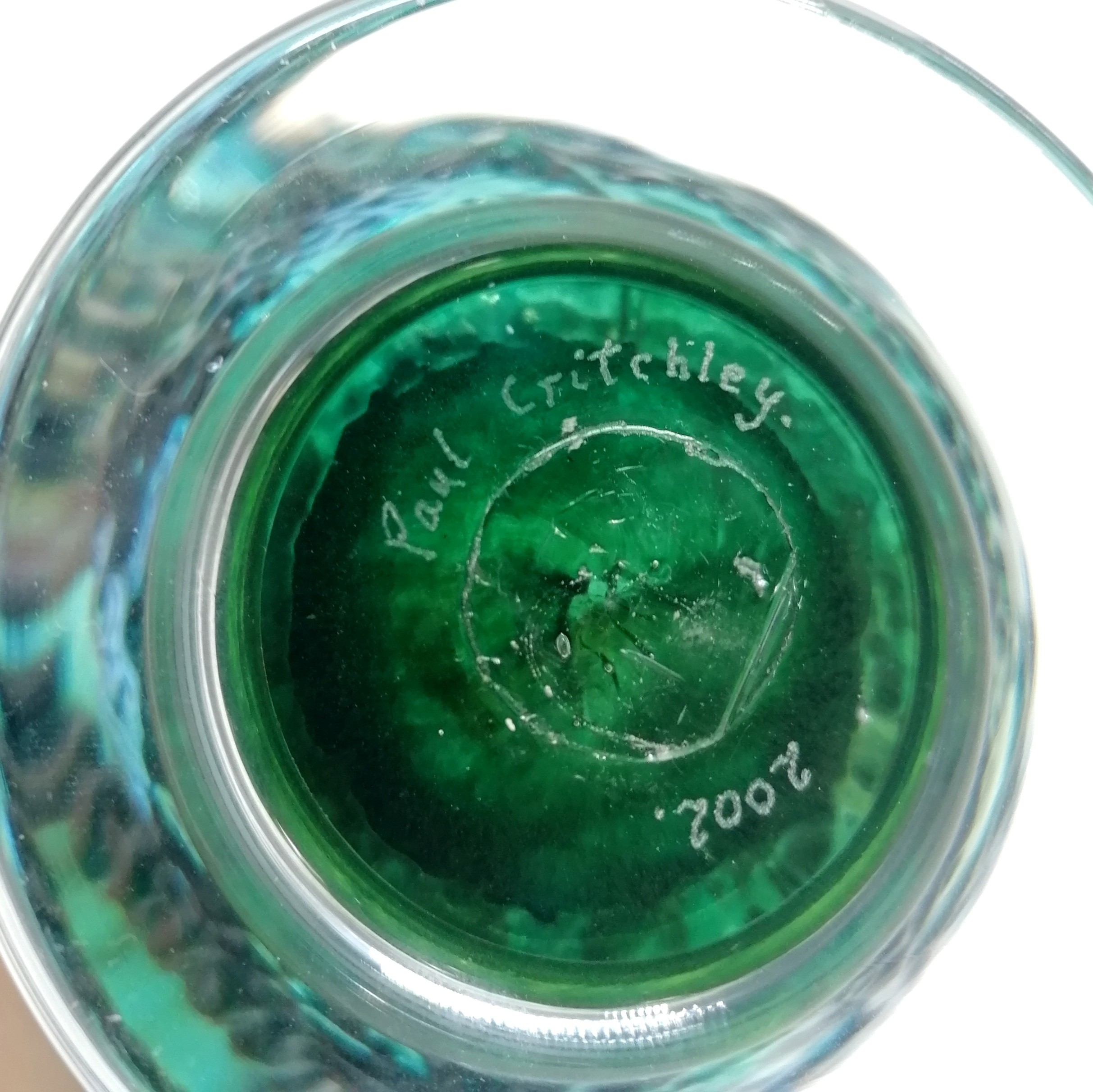 Paul Critchley 2002 art glass vase with seahorse & seaweed raised detail commissioned by the vendor - 18.5cm high x 11cm diameter