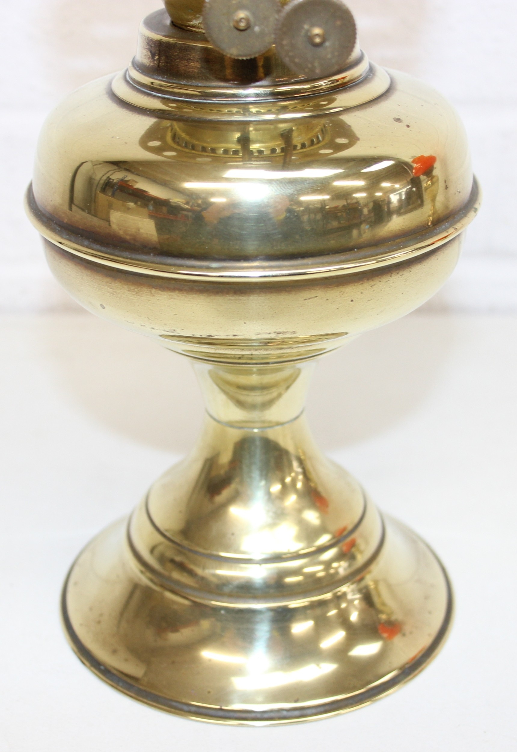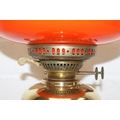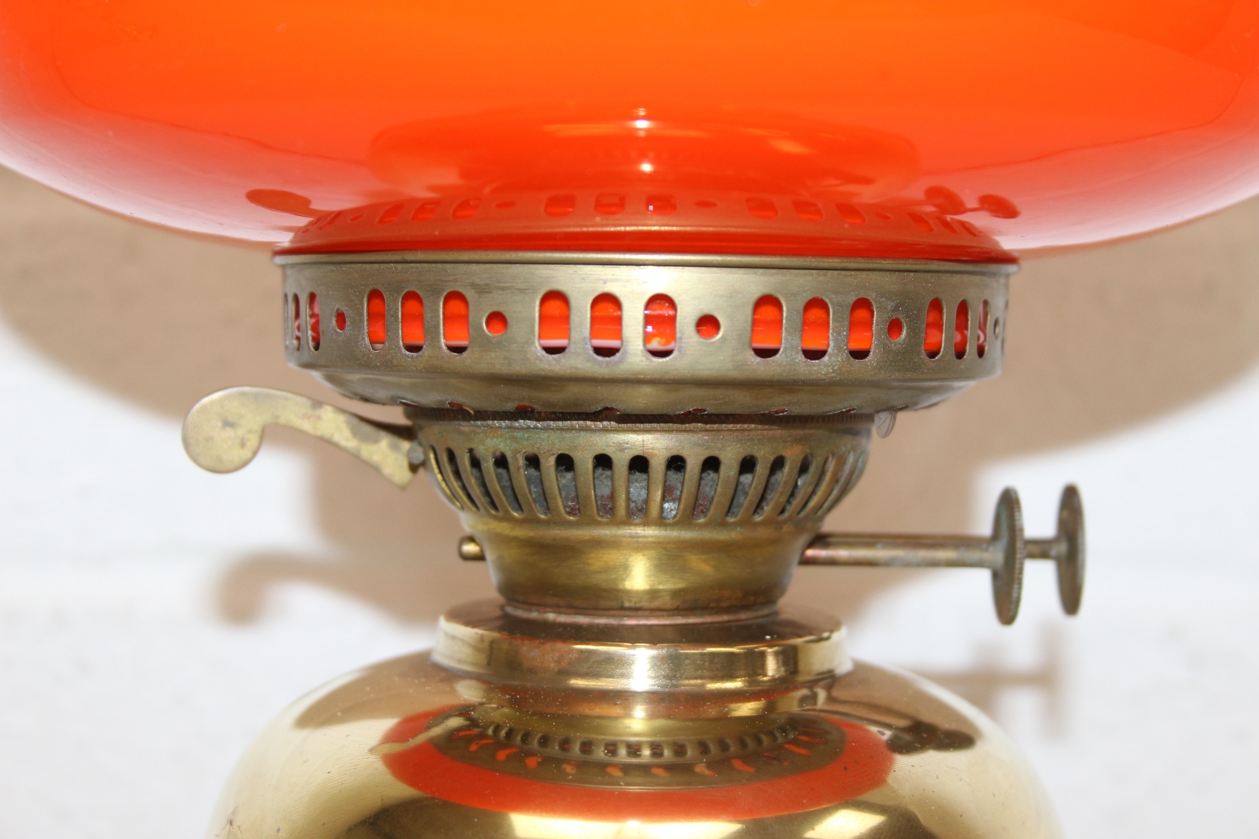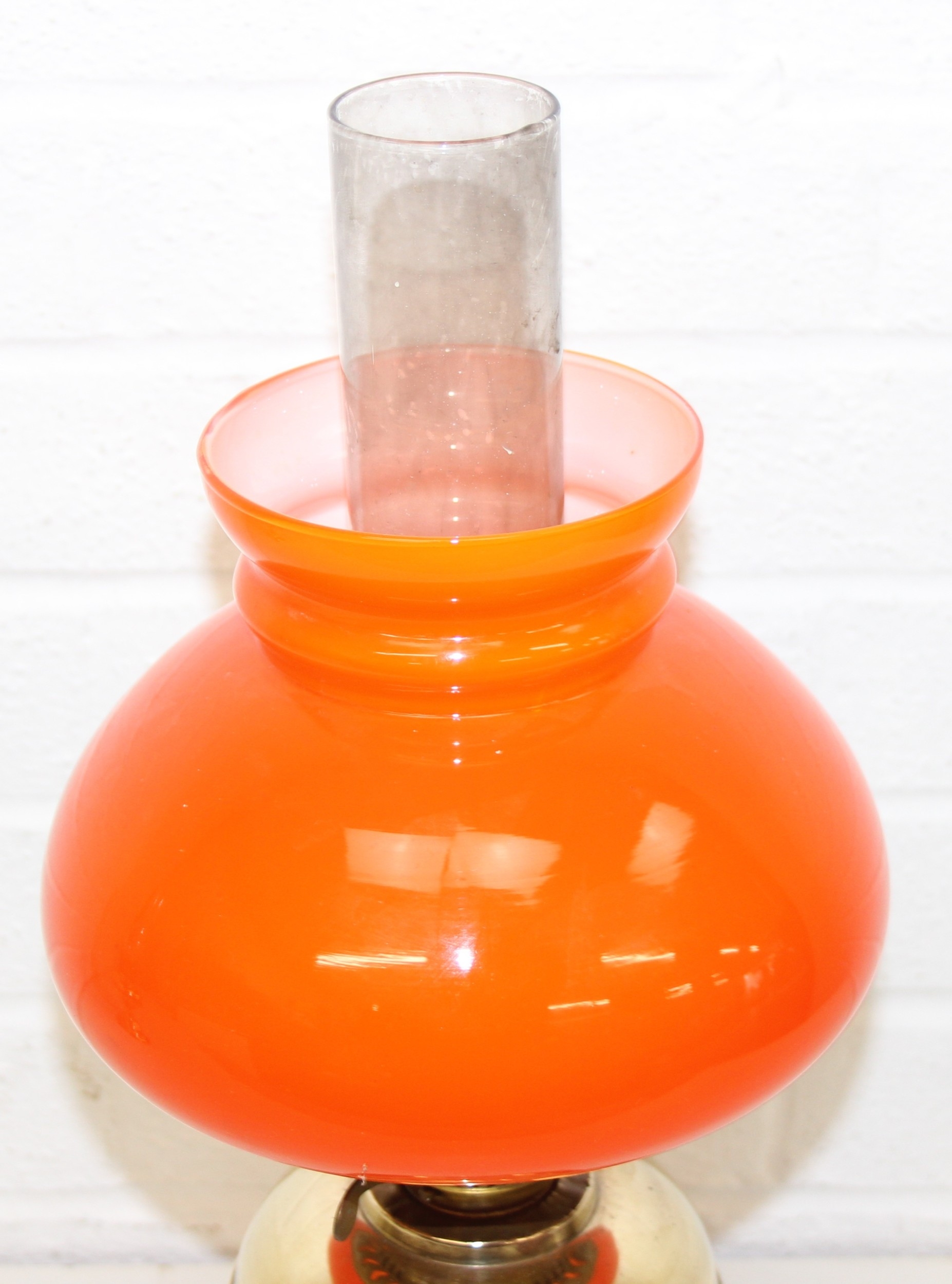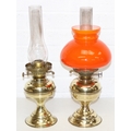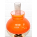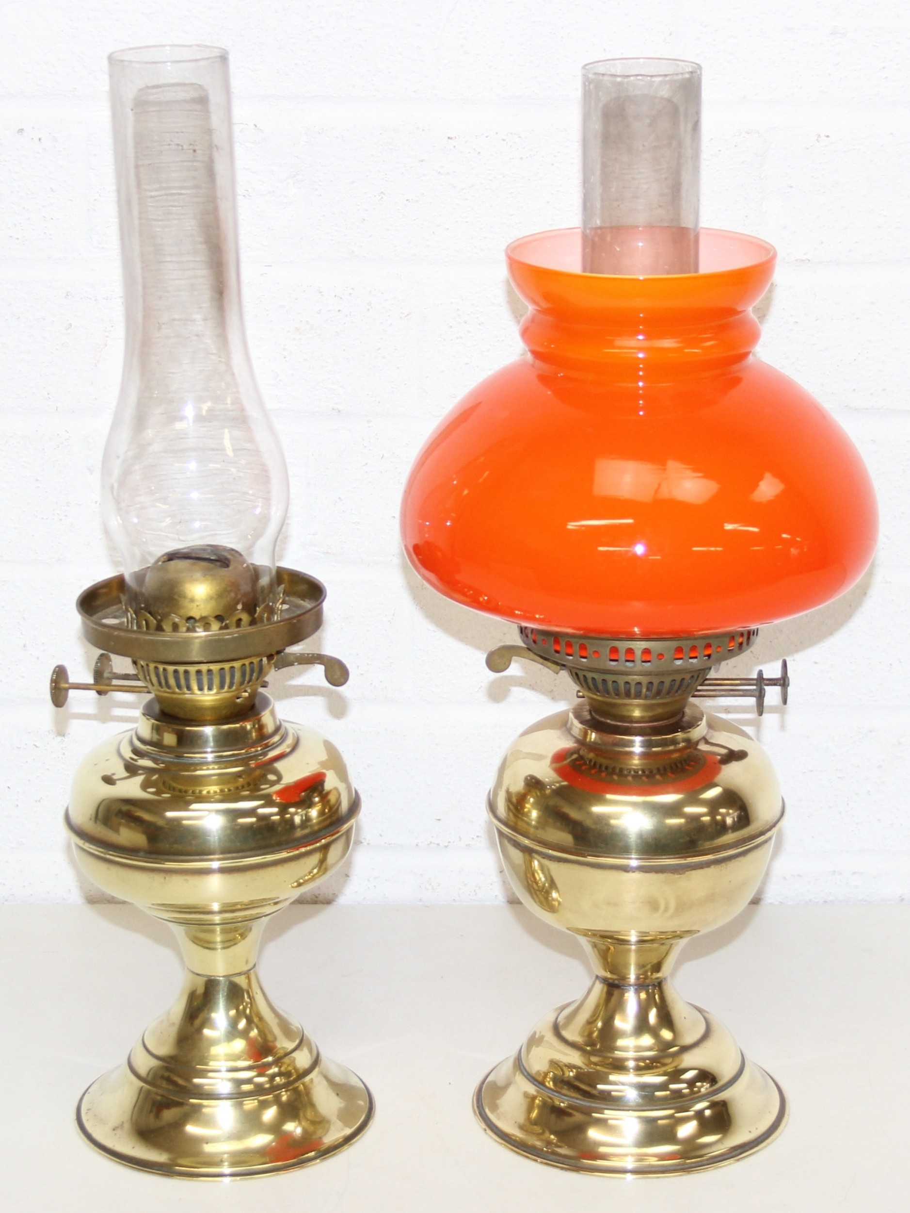 Pair of vintage brass oil lamps, one with orange glass shade, 47cm incl chimneys