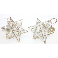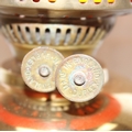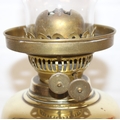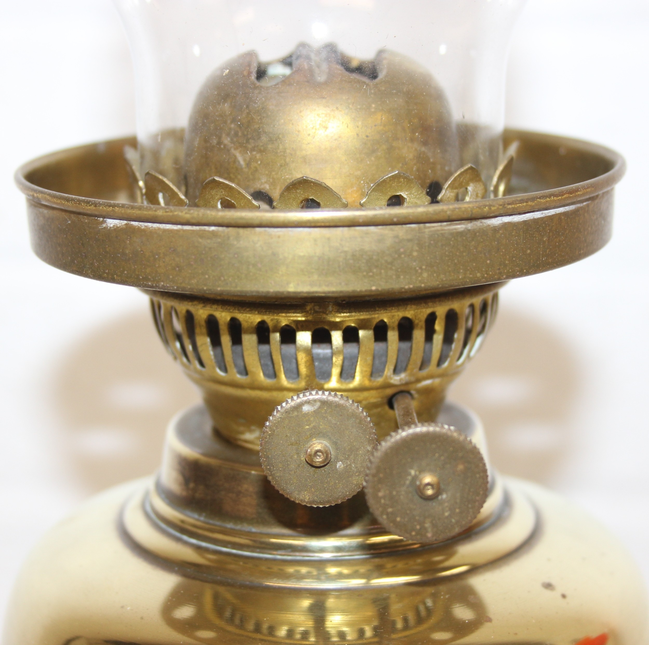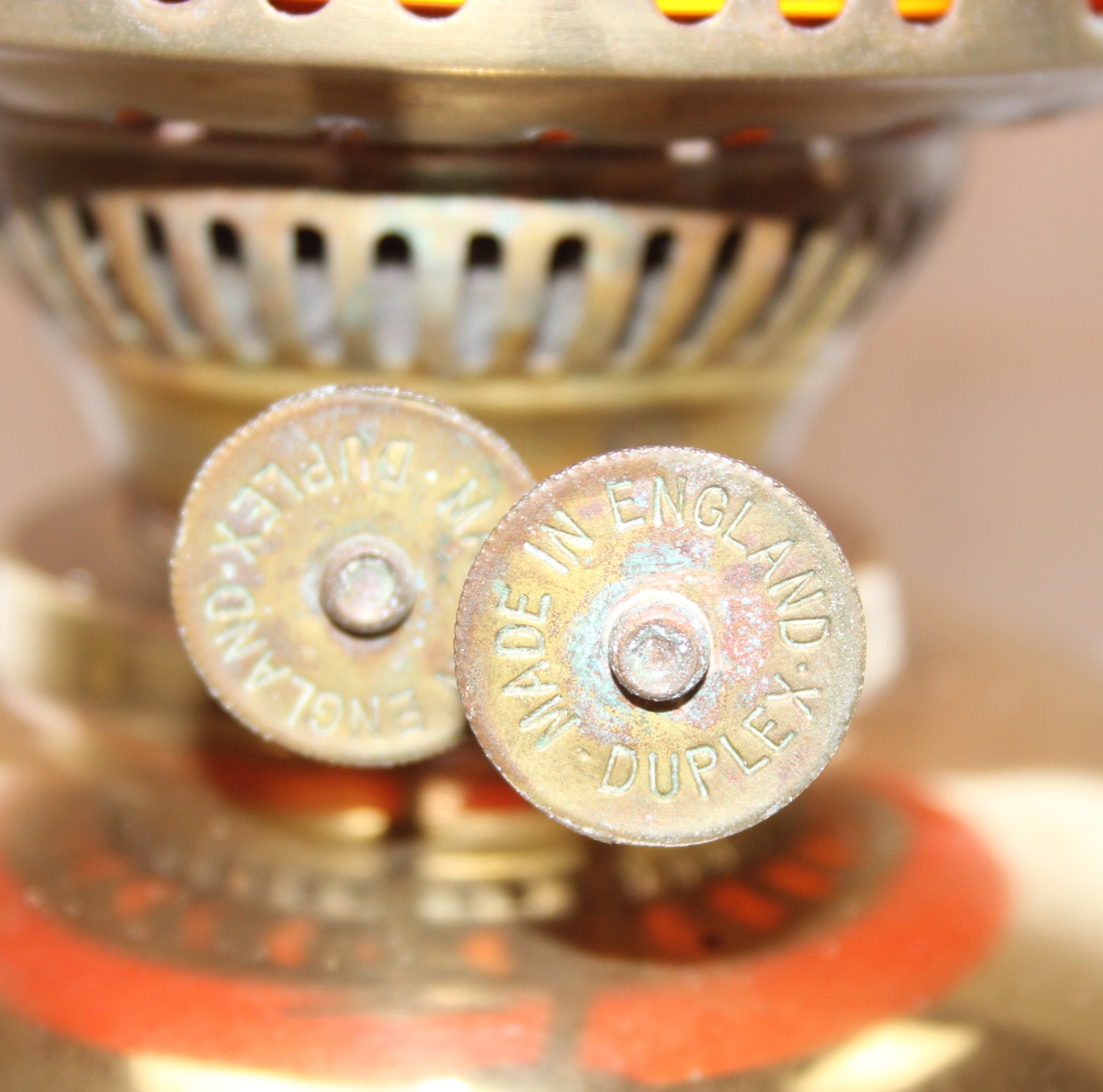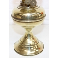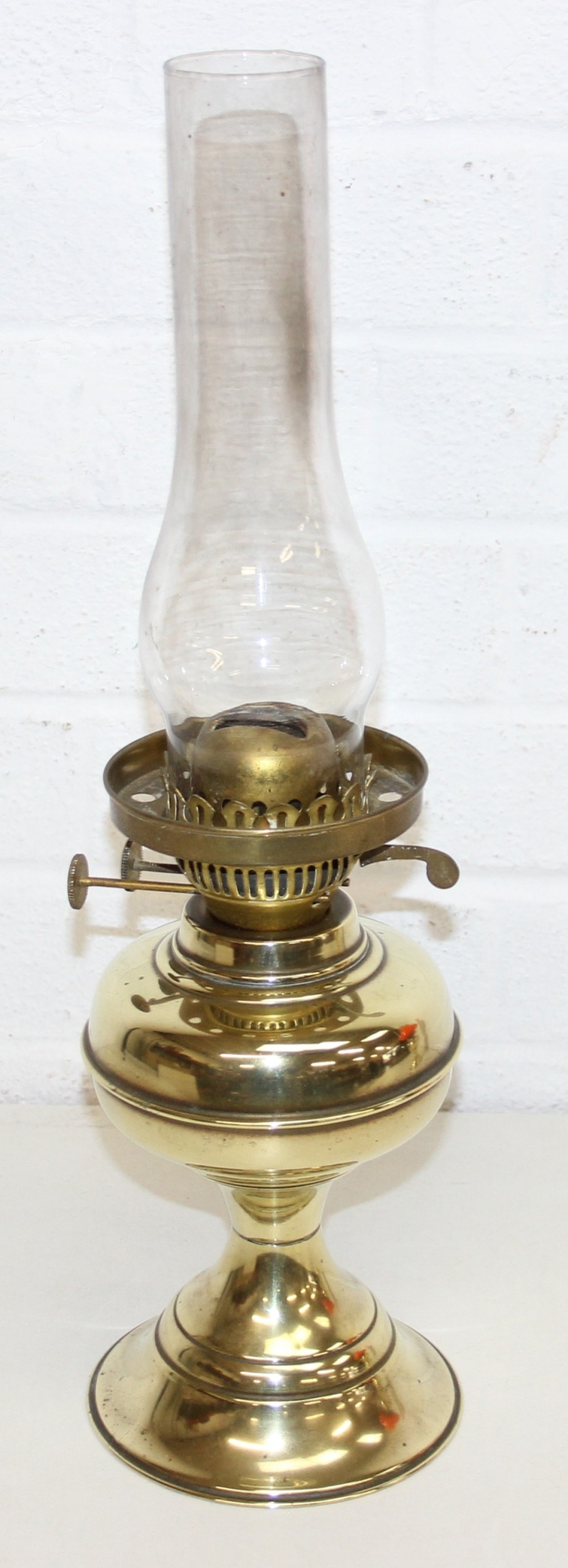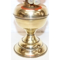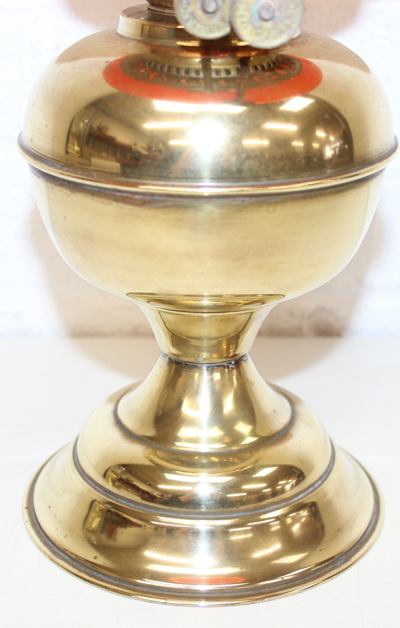 Pair of vintage brass oil lamps, one with orange glass shade, 47cm incl chimneys