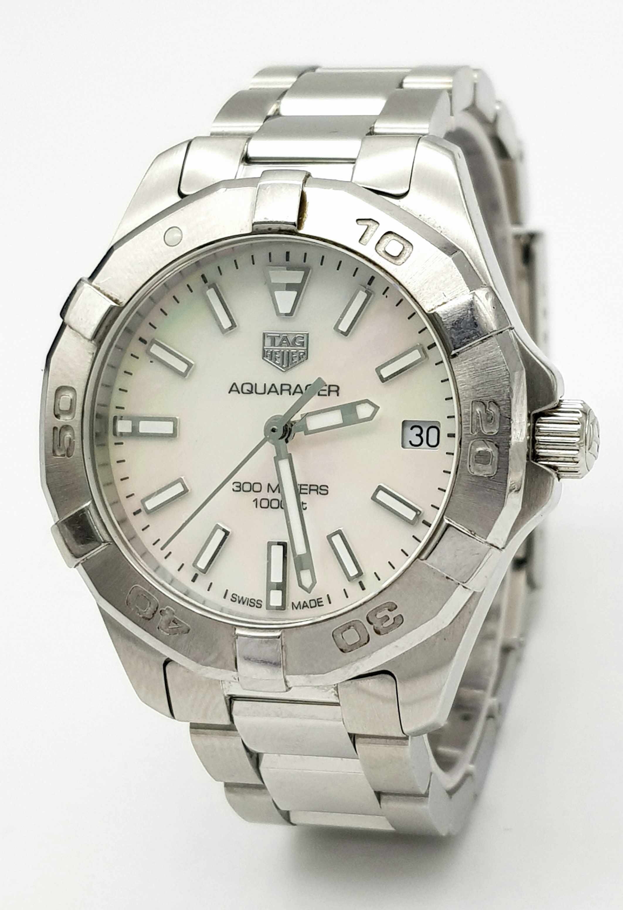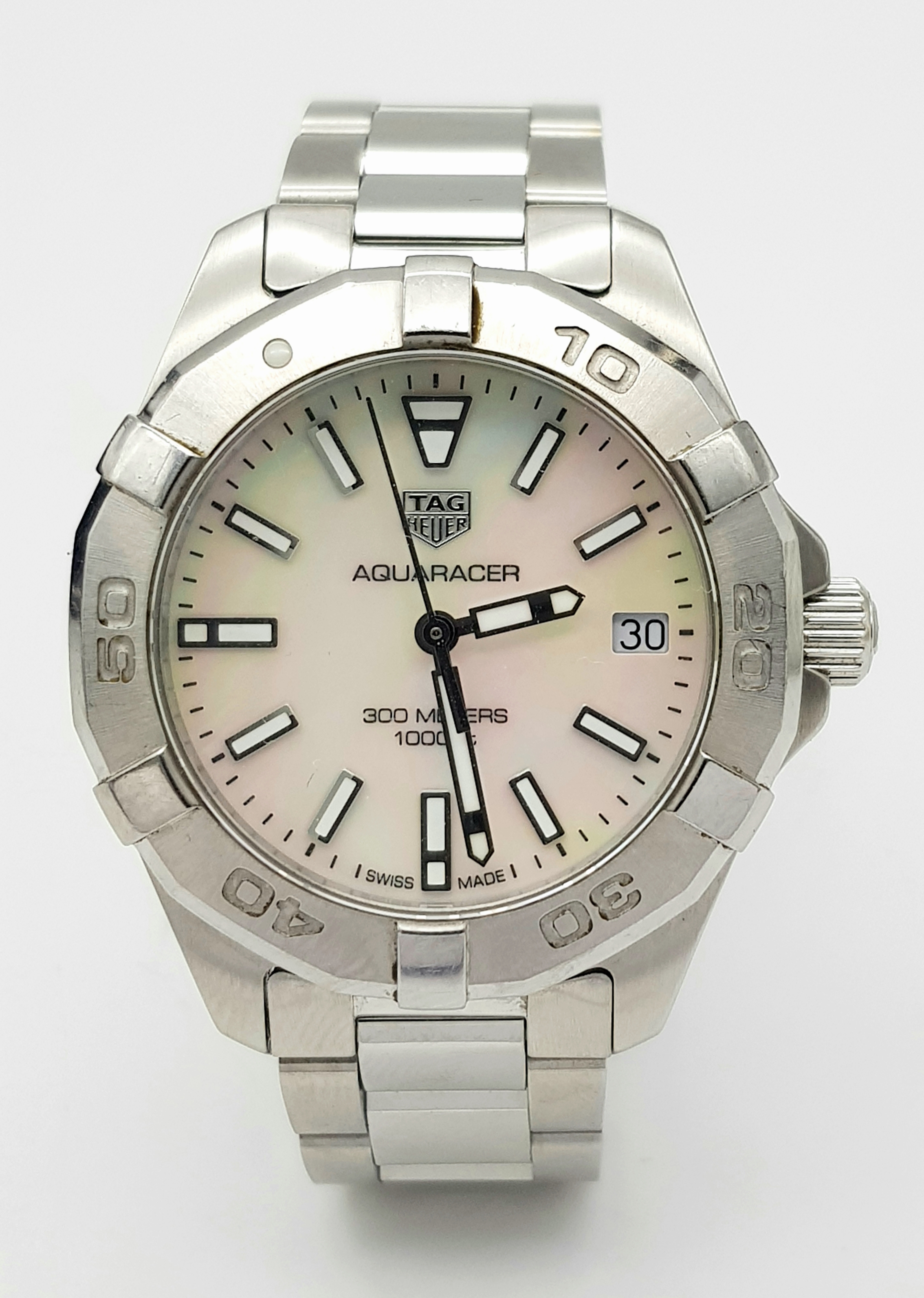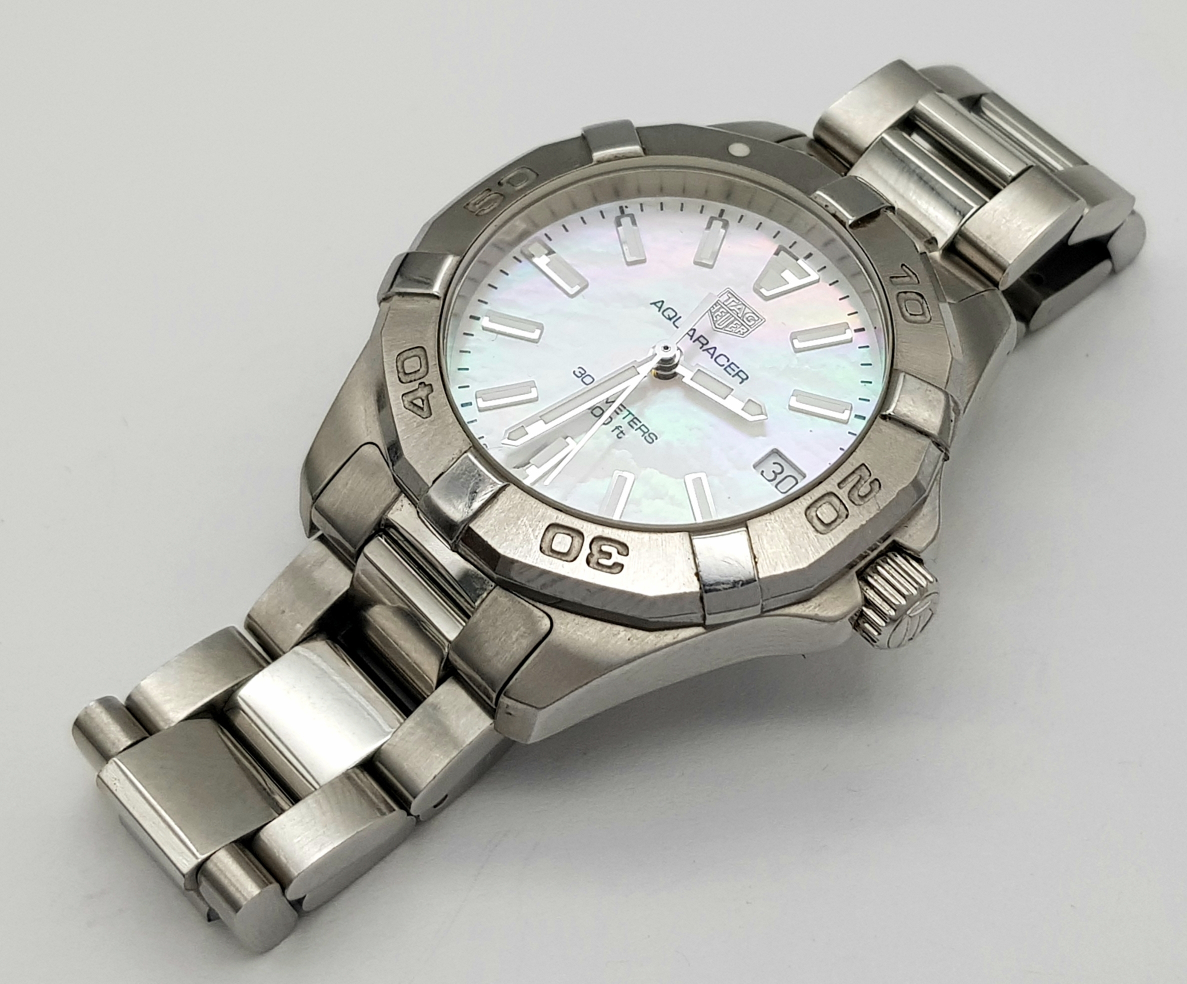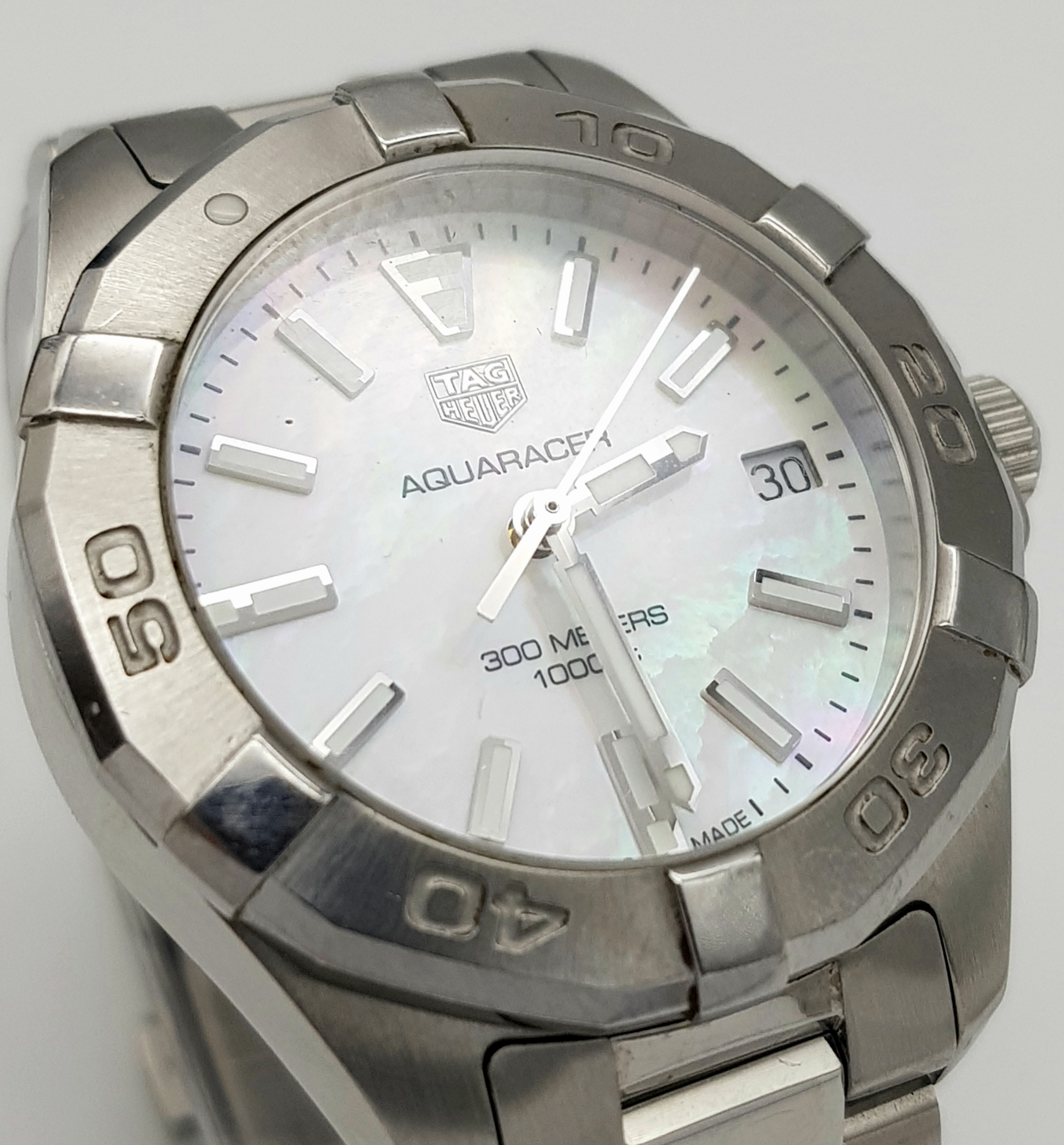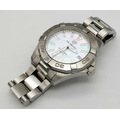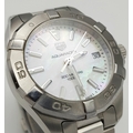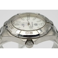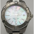 A Tag Heuer Aquaracer, 300 Meters Quartz Ladies Watch. Stainless steel bracelet and case - 34mm. Mother of pearl dial with date window. In very good condition and working order.