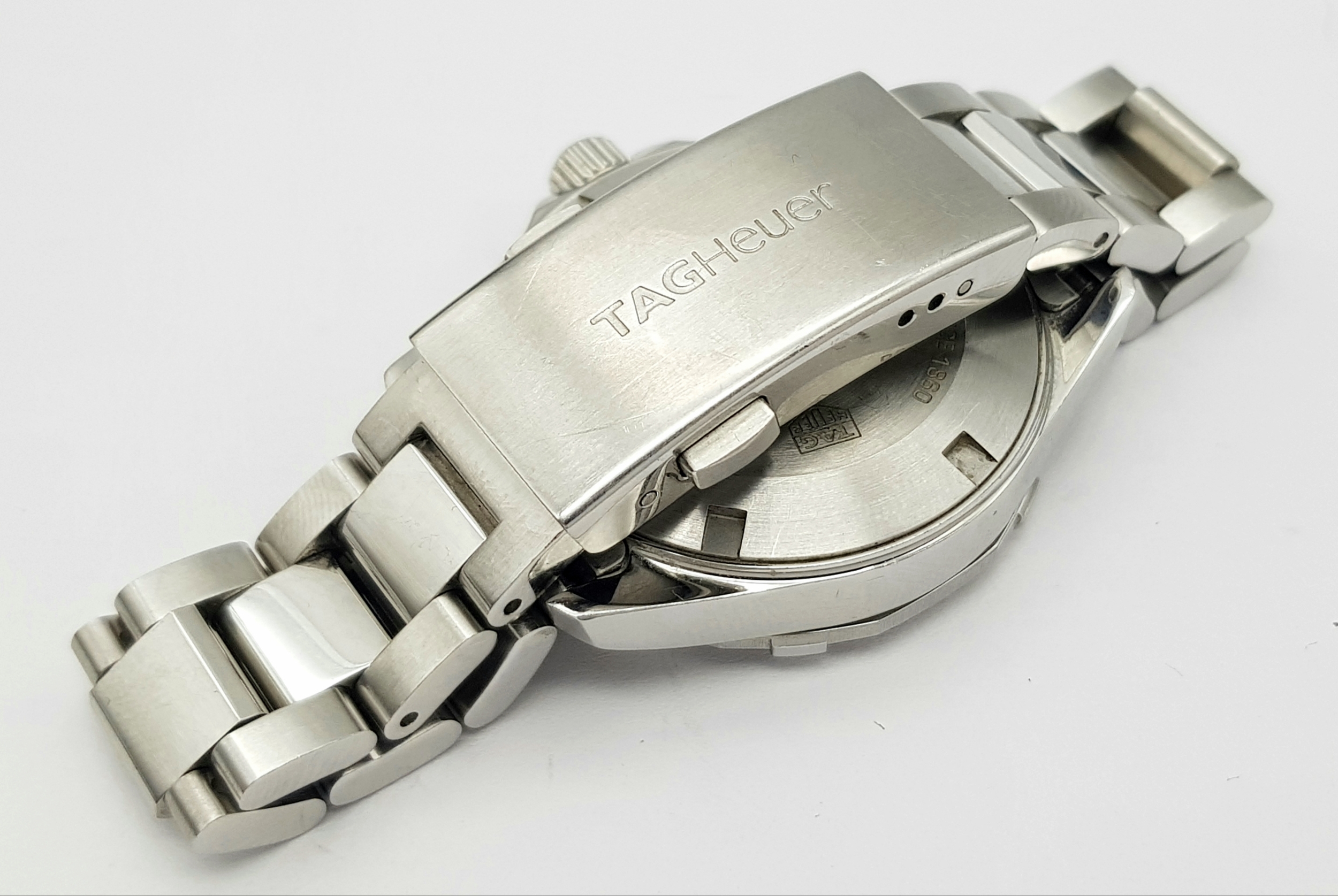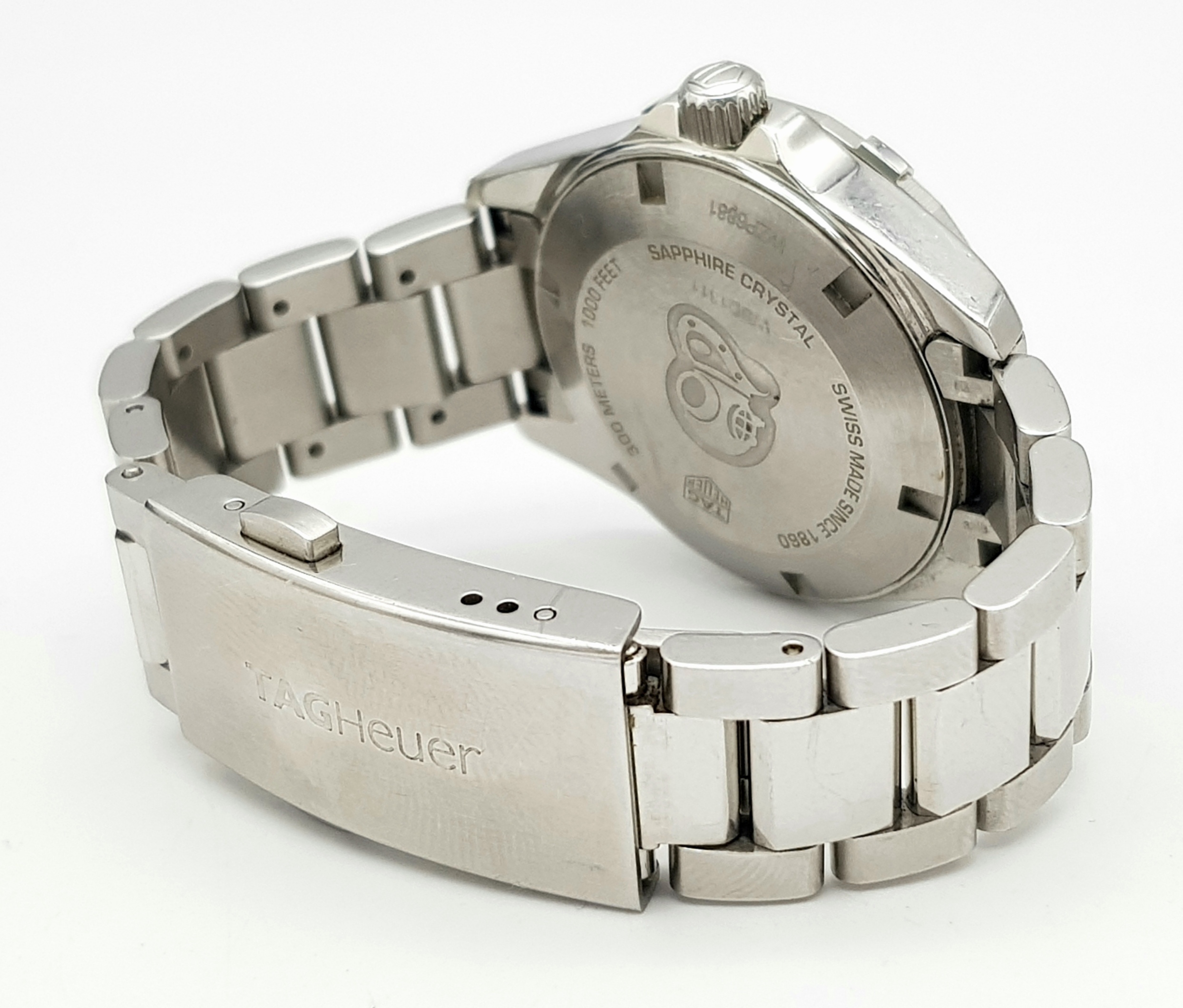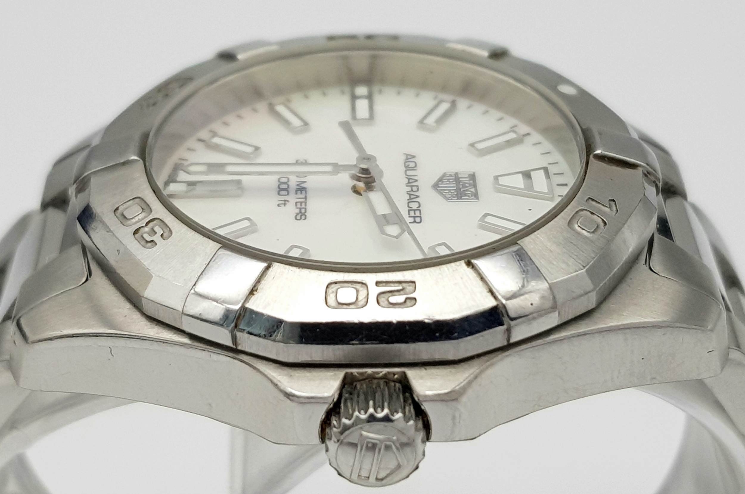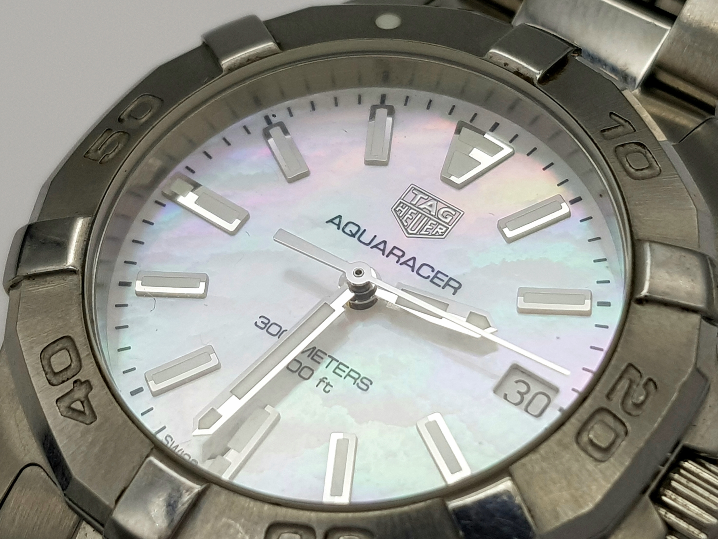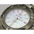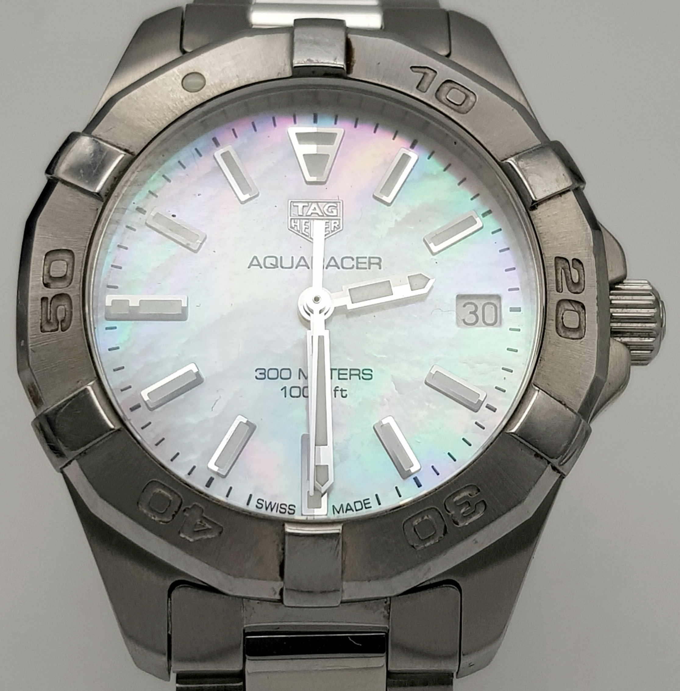 A Tag Heuer Aquaracer, 300 Meters Quartz Ladies Watch. Stainless steel bracelet and case - 34mm. Mother of pearl dial with date window. In very good condition and working order.