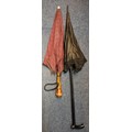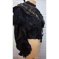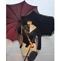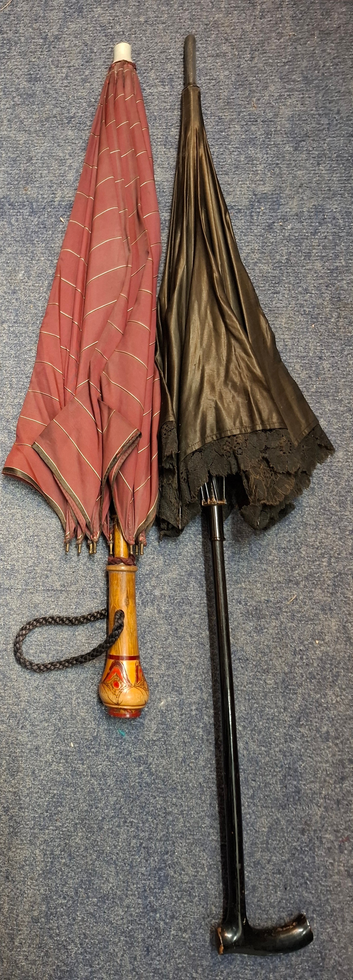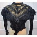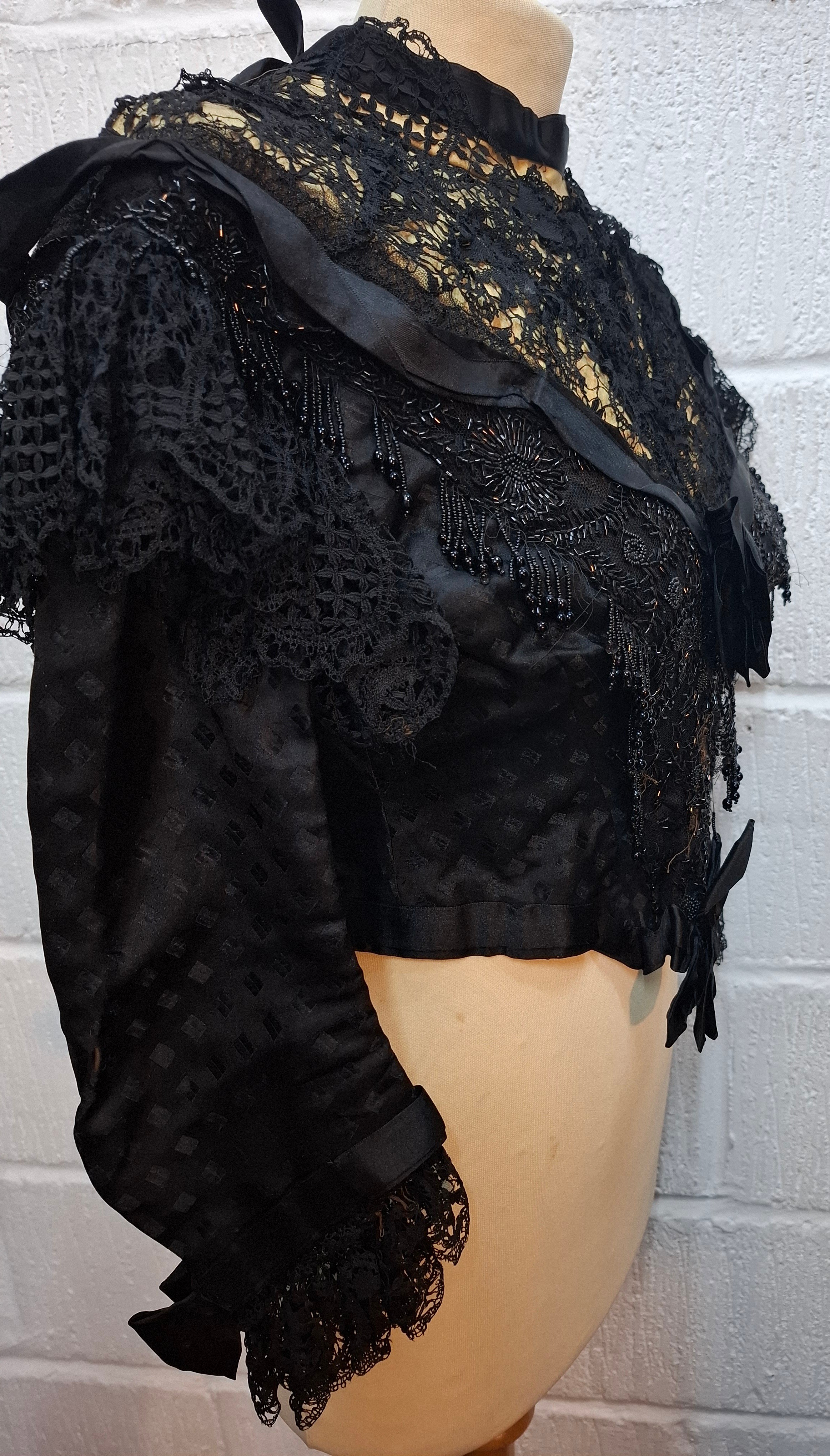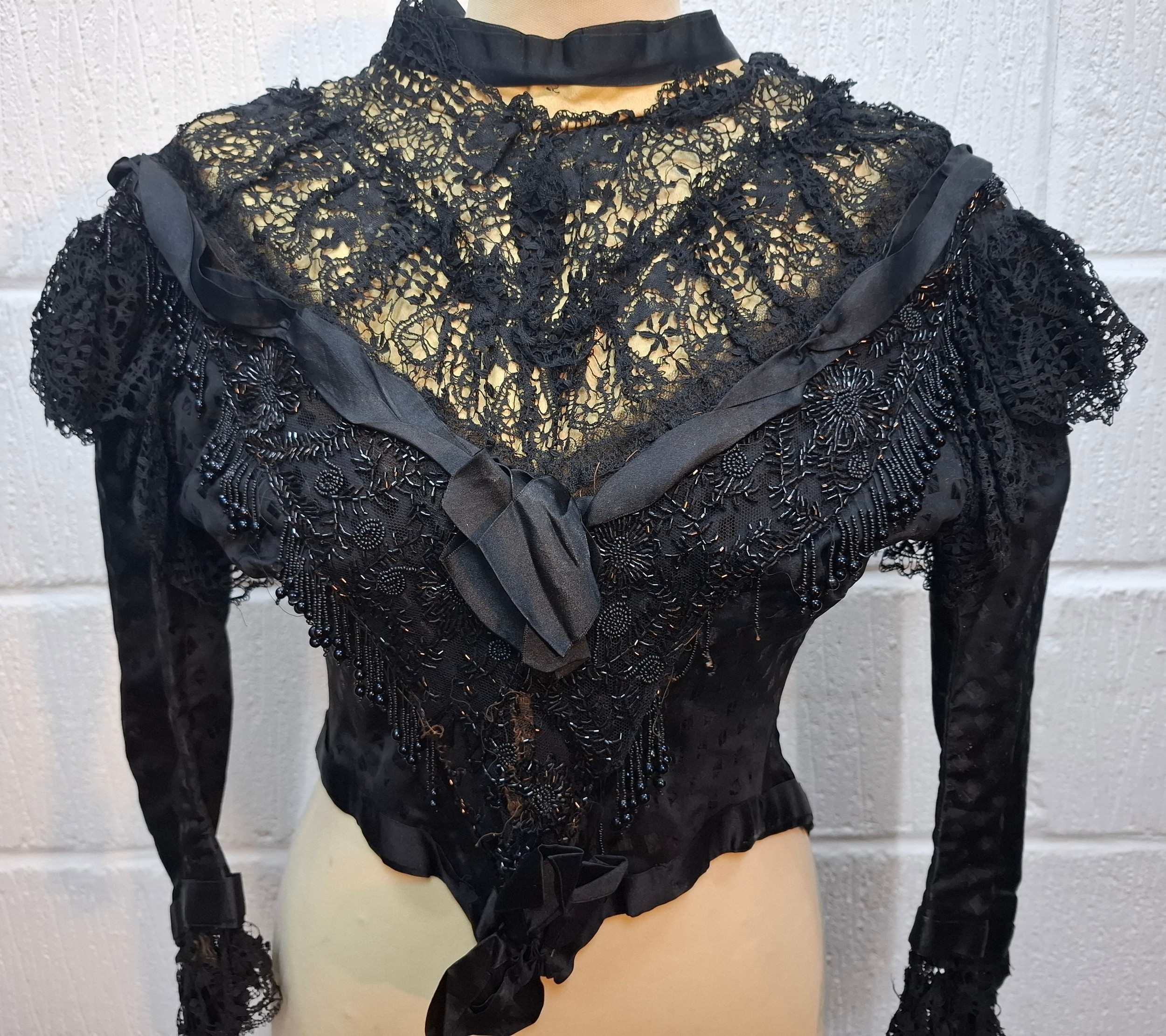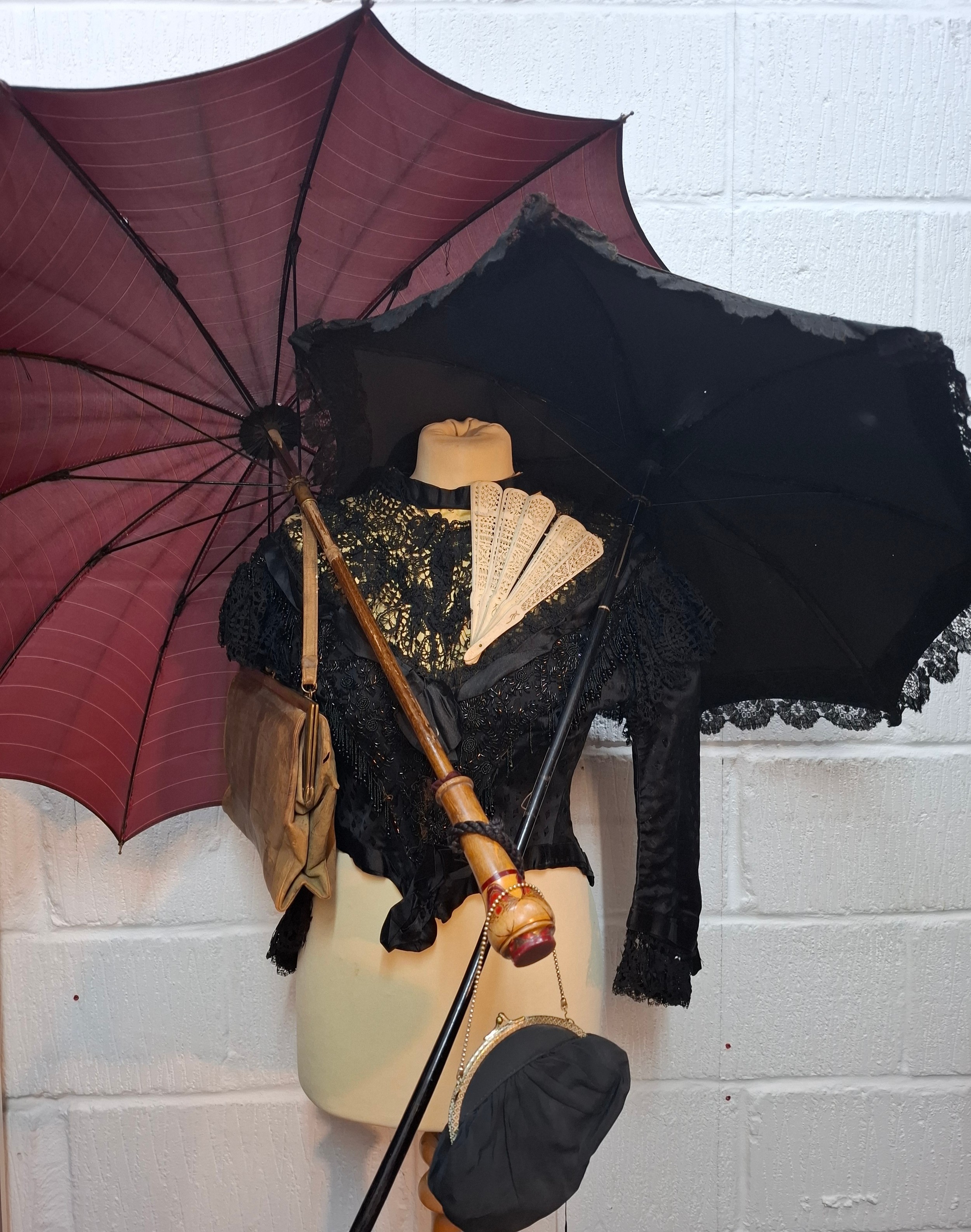A Victorian ladies mourning blouse A/F decorated with black lace, ribbons and beads together with 2 umbrellas to include a black Victorian silk example with lace trim, a vintage handbag, a vintage vanity set in a handbag, and a bone pierced fan A/F