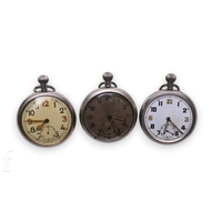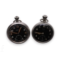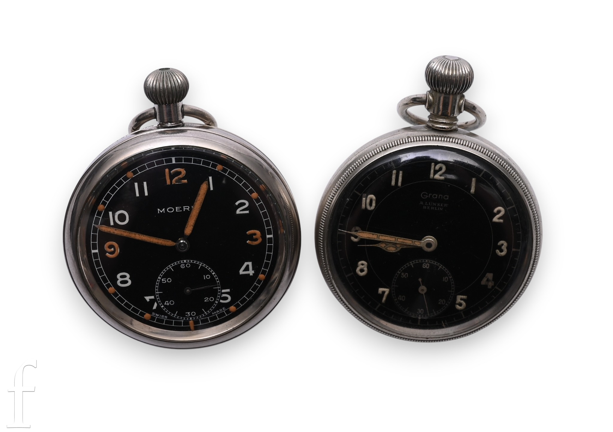 Two mid 20th Century military pocket watches, both with black dials, hourly Arabic numerals and seconds subsidiary dials, one by Grana, numbered to rear 1674, the other by Moeris, marked to face and movement, with crows foot to rear of case, largest diameter 52mm. (2)