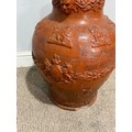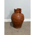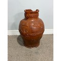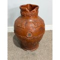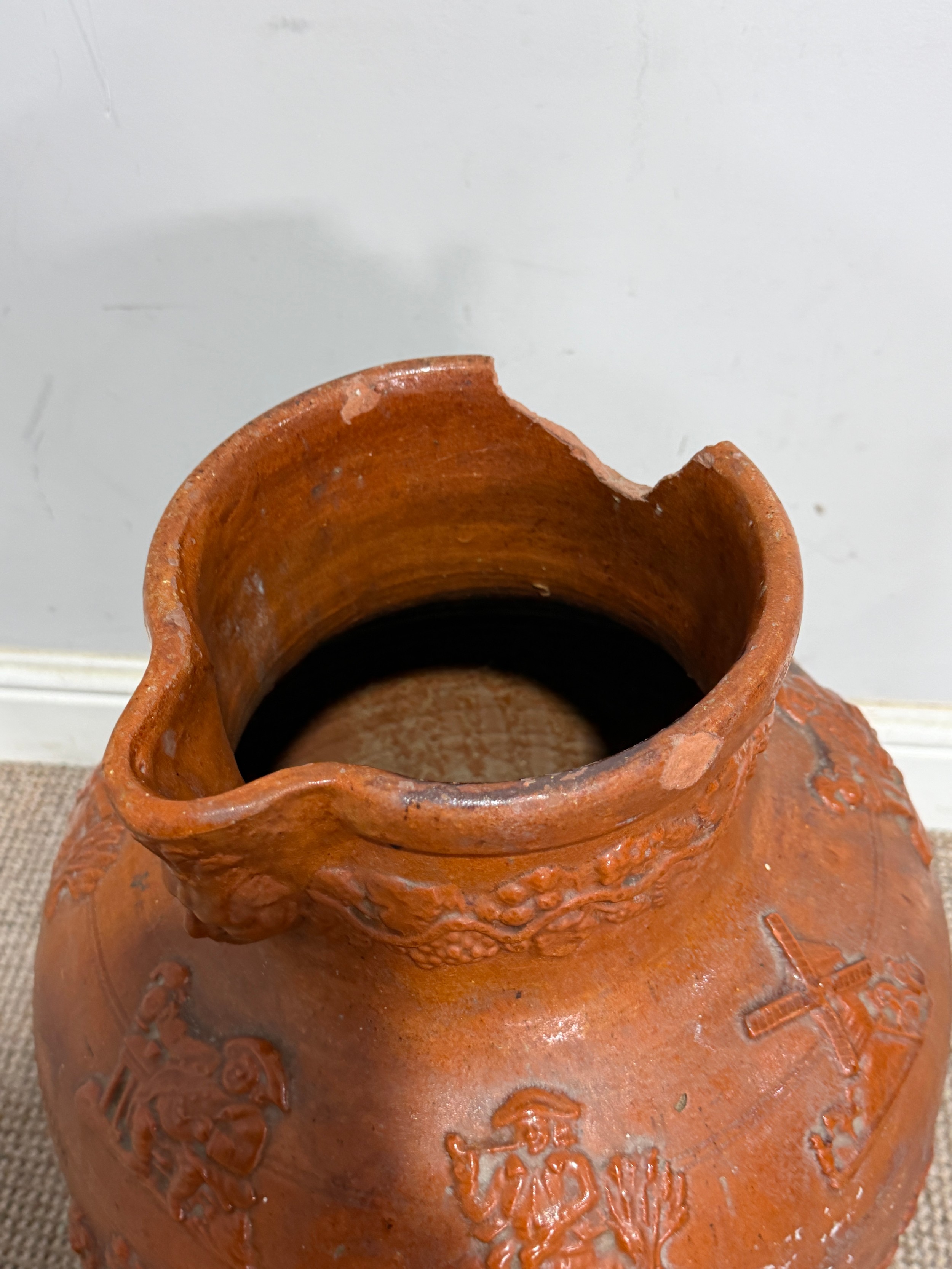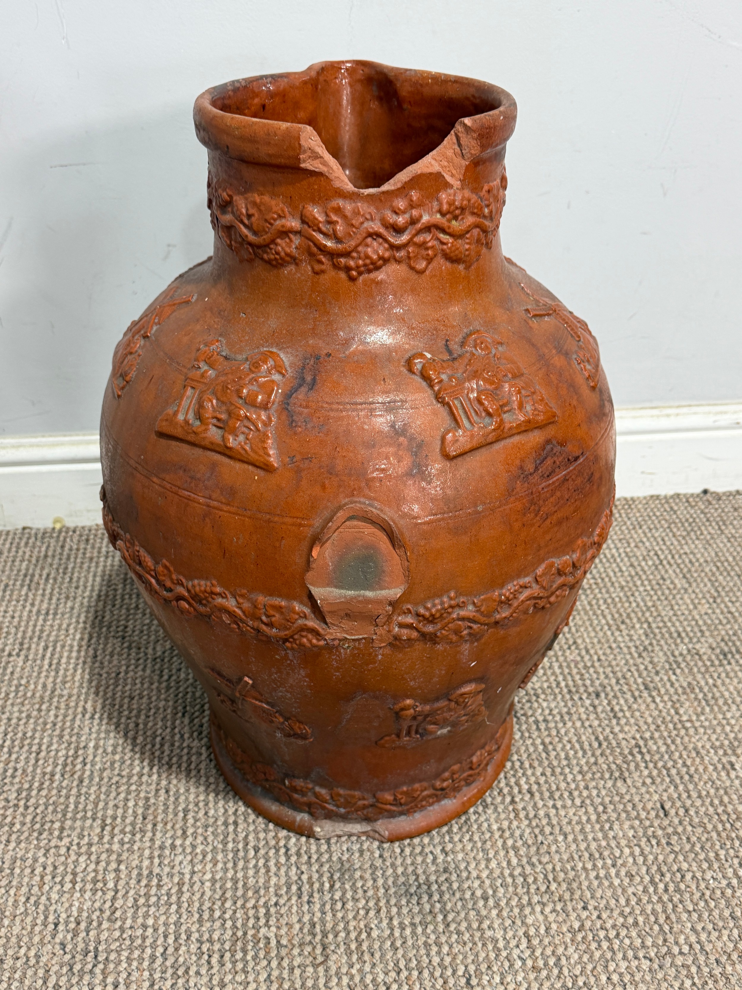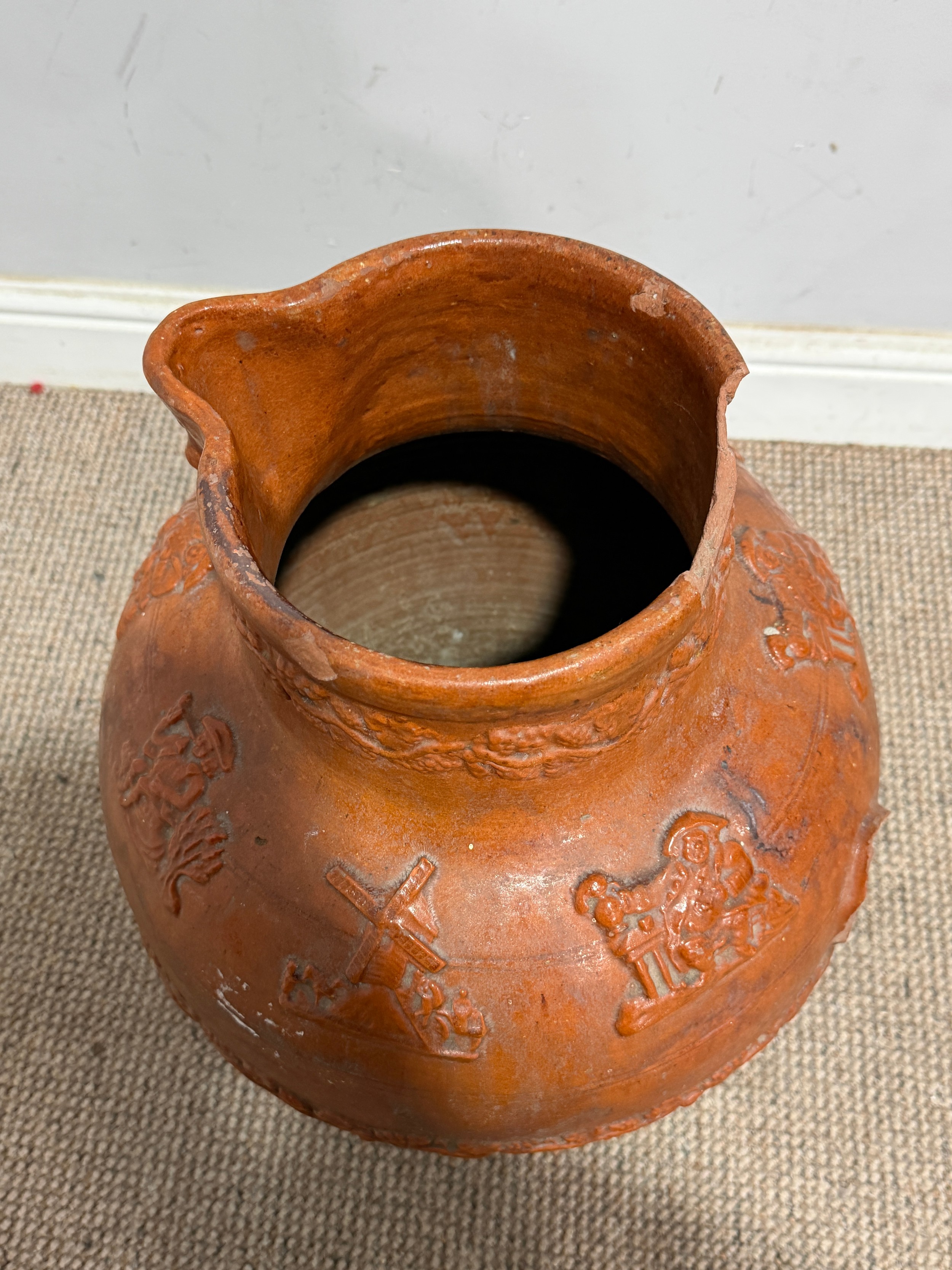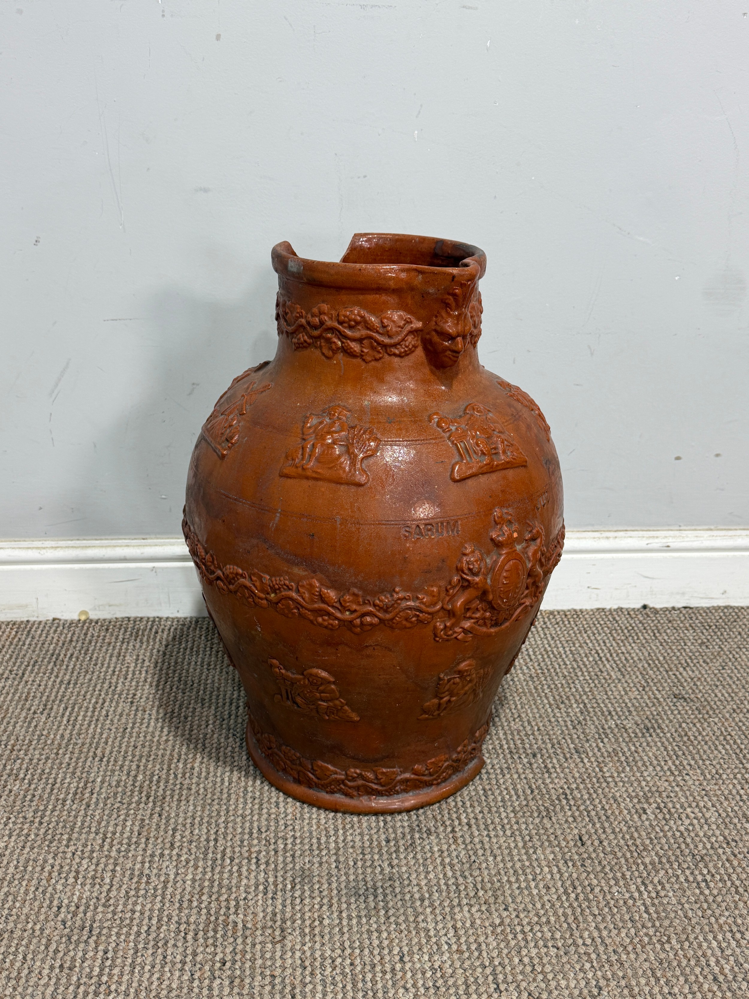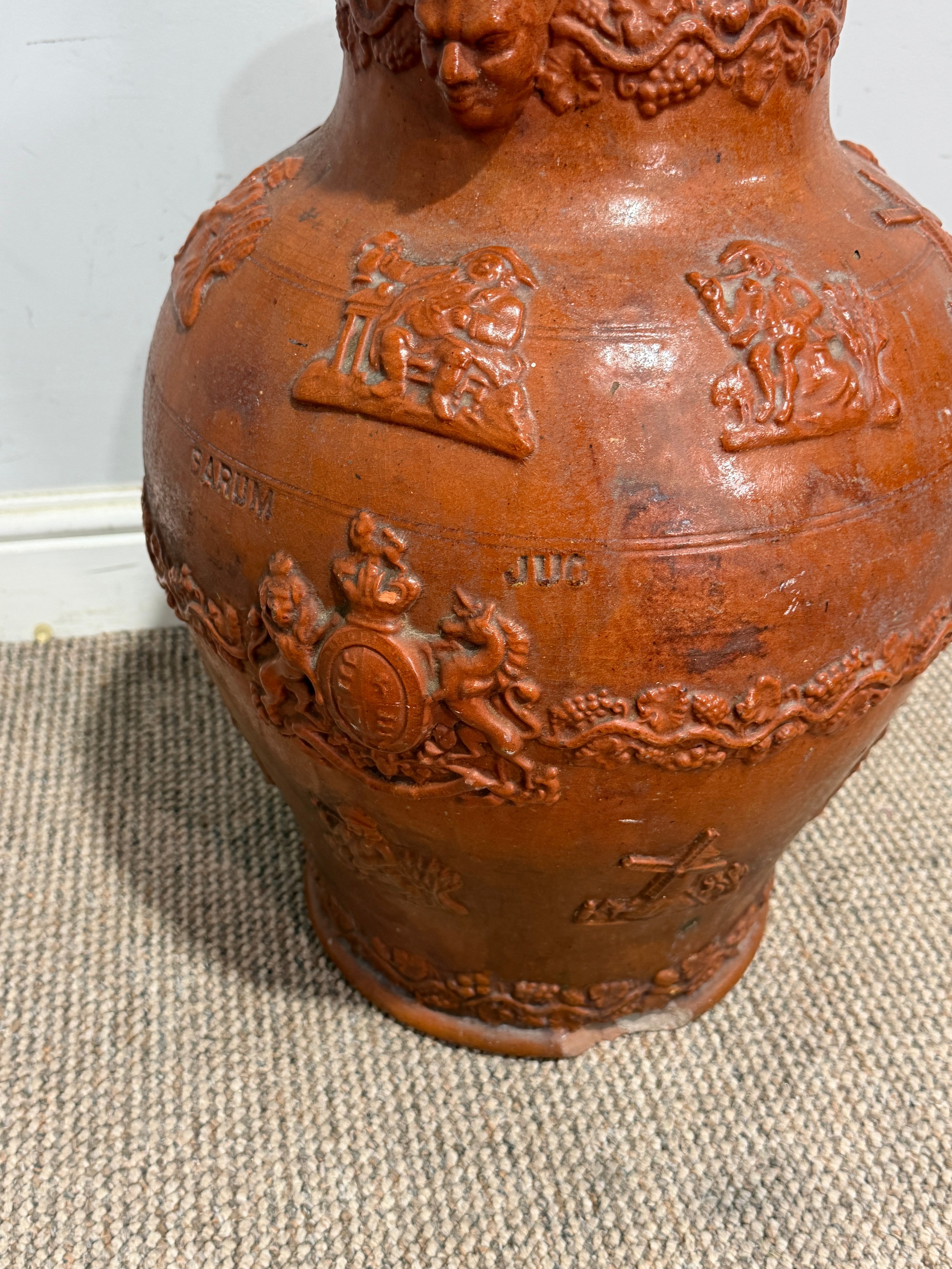 A large stoneware salt glazed hunting Jug, inscribed 'Sarum Jug', celebrating Queen Victoria's Golden Jubilee, H 55 cm, note, losses of handle and damages to base and rim, please see images.