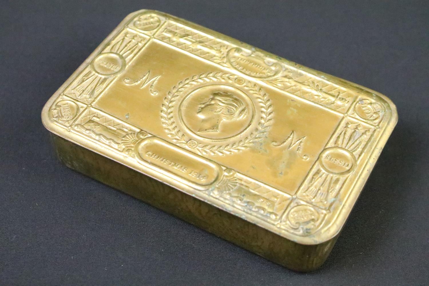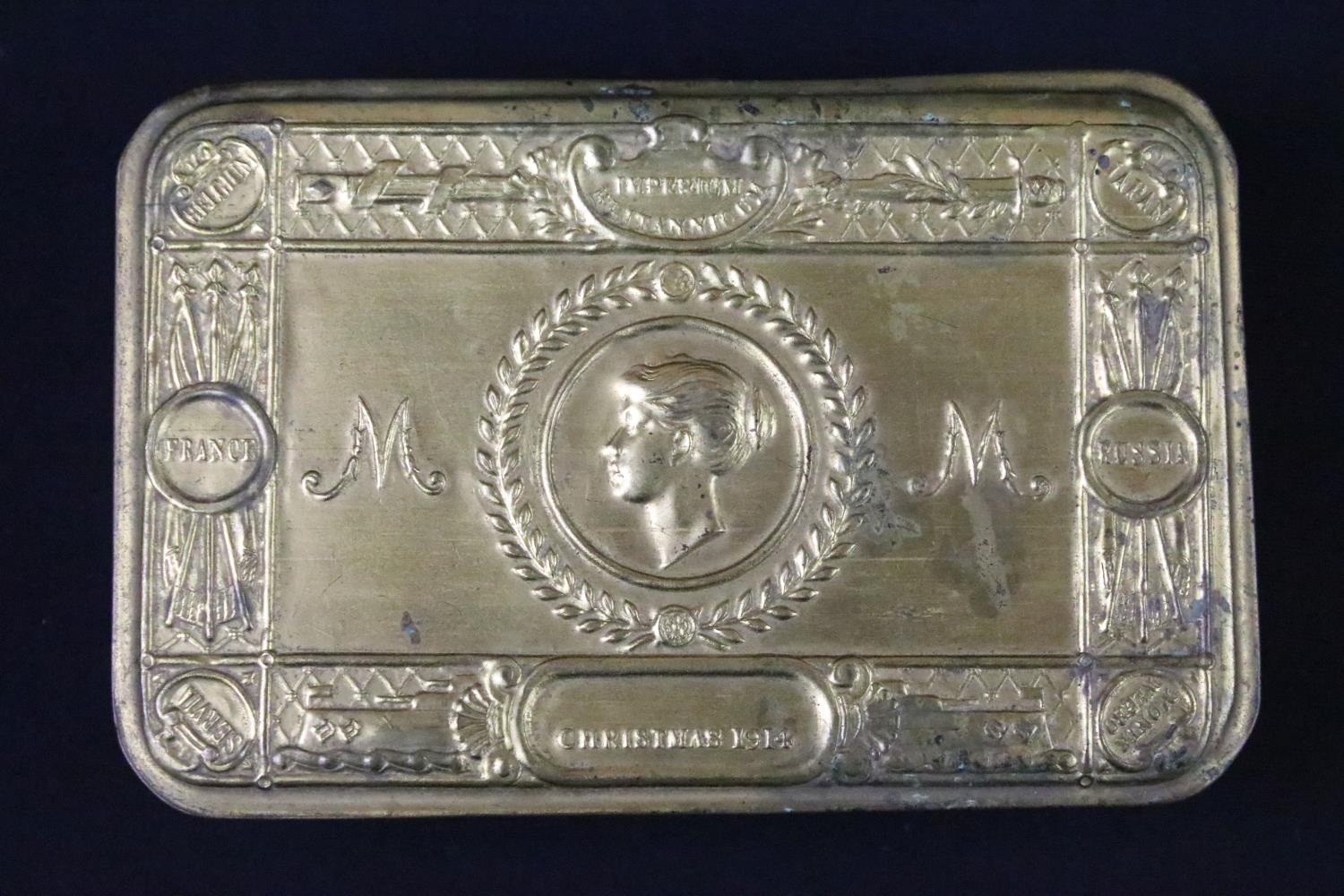 A British World War One Christmas 1914 Princess Mary brass gift tin.