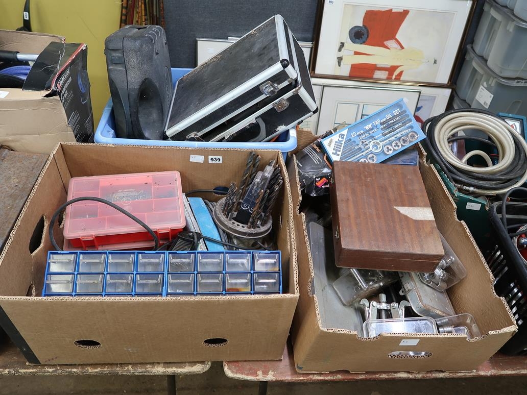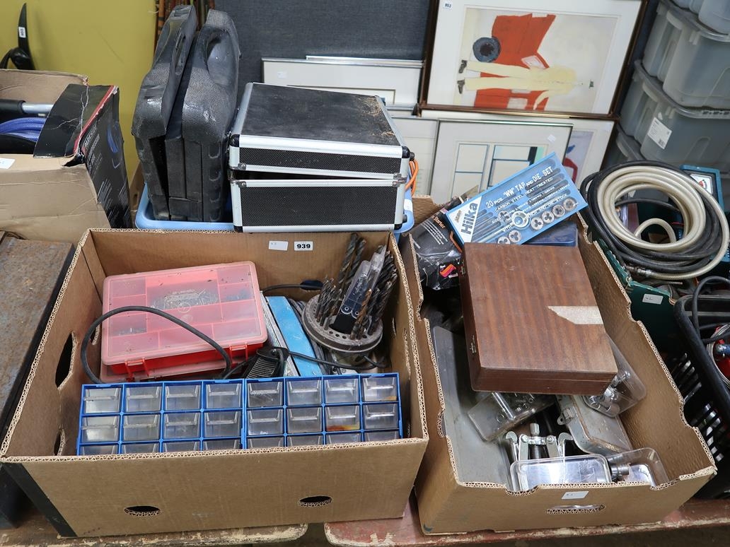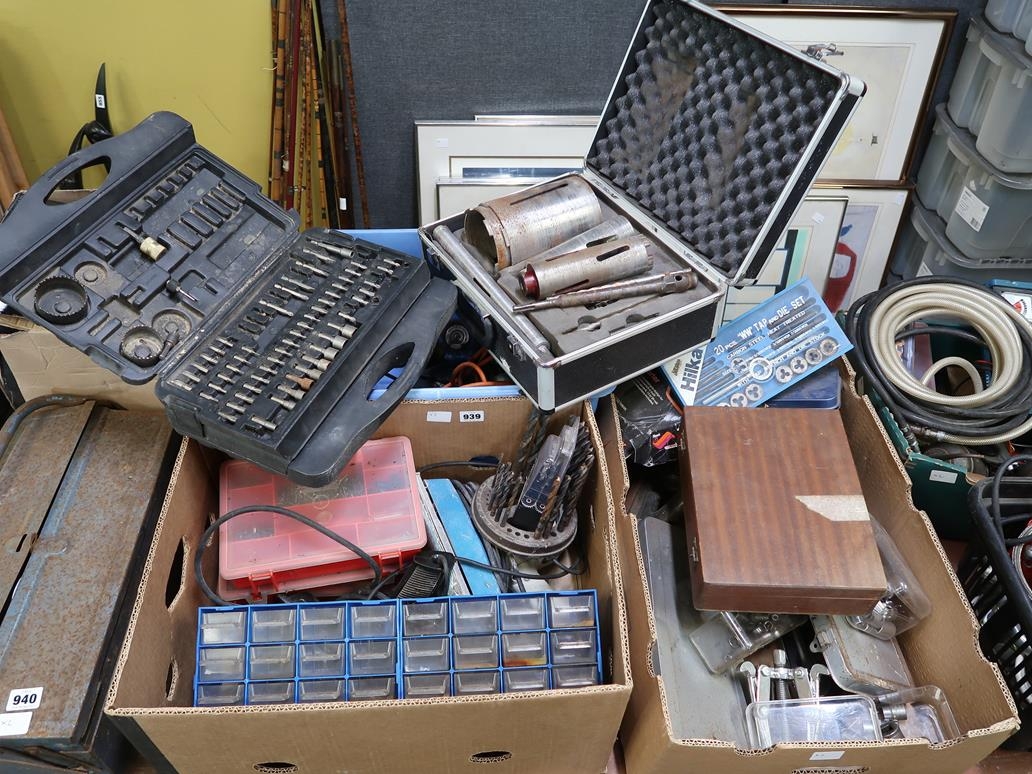THREE BOXES OF HAND TOOLS, DRILL BITS, ETC