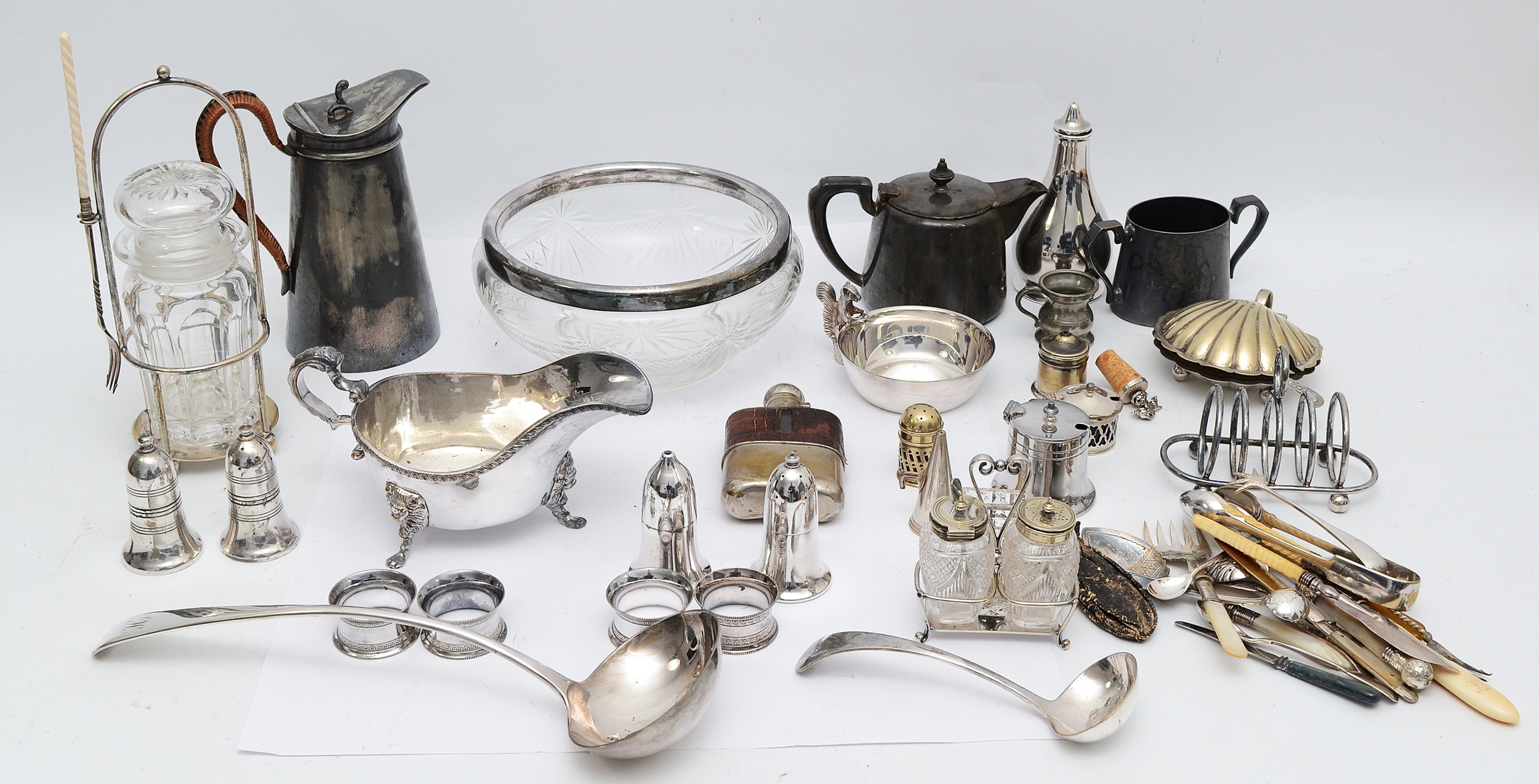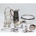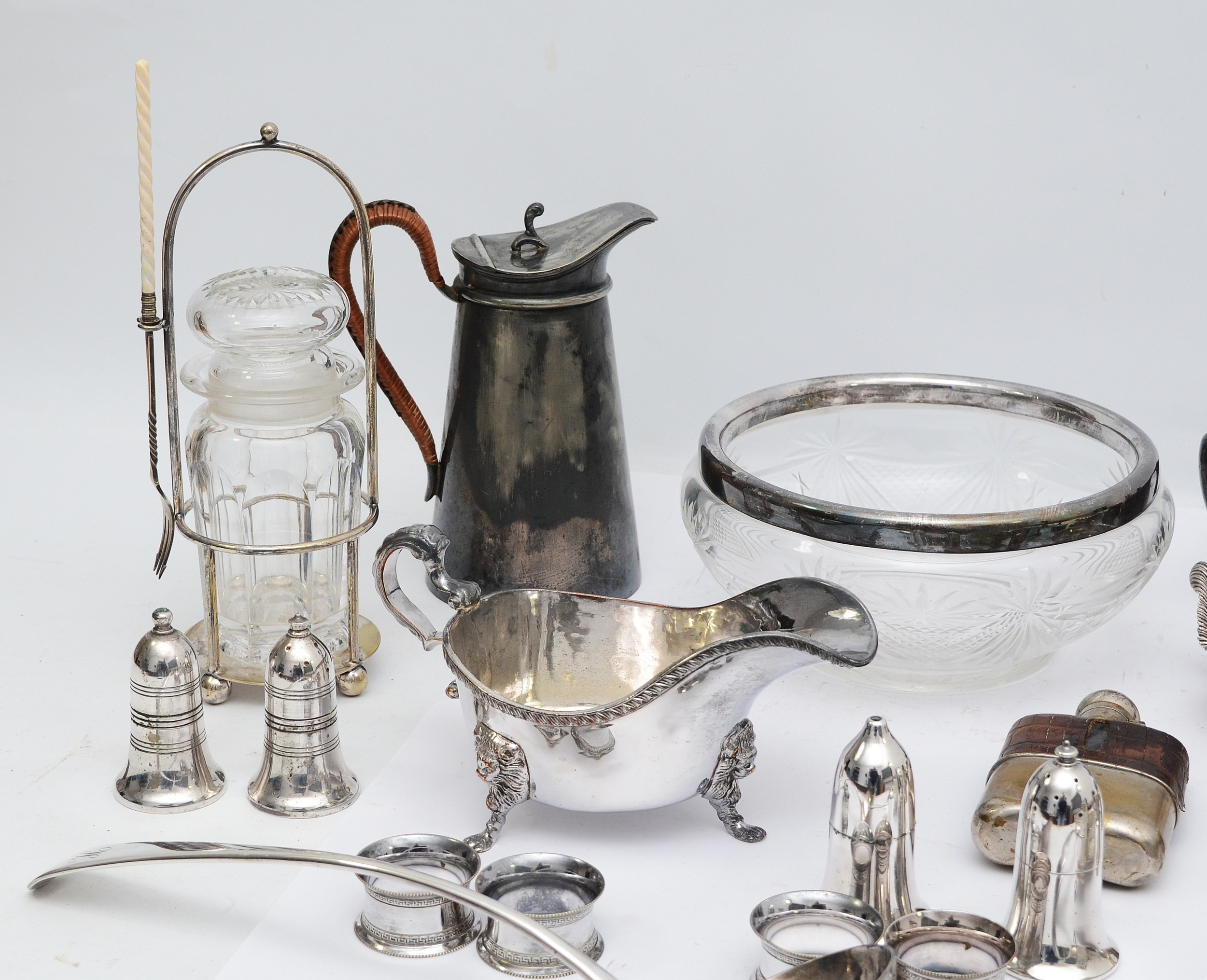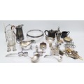 A large quantity of silver plated wares to include, a plated ewer, having wicker handle, a plated gravy jug, with three ball and claw feet, a cut glass bowl with plated collar, and a glass pickle jar having a plated holder and pickle fork attached, together with various other plated wares. (1 box)