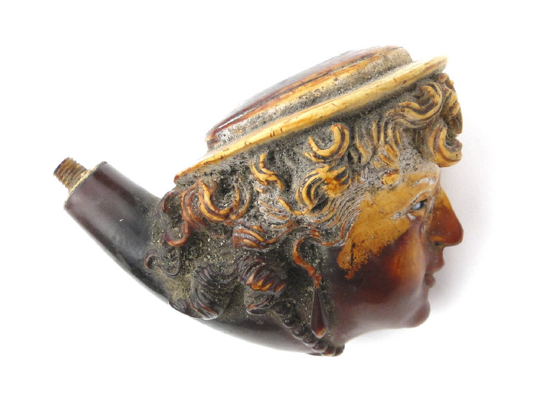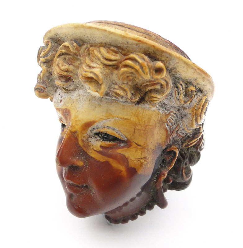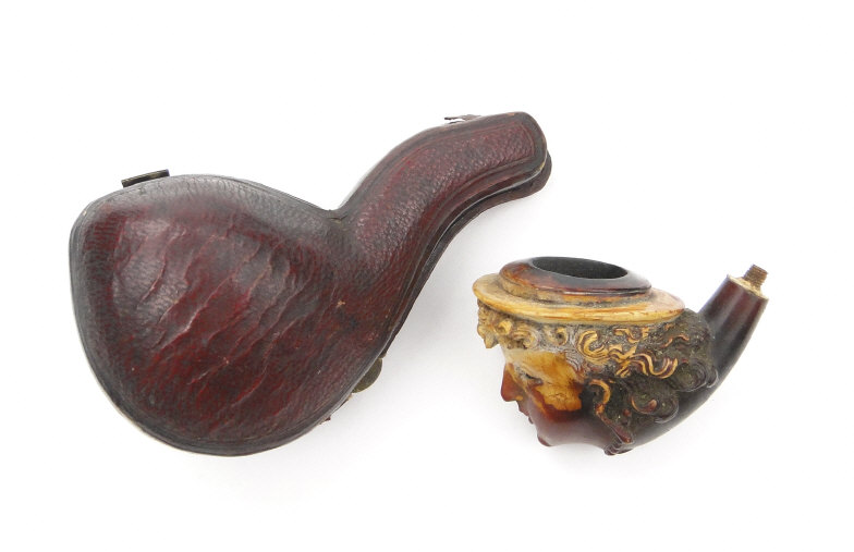 Meerschaum pipe, the bowl carved with a female's face and housed in a leather case, the bowl 5cm in length