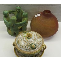 WICKER BASKET AND TWO ANIMAL DOORSTOPS