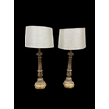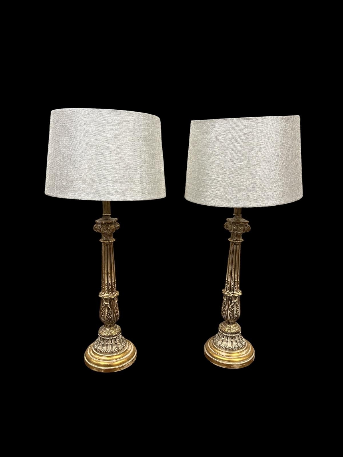A PAIR OF CONTINENTAL GILT METAL TABLE LAMPS each with a reeded and foliate column with scroll capitals raised on a circular spreading foot with shades 75cm (h)