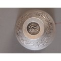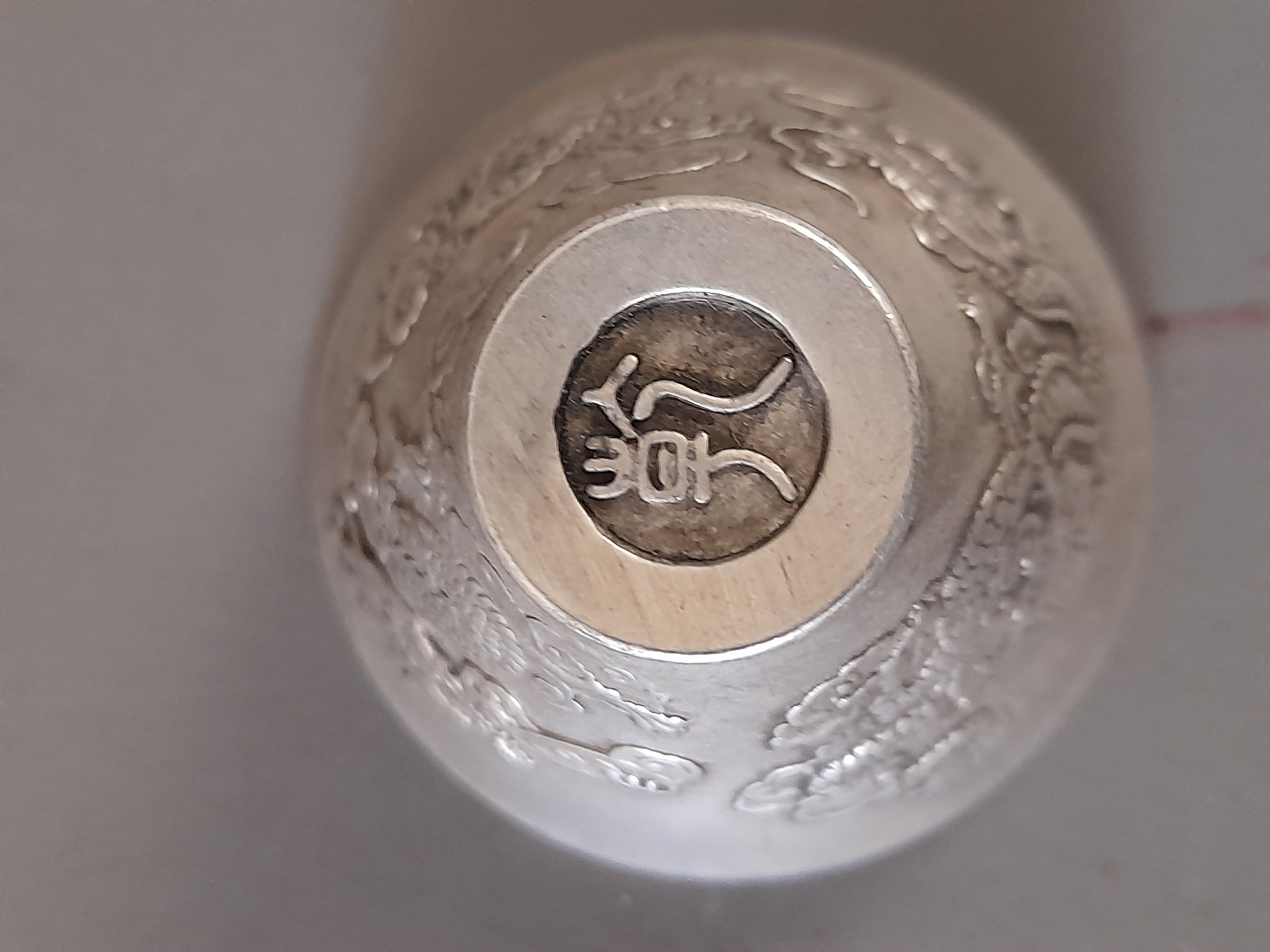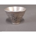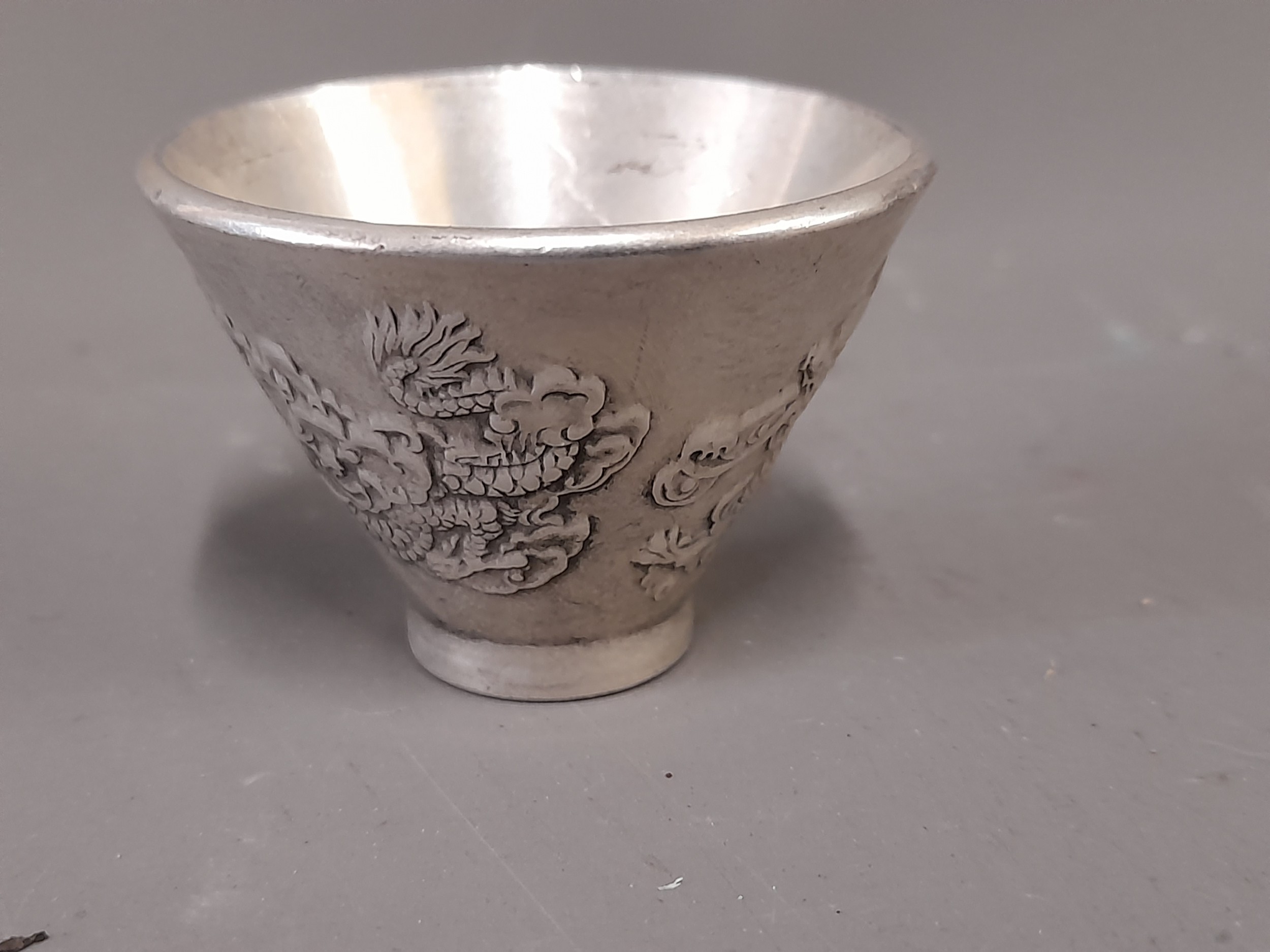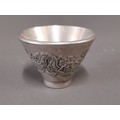 Oriental White Metal Drinking Vessel with ornate Dragons to side and Mark to Base, 3.5cm high x 5cm wide