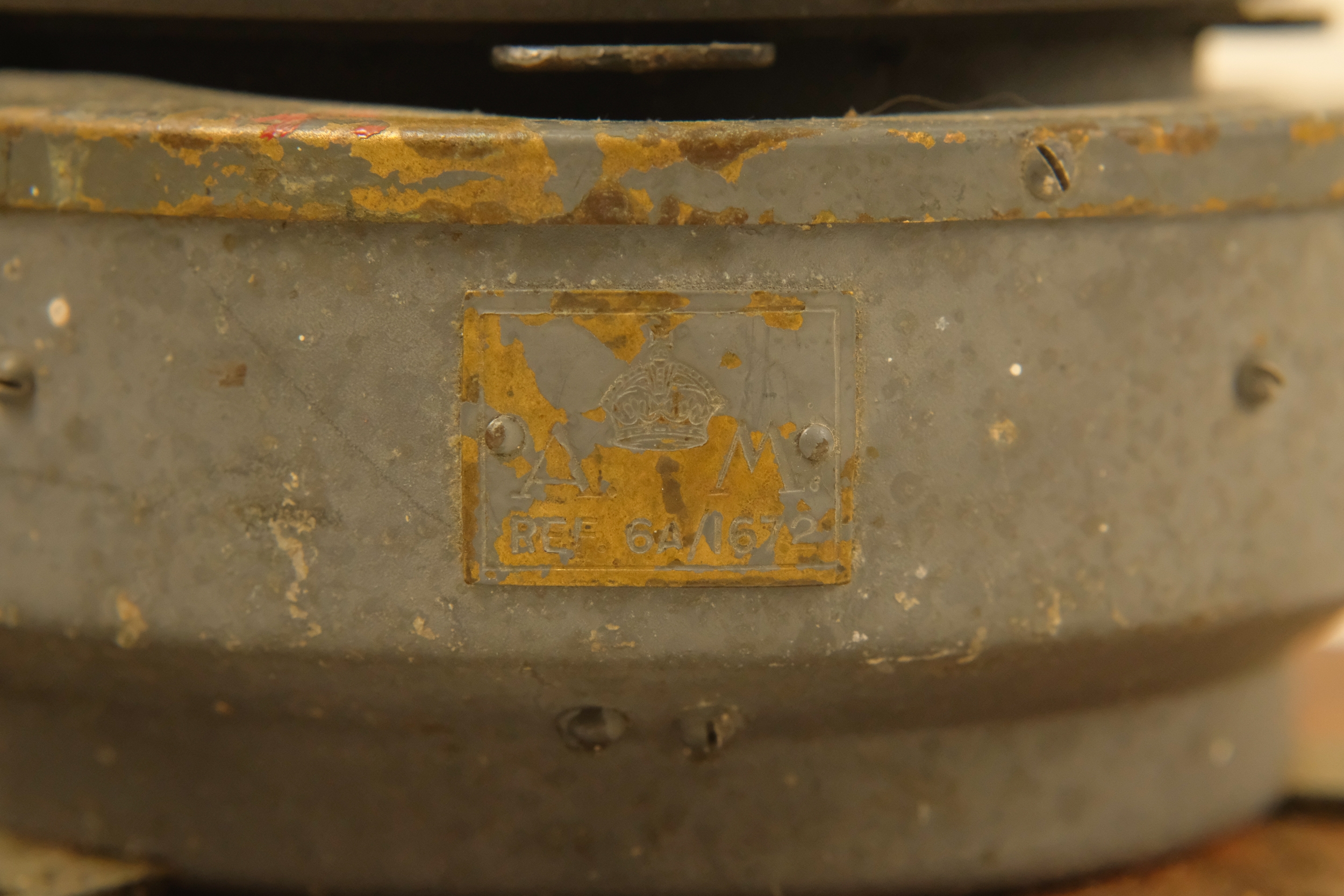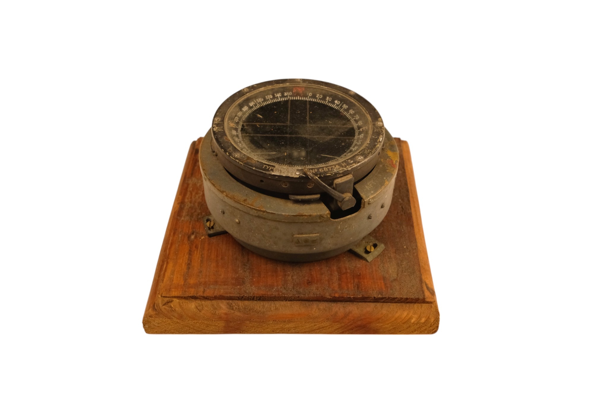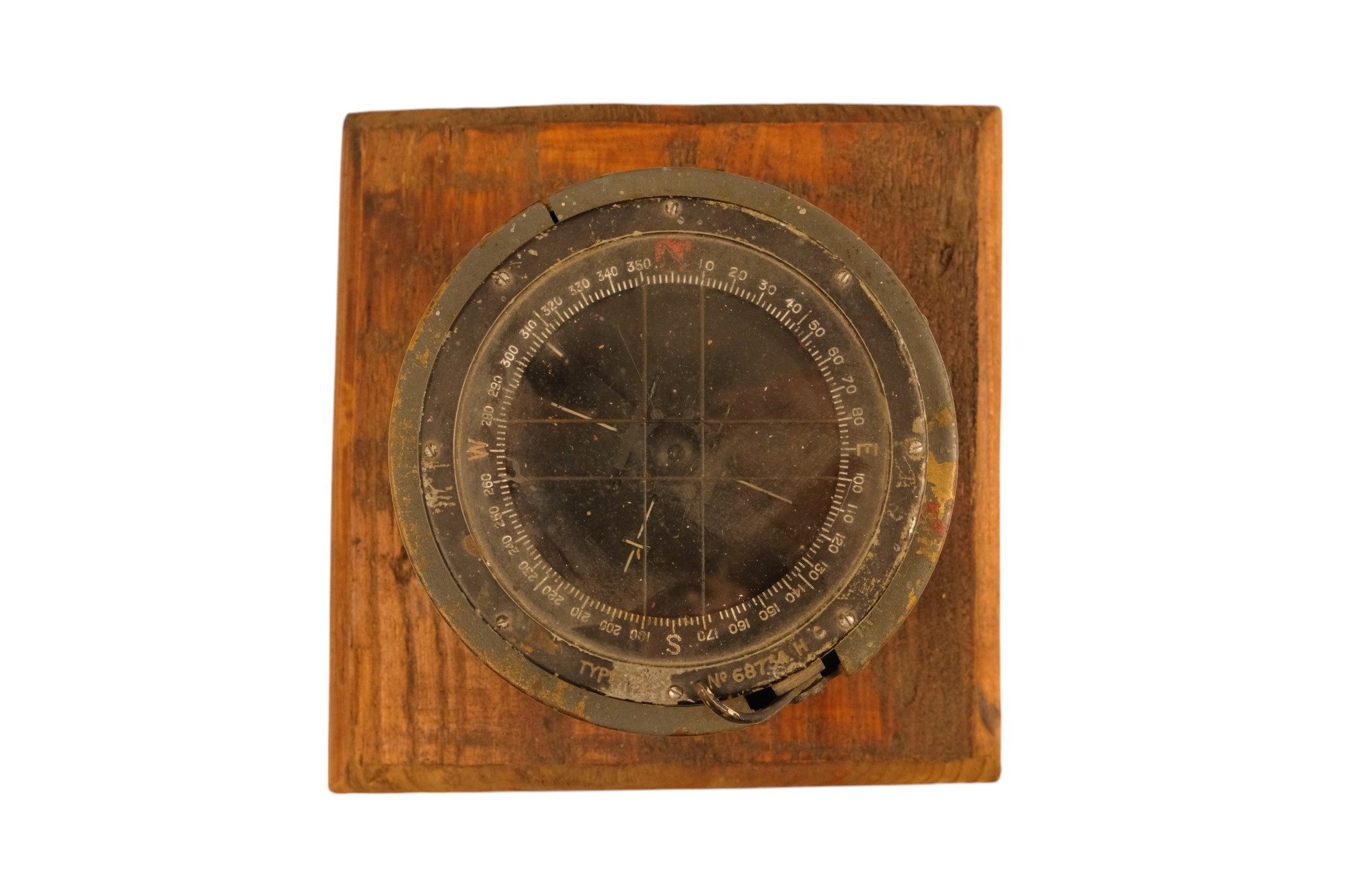 An Air Ministry WWII P type compass - mounted on a later pine base, 15cm diameter.