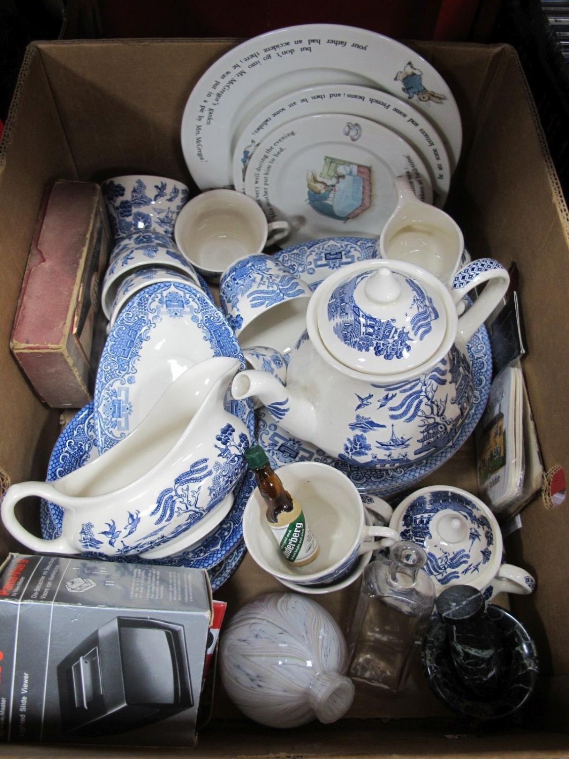 Wedgwood Peter Rabbit Plates, Old Willow pottery, mortar and pestle, etc:- One Box
