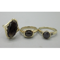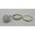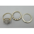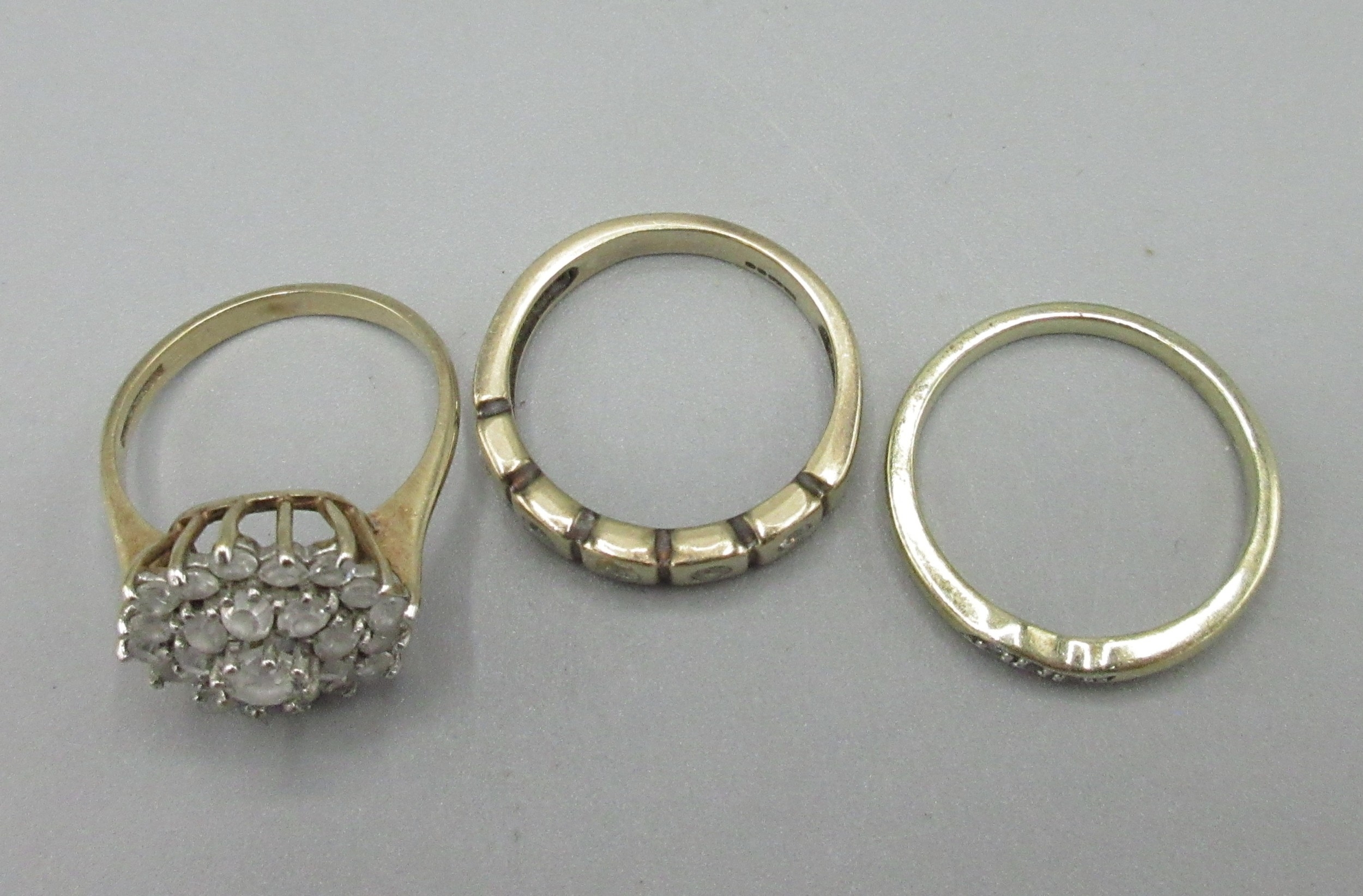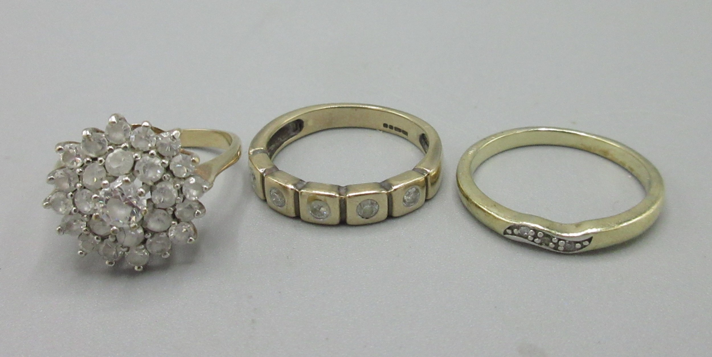 9ct yellow gold half eternity ring set with diamonds, stamped 375, size N1/2, 9ct yellow gold cluster cocktail ring set with clear stones, stamped 375, size M, gilt silver ring set with diamond chips, stamped 925, size N1/2, gold weight 5.9g
