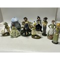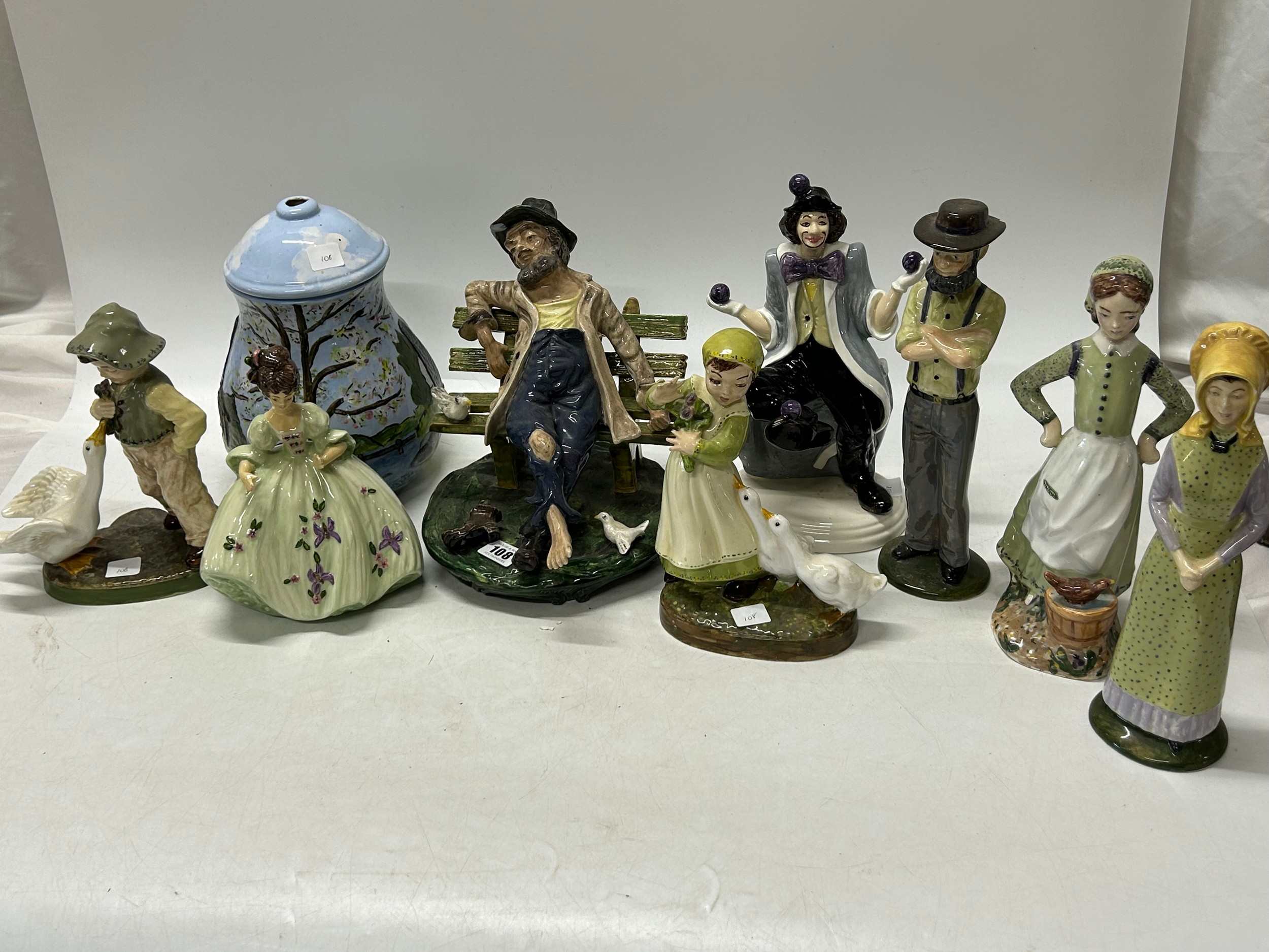 A selection of decorative figures including a girl with geese, a tramp on a bench, Doulton style figures, a jar and cover, blue glazed decorated with a cottage etc..
