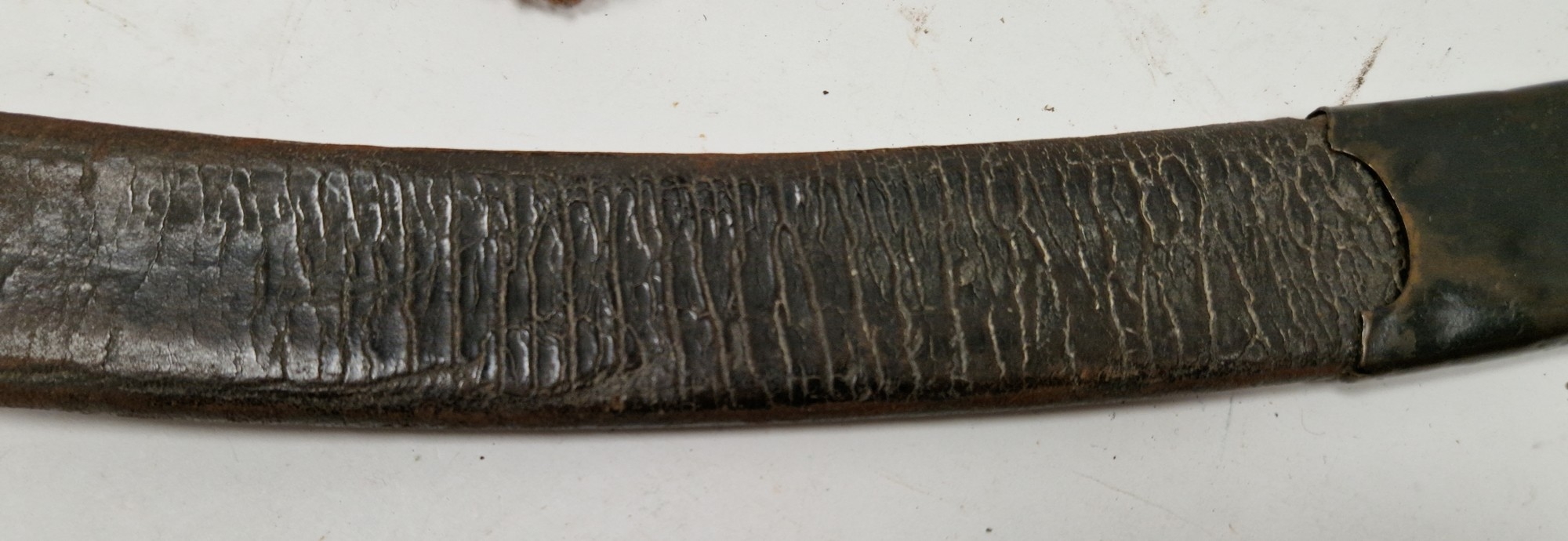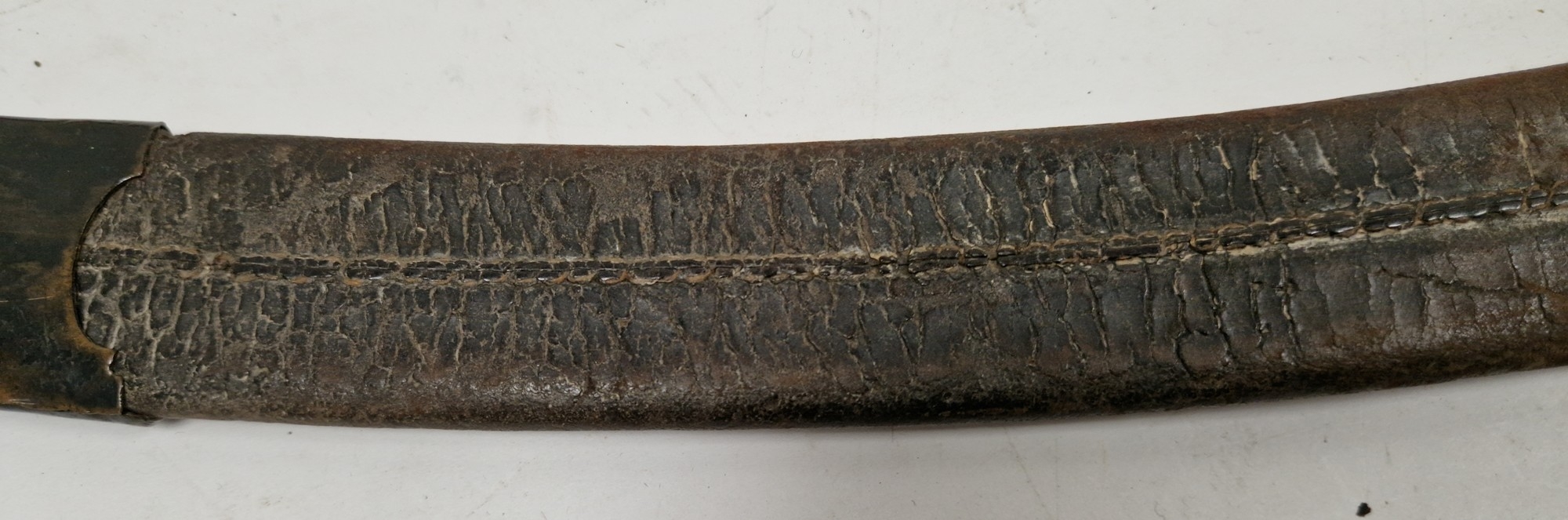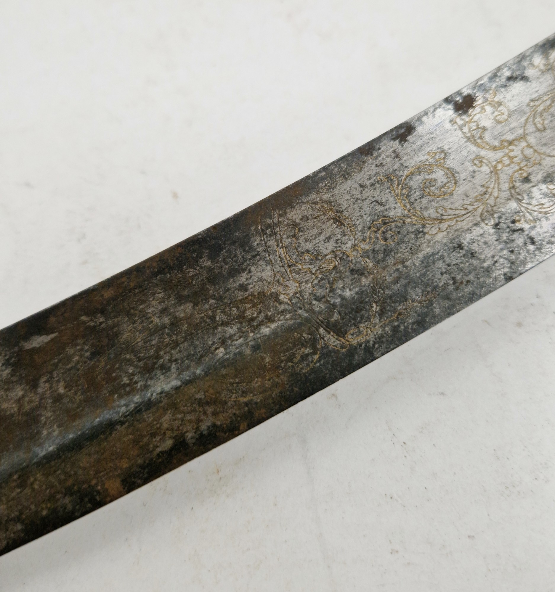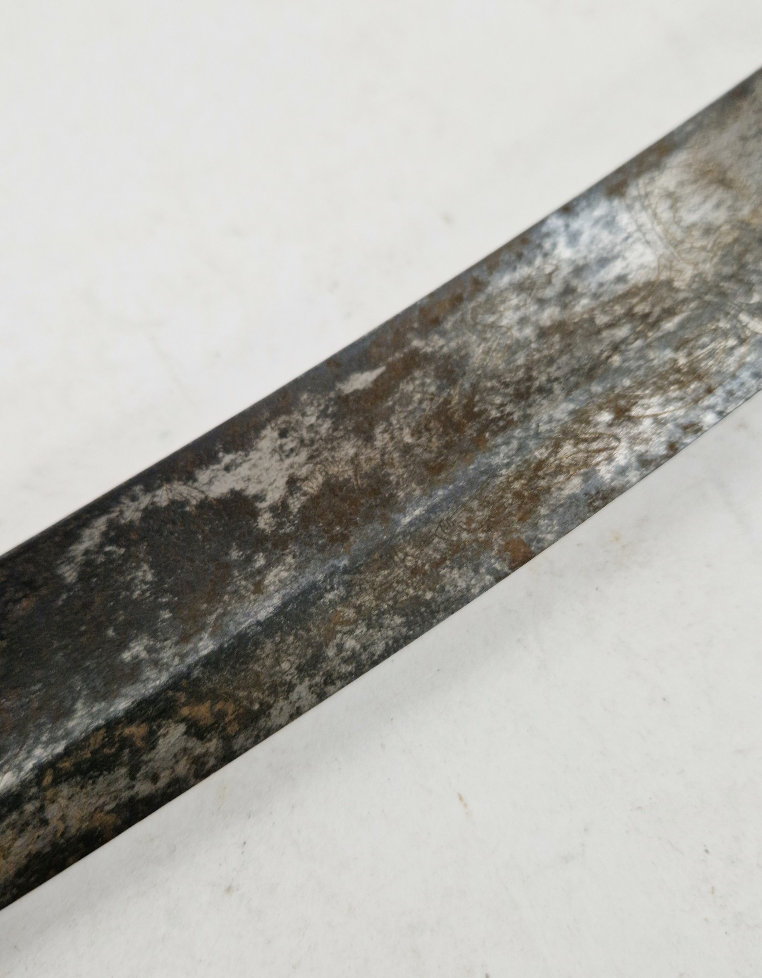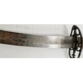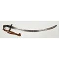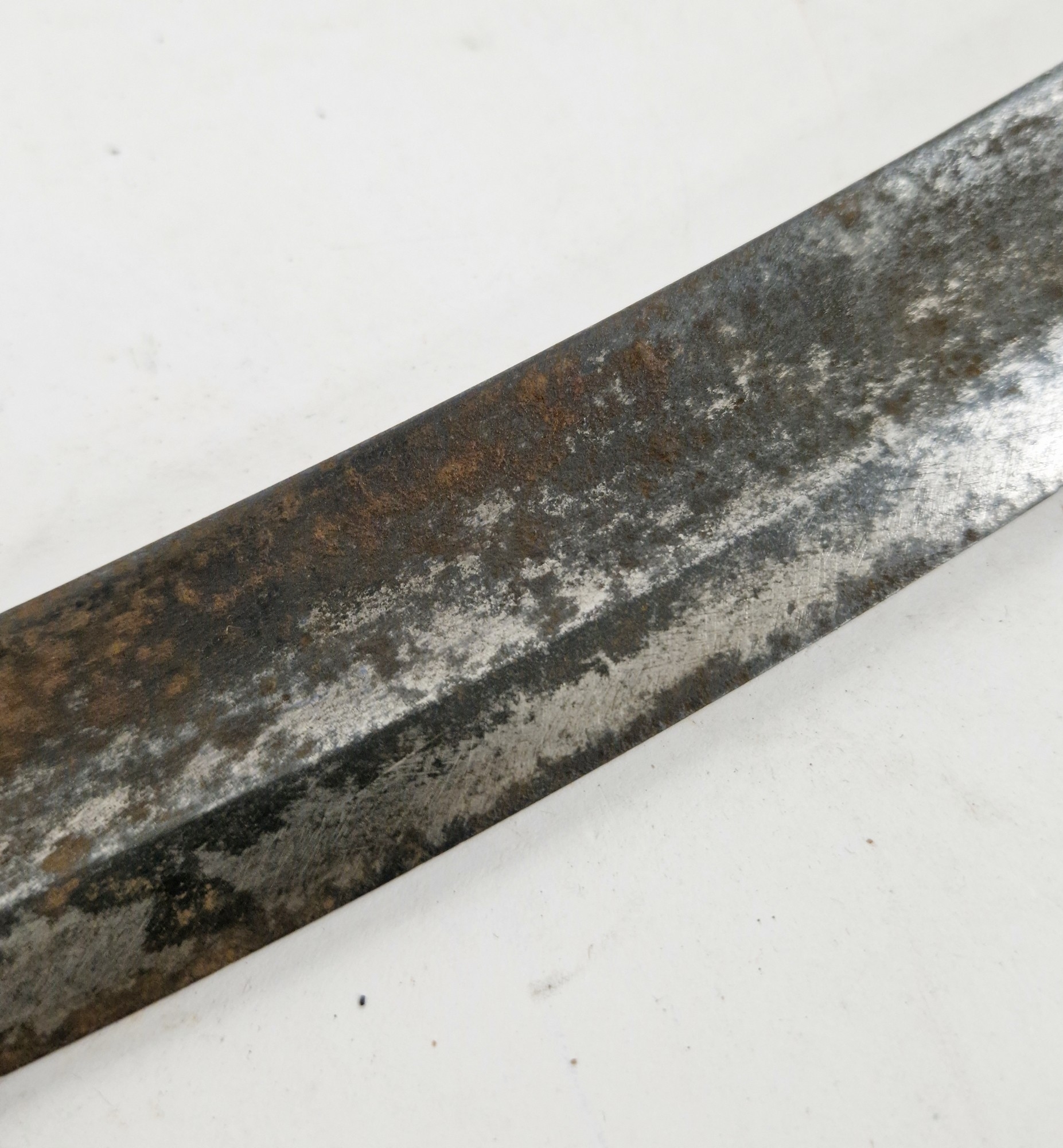 Blade - Surface scratches and scuffs. Some tiny nicks to the blade edge. Majority of bluing now gone, tarnishing and areas of rust to the blade. Blade is straight. Dents to the metal on back of handle and near guard. Area of loss to the wooden handle beneath the pommel. Scabbard - Scratches, scuffs, splits and perishing to the leather. Metal mounts with scratches, scuffs, dents and splits. Area of loss to the metal tip of scabbard. General wear and tear.