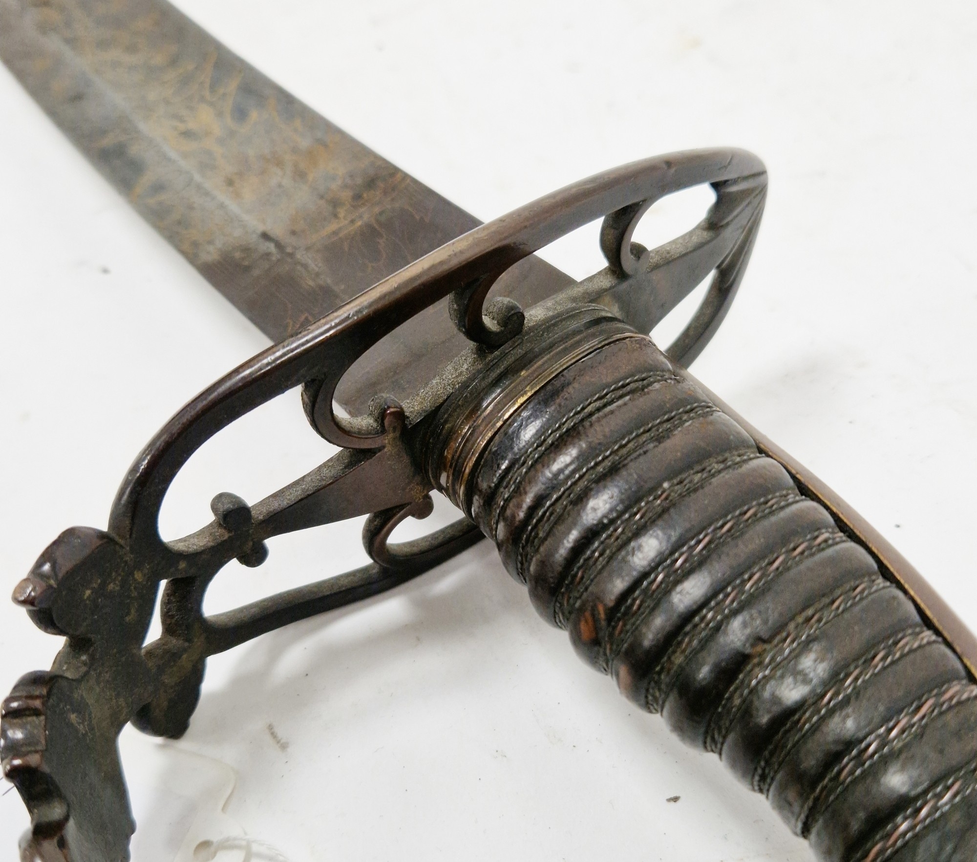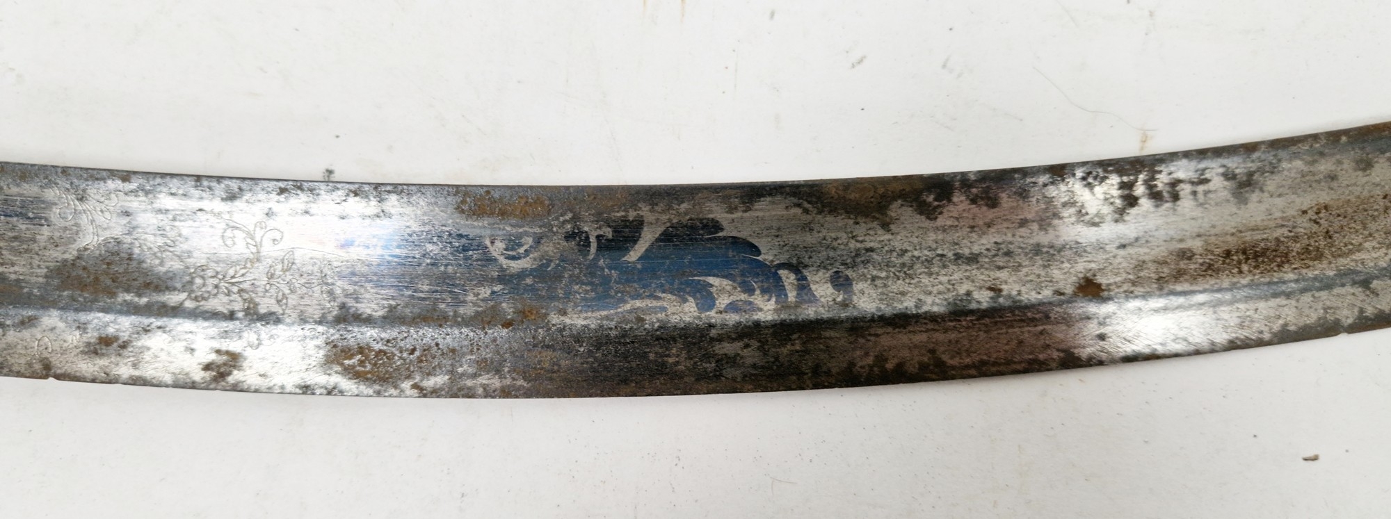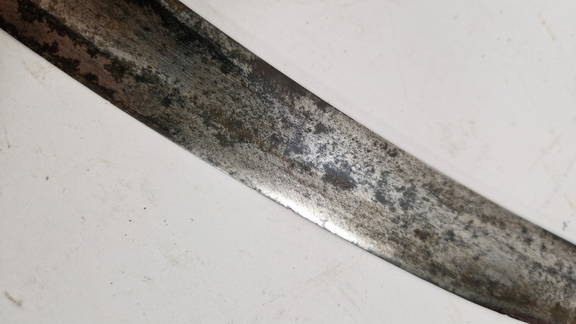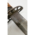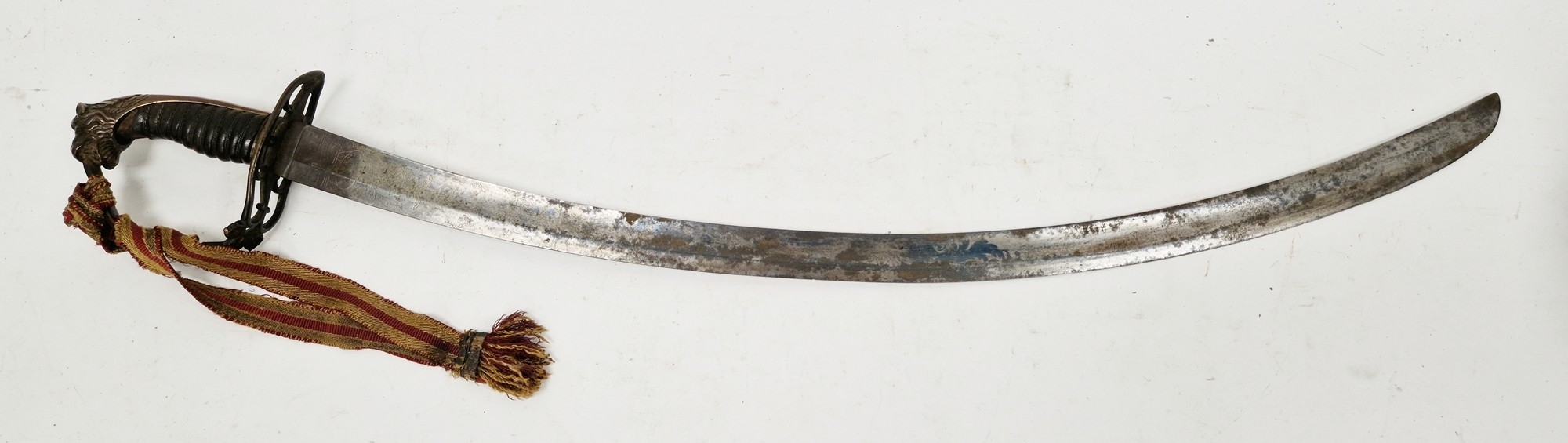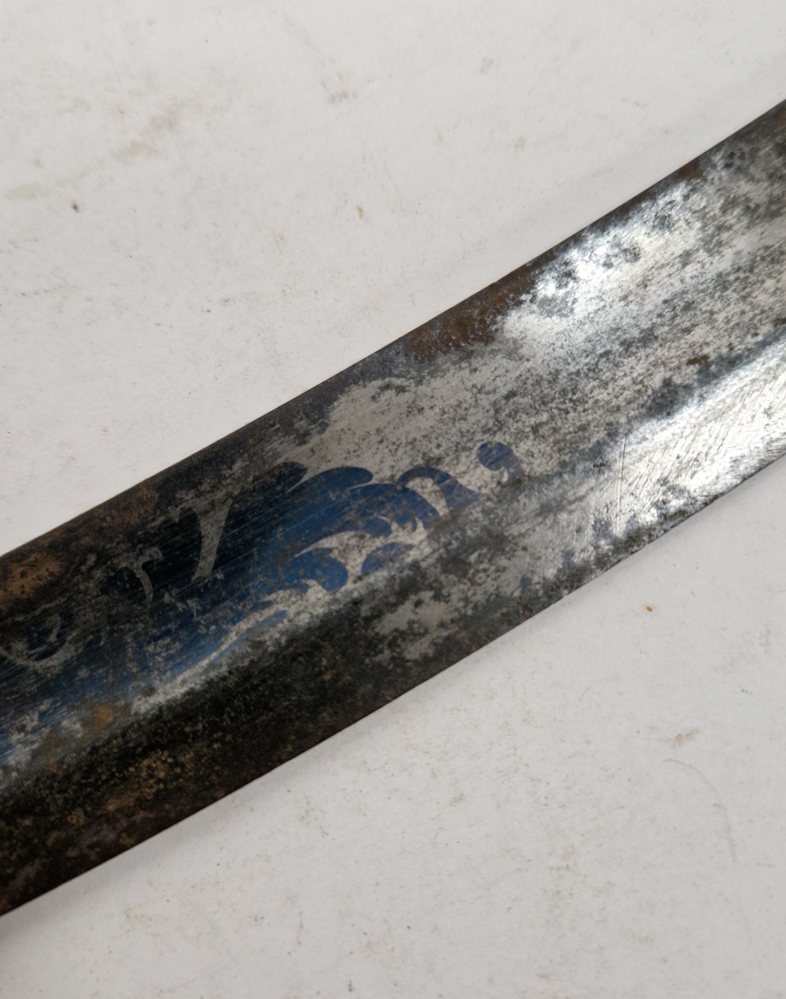 Blade - Surface scratches and scuffs. Some tiny nicks to the blade edge. Majority of bluing now gone, tarnishing and areas of rust to the blade. Blade is straight. Dents to the metal on back of handle and near guard. Area of loss to the wooden handle beneath the pommel. Scabbard - Scratches, scuffs, splits and perishing to the leather. Metal mounts with scratches, scuffs, dents and splits. Area of loss to the metal tip of scabbard. General wear and tear.