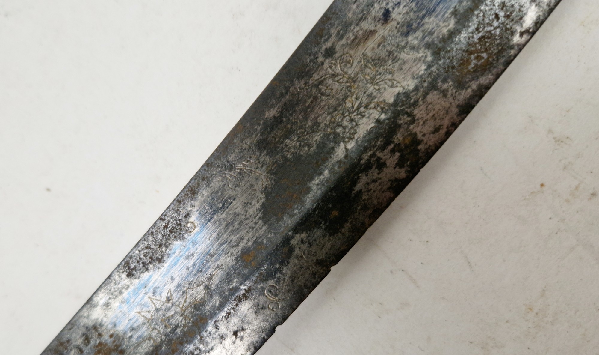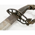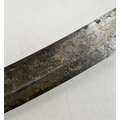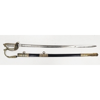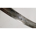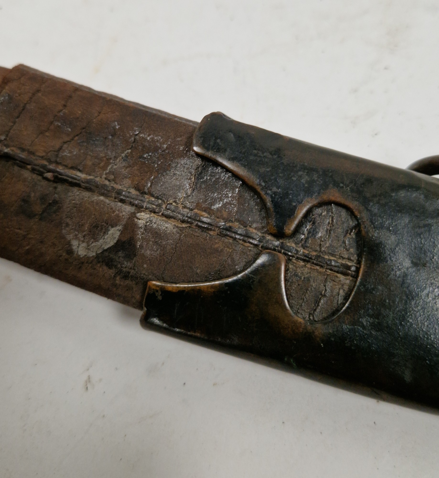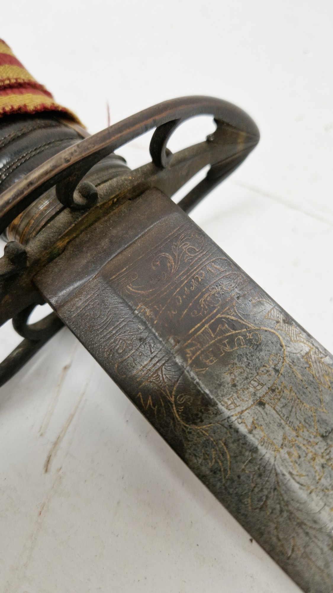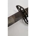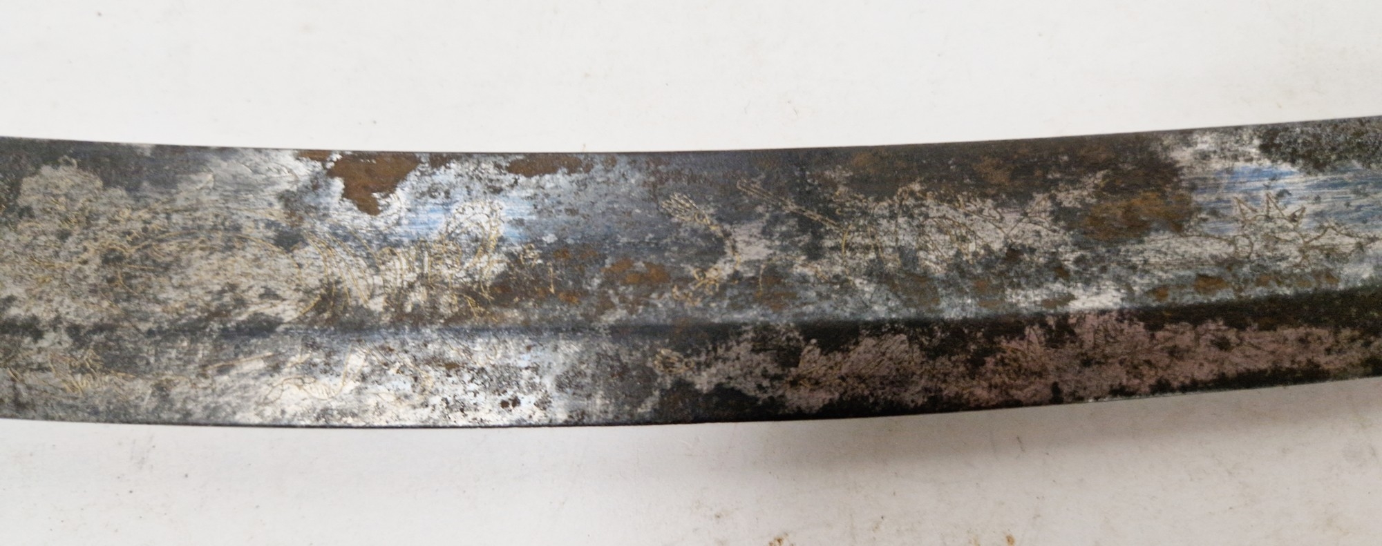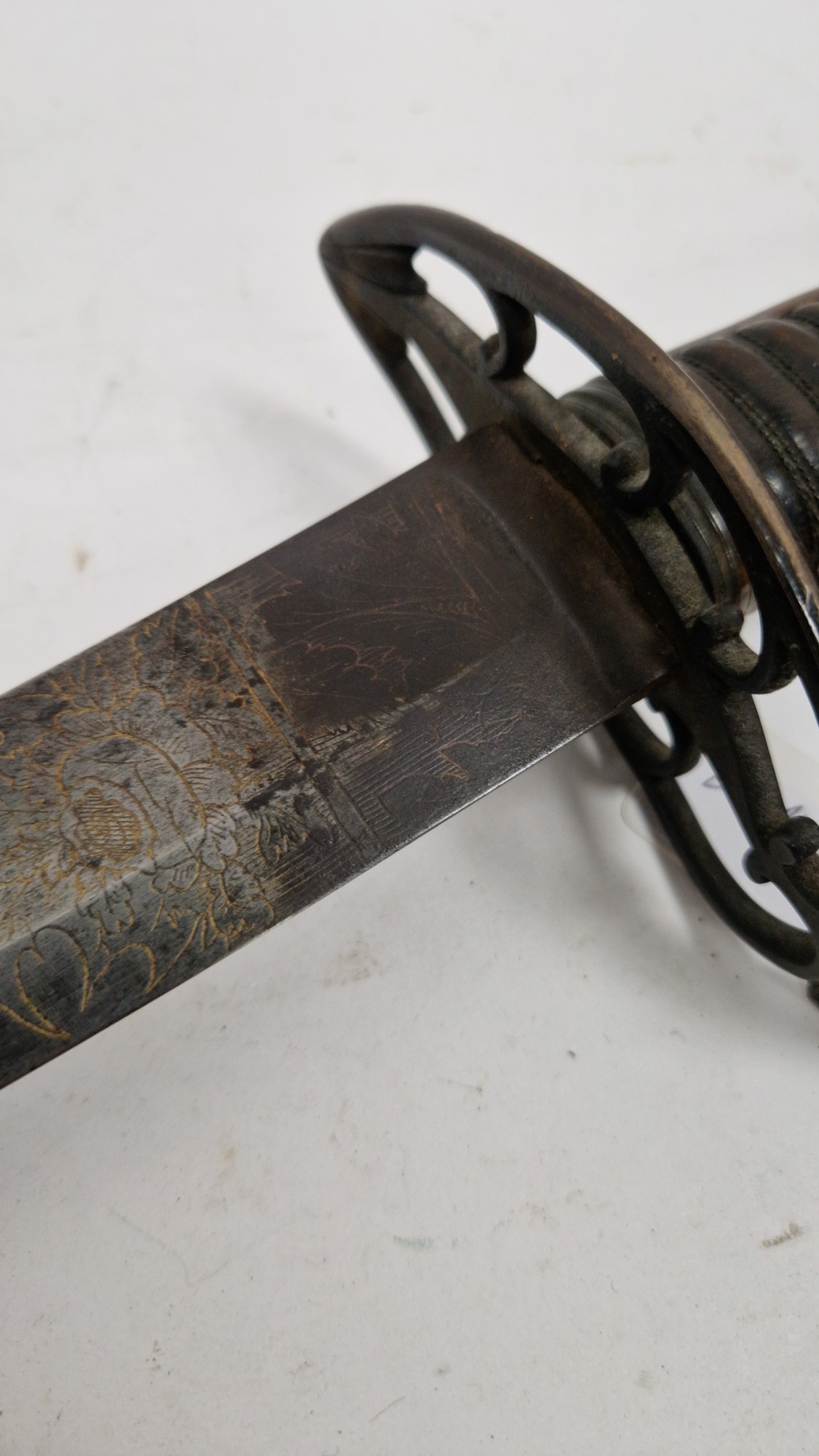 Blade - Surface scratches and scuffs. Some tiny nicks to the blade edge. Majority of bluing now gone, tarnishing and areas of rust to the blade. Blade is straight. Dents to the metal on back of handle and near guard. Area of loss to the wooden handle beneath the pommel. Scabbard - Scratches, scuffs, splits and perishing to the leather. Metal mounts with scratches, scuffs, dents and splits. Area of loss to the metal tip of scabbard. General wear and tear.