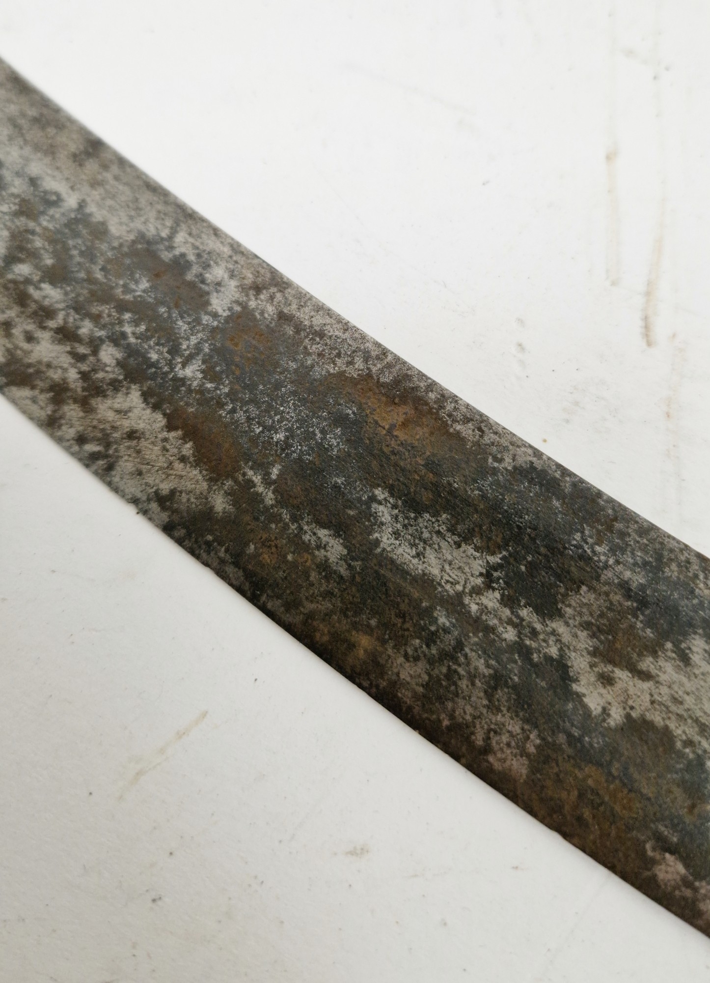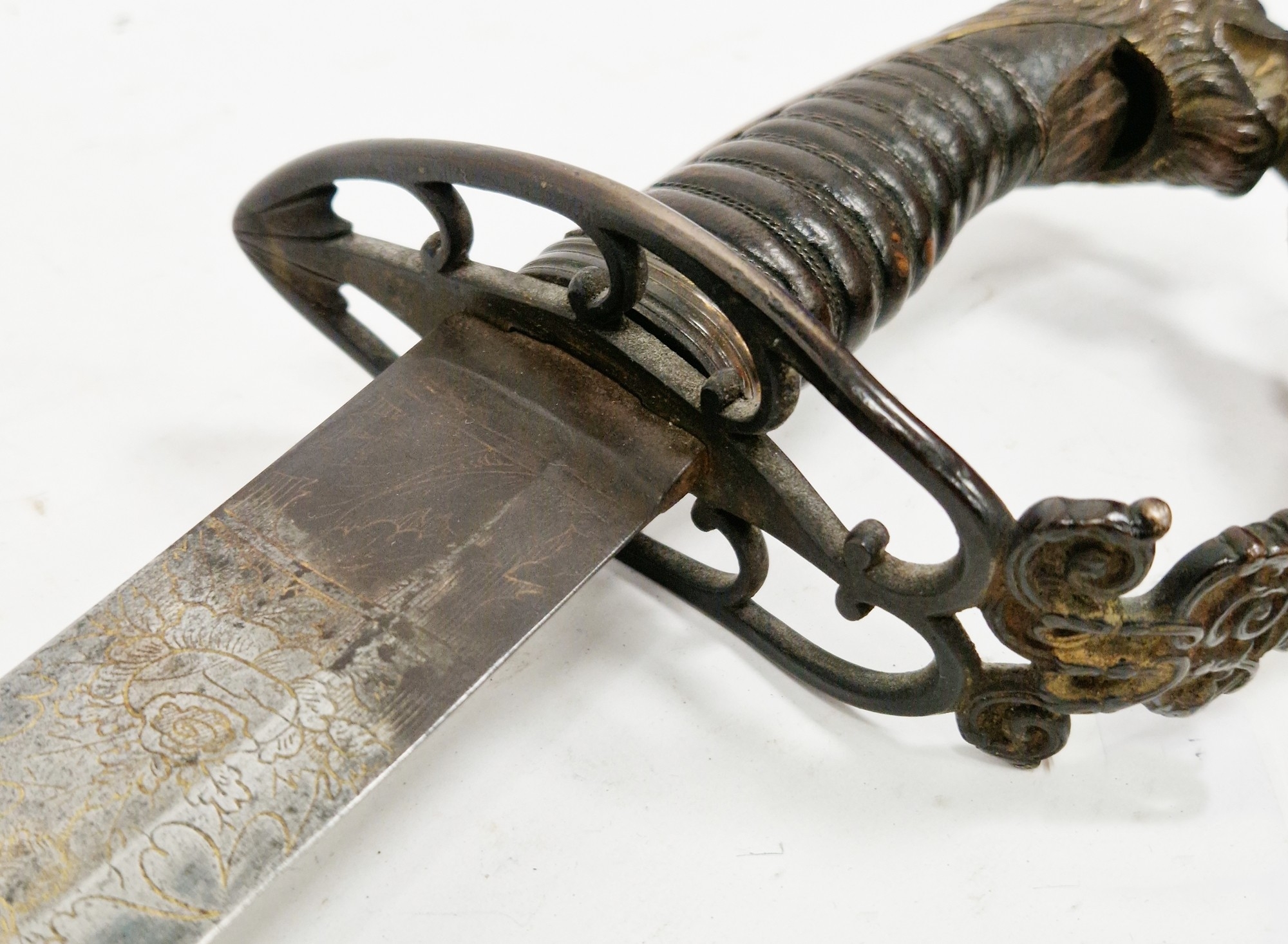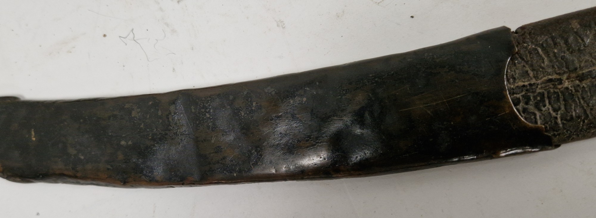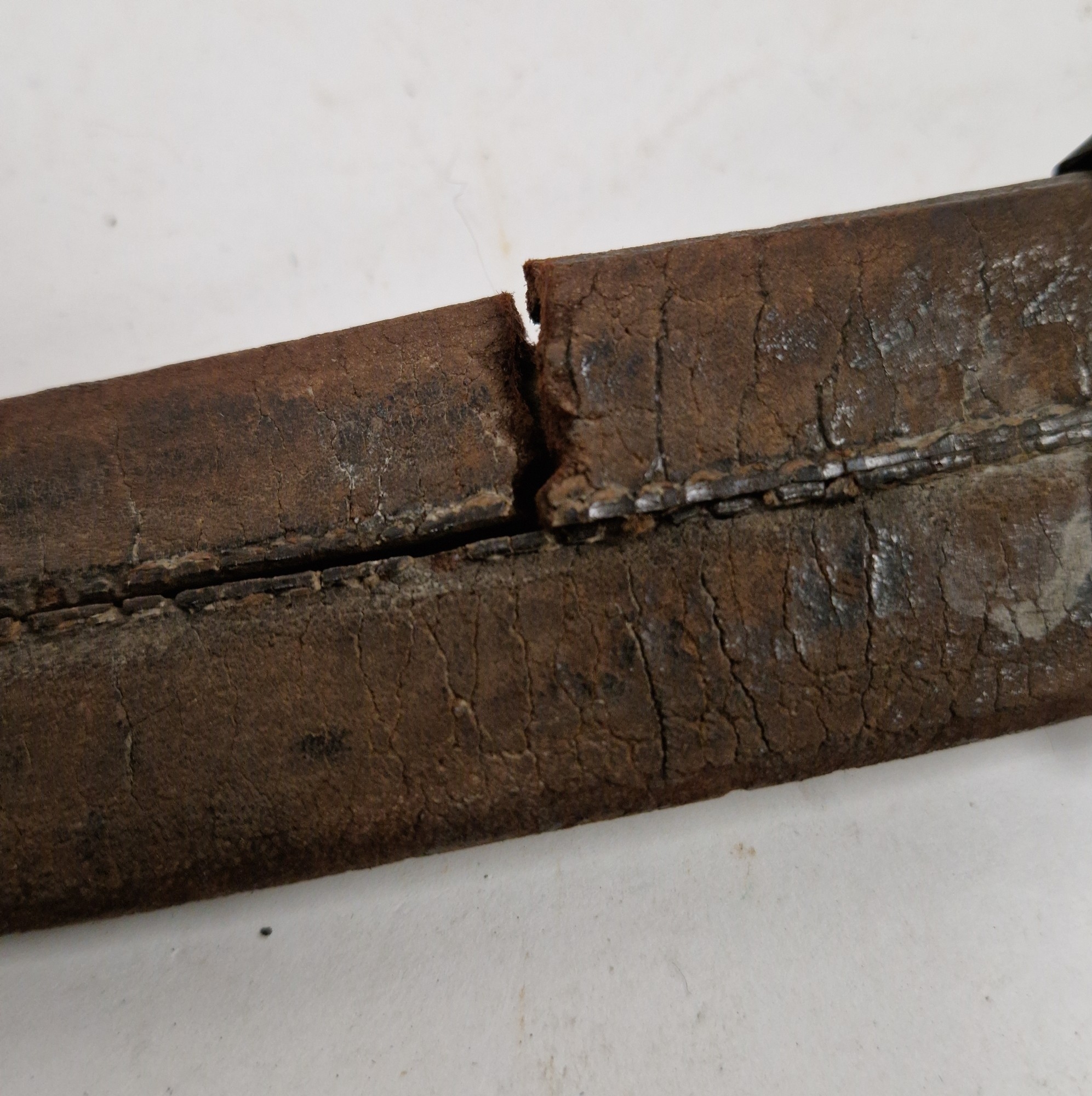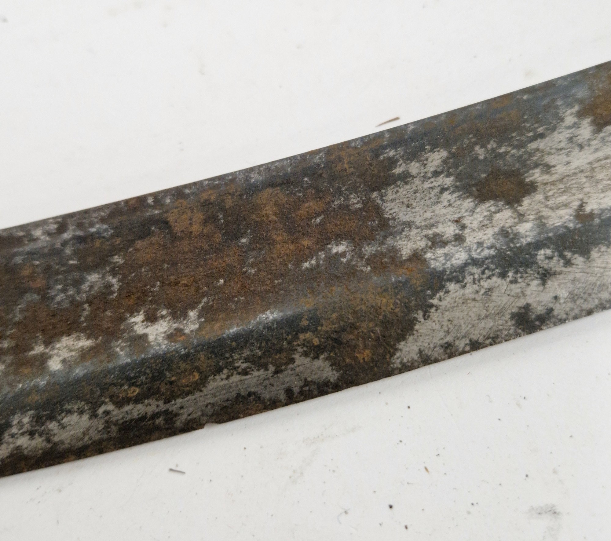 Blade - Surface scratches and scuffs. Some tiny nicks to the blade edge. Majority of bluing now gone, tarnishing and areas of rust to the blade. Blade is straight. Dents to the metal on back of handle and near guard. Area of loss to the wooden handle beneath the pommel. Scabbard - Scratches, scuffs, splits and perishing to the leather. Metal mounts with scratches, scuffs, dents and splits. Area of loss to the metal tip of scabbard. General wear and tear.