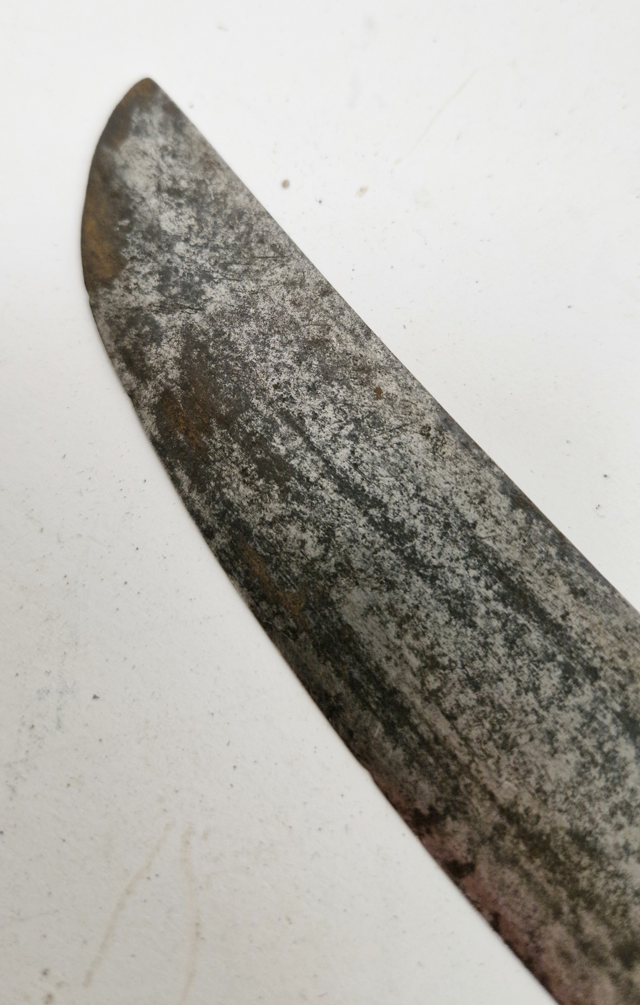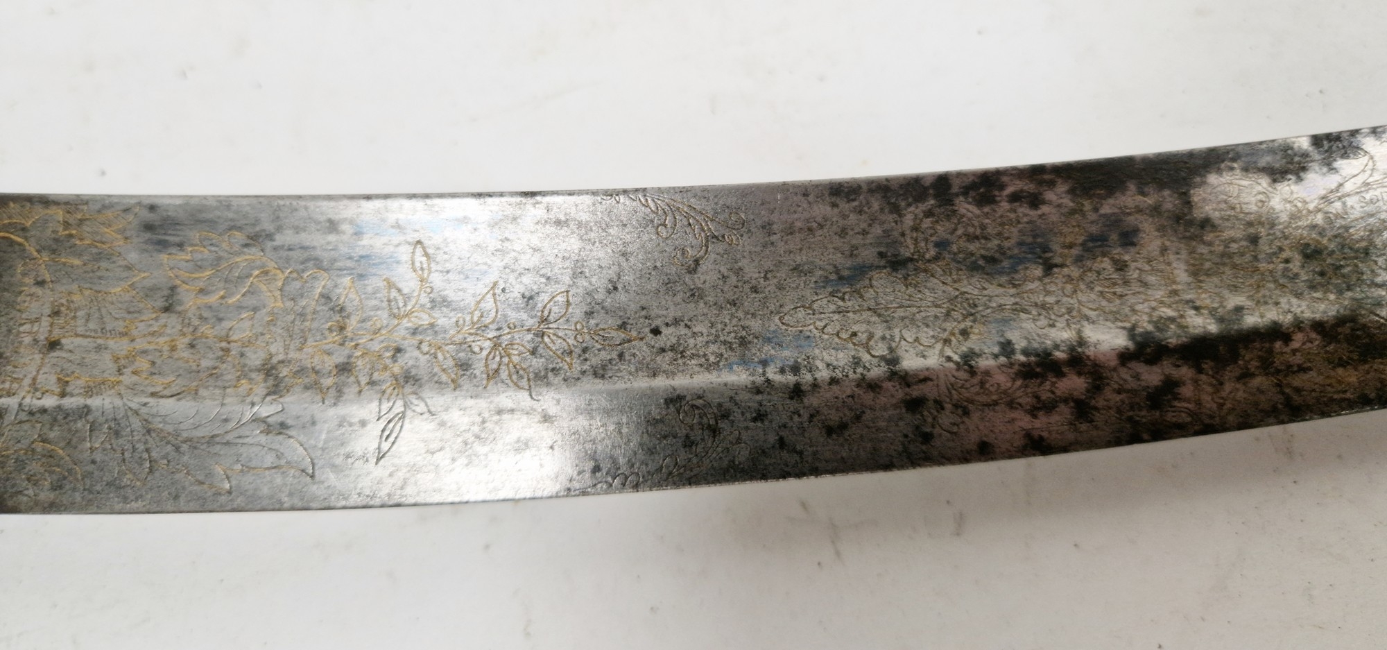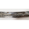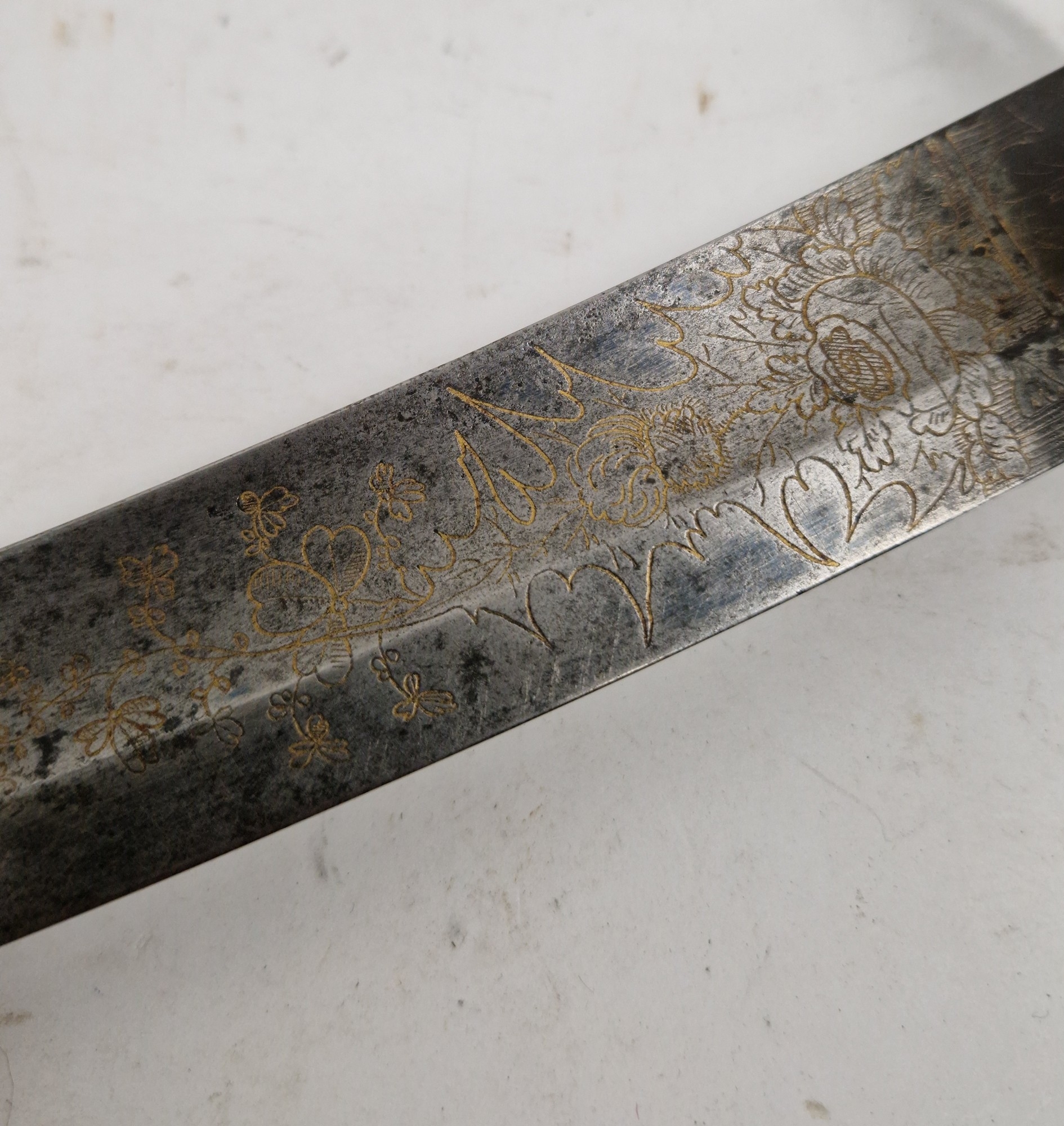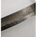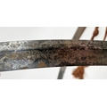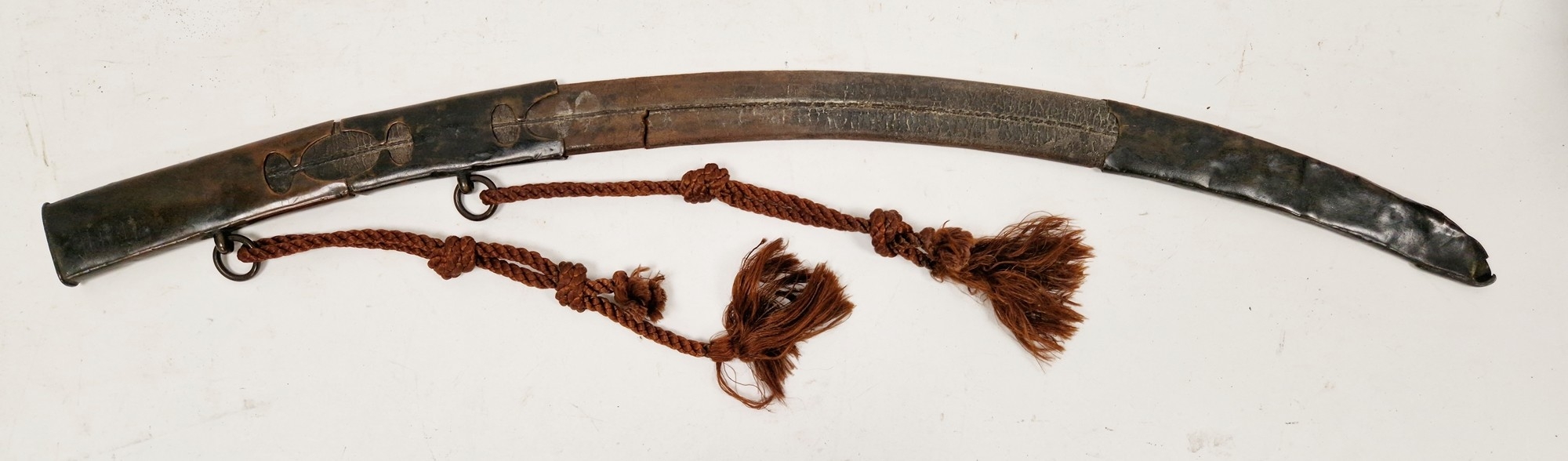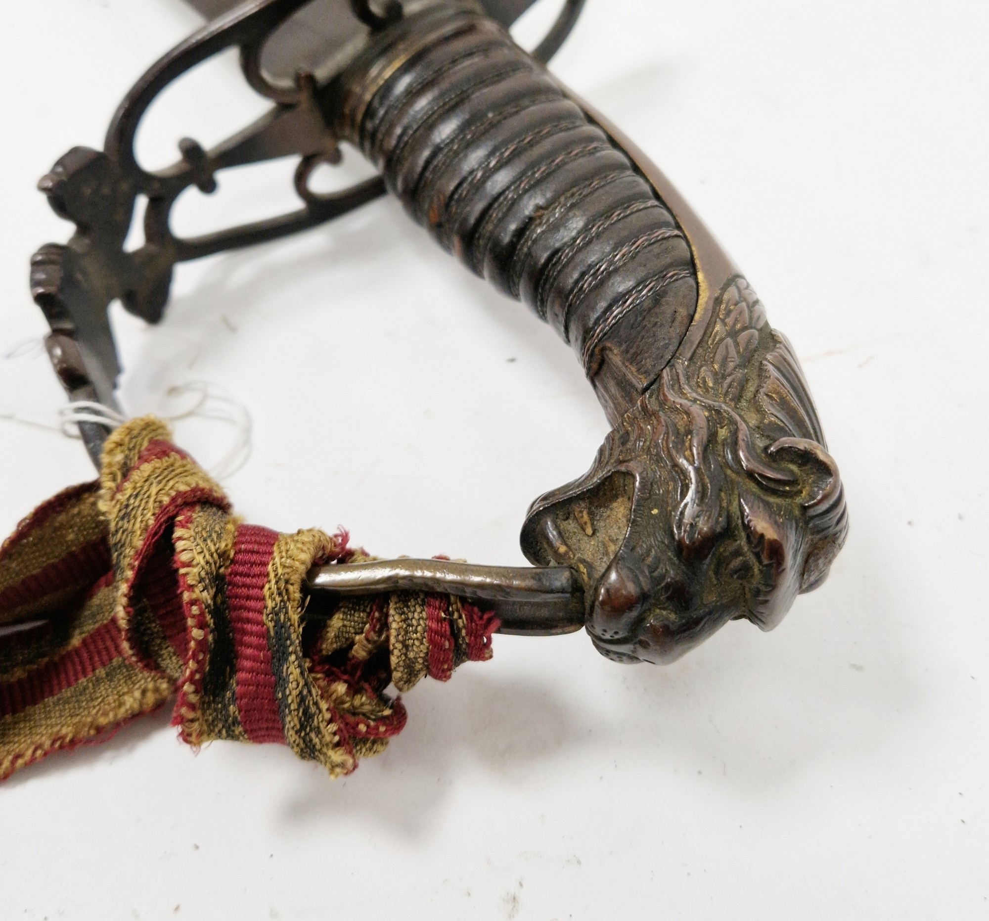 Blade - Surface scratches and scuffs. Some tiny nicks to the blade edge. Majority of bluing now gone, tarnishing and areas of rust to the blade. Blade is straight. Dents to the metal on back of handle and near guard. Area of loss to the wooden handle beneath the pommel. Scabbard - Scratches, scuffs, splits and perishing to the leather. Metal mounts with scratches, scuffs, dents and splits. Area of loss to the metal tip of scabbard. General wear and tear.