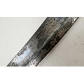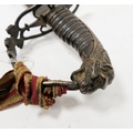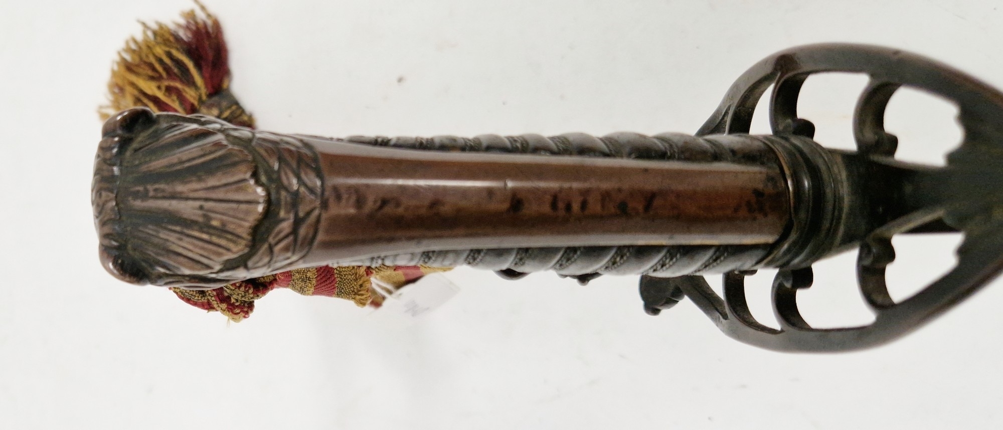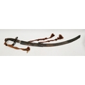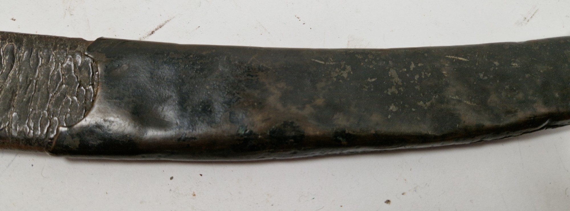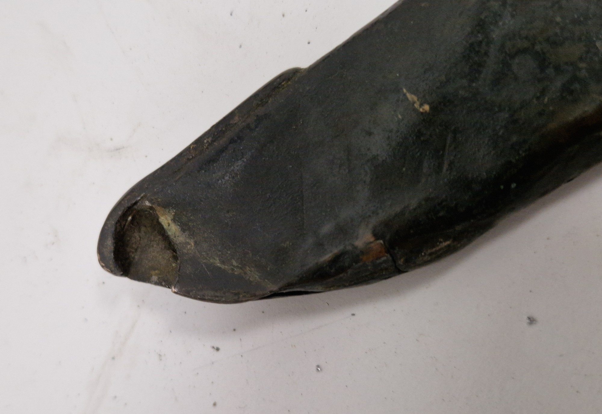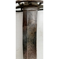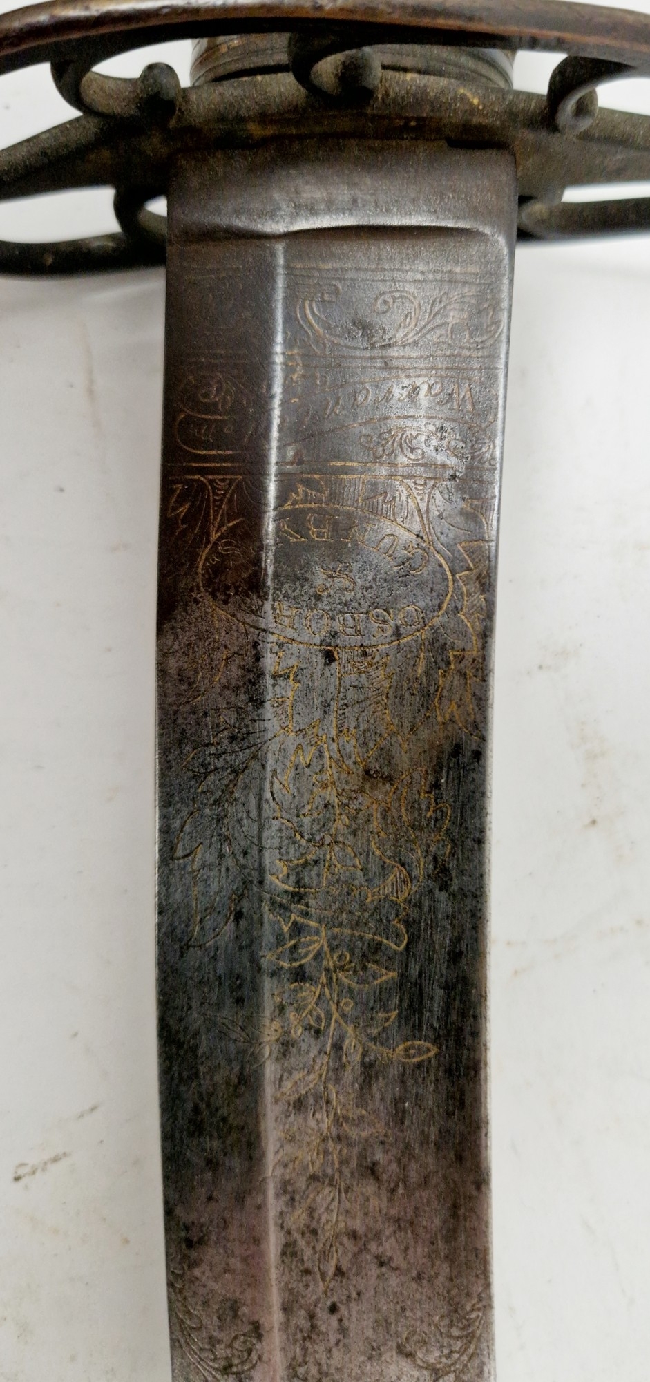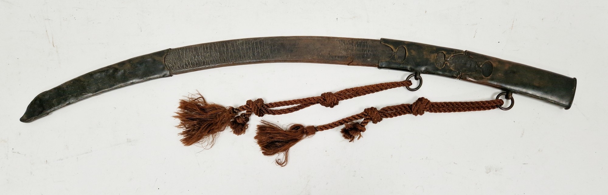 Blade - Surface scratches and scuffs. Some tiny nicks to the blade edge. Majority of bluing now gone, tarnishing and areas of rust to the blade. Blade is straight. Dents to the metal on back of handle and near guard. Area of loss to the wooden handle beneath the pommel. Scabbard - Scratches, scuffs, splits and perishing to the leather. Metal mounts with scratches, scuffs, dents and splits. Area of loss to the metal tip of scabbard. General wear and tear.
