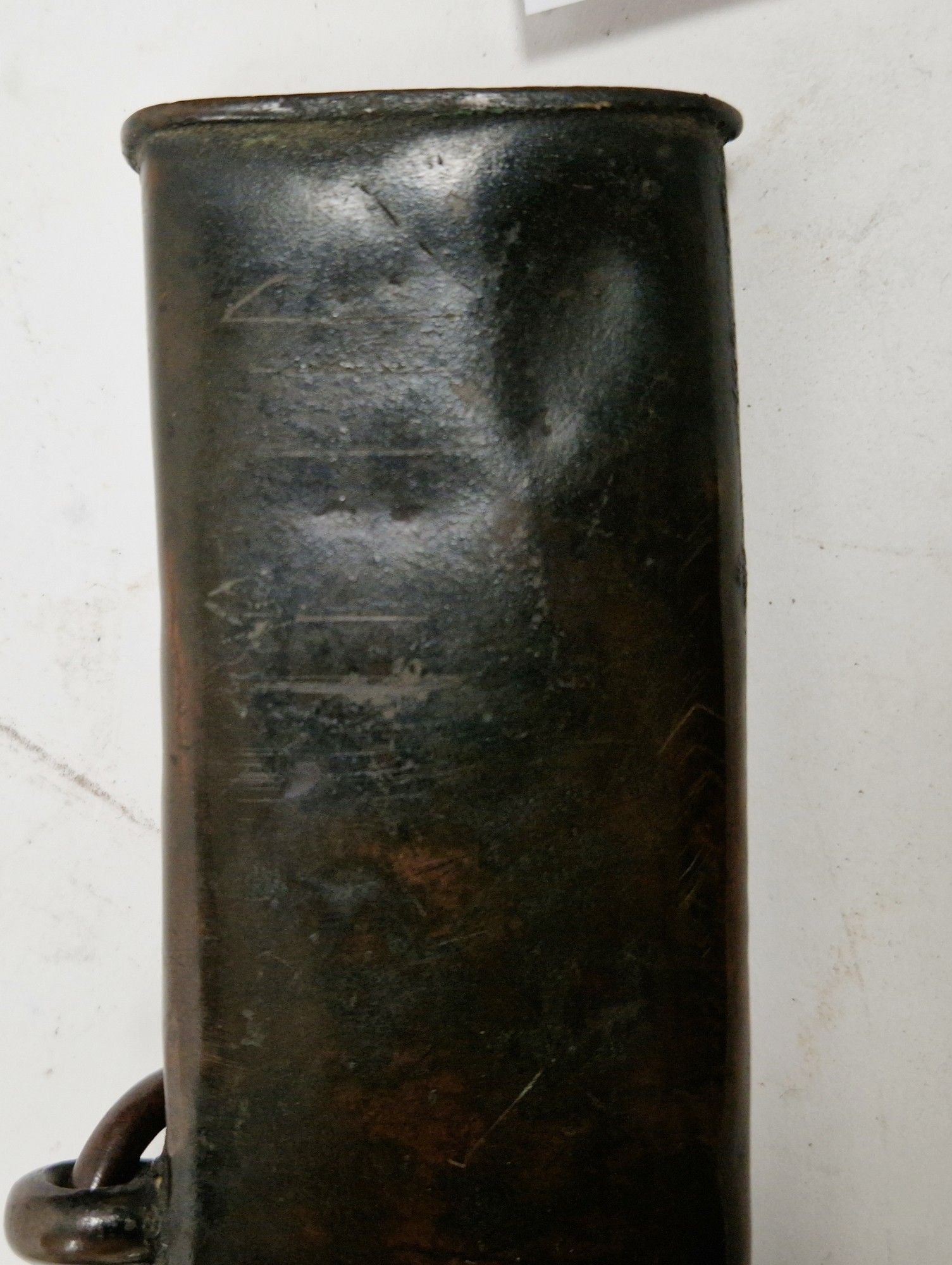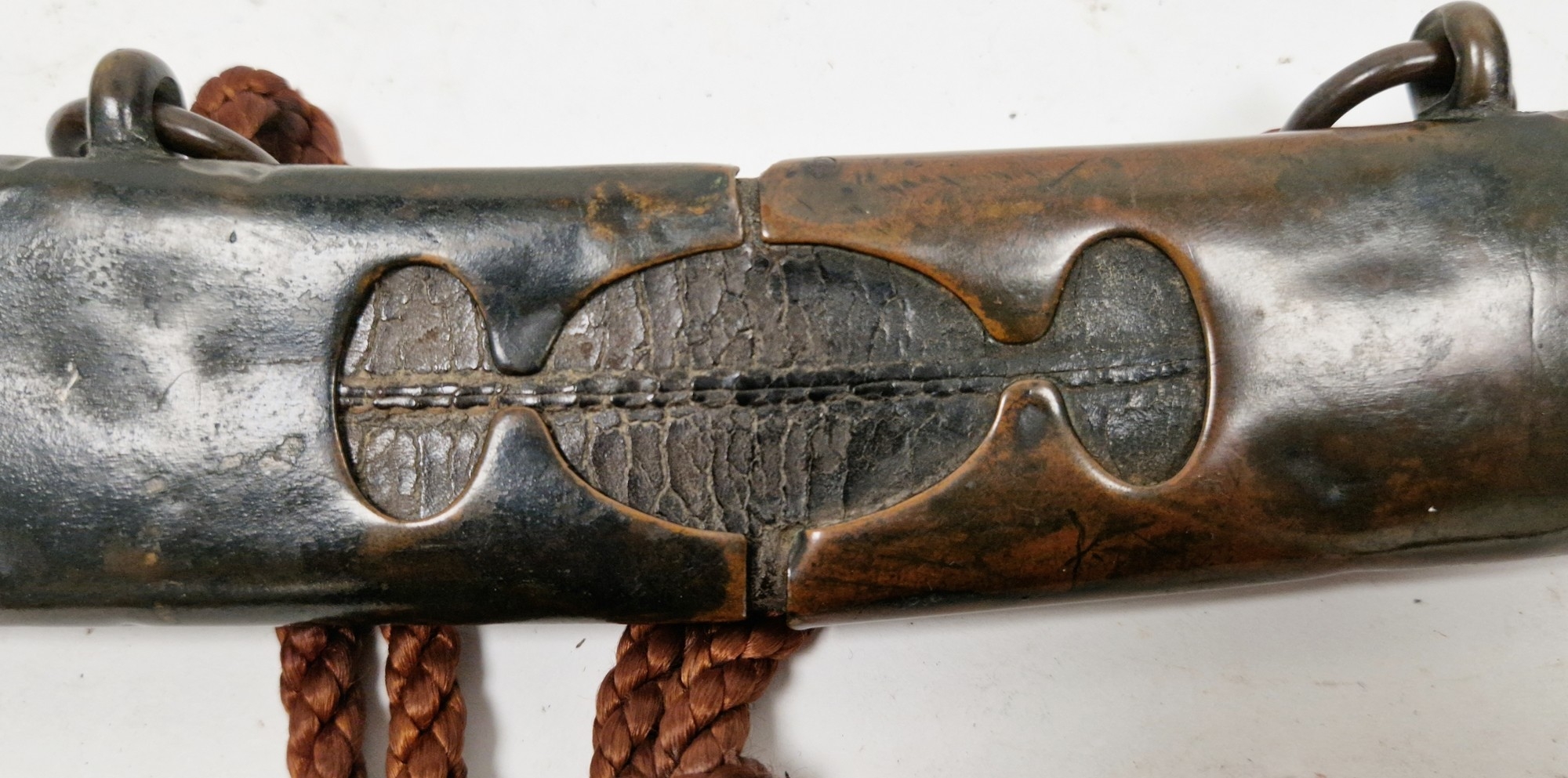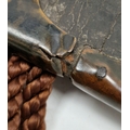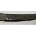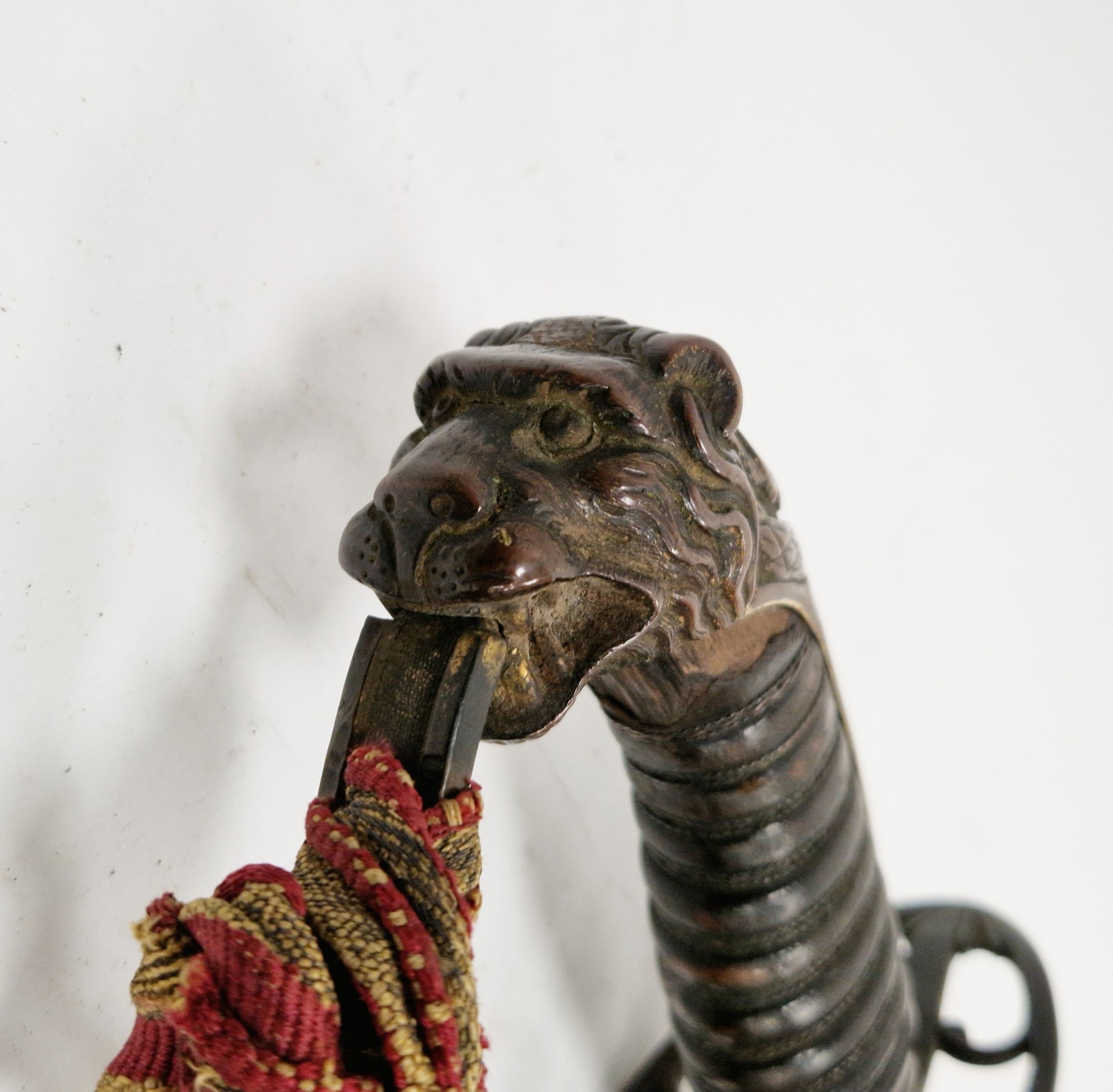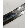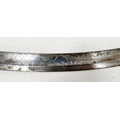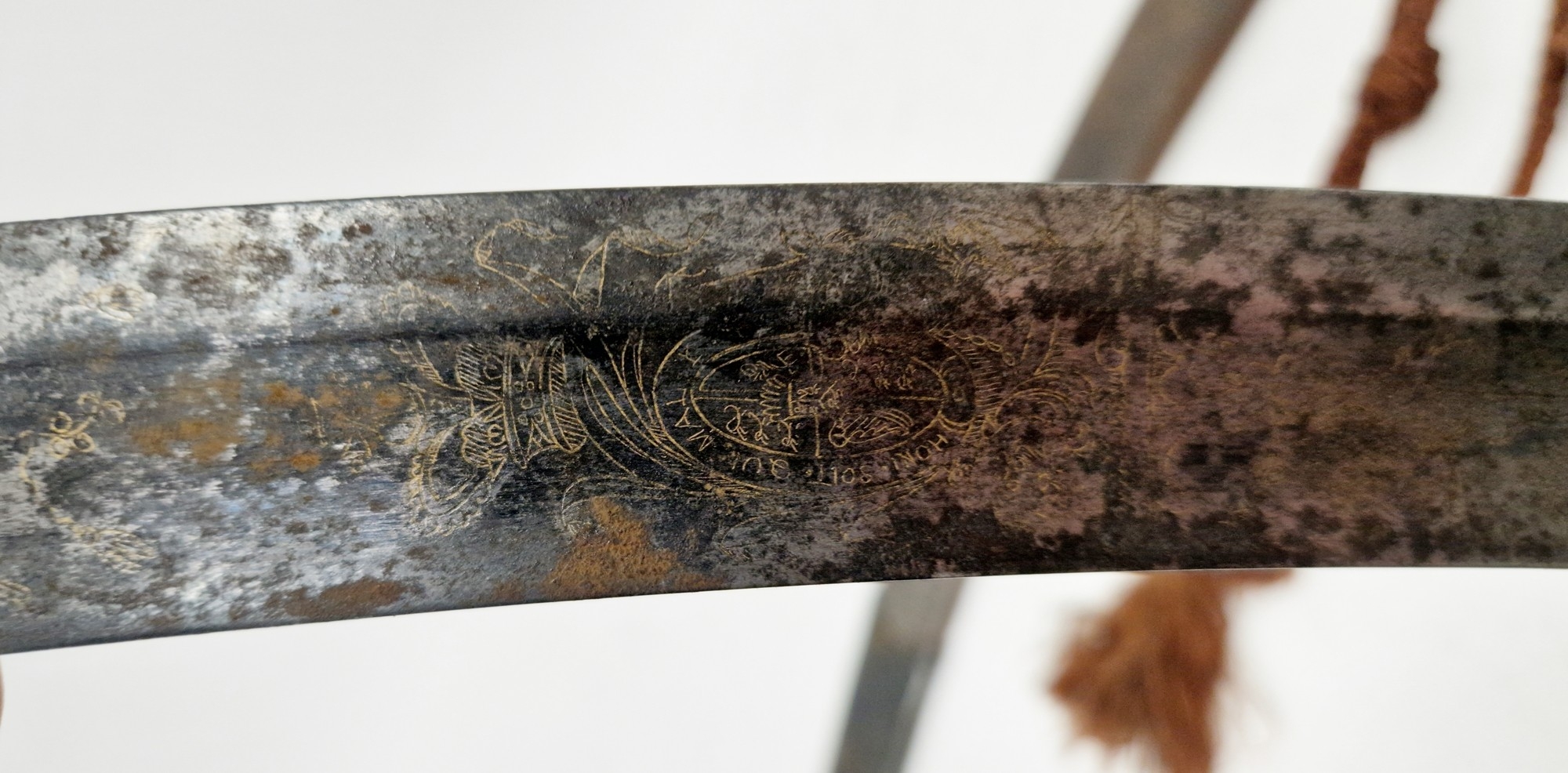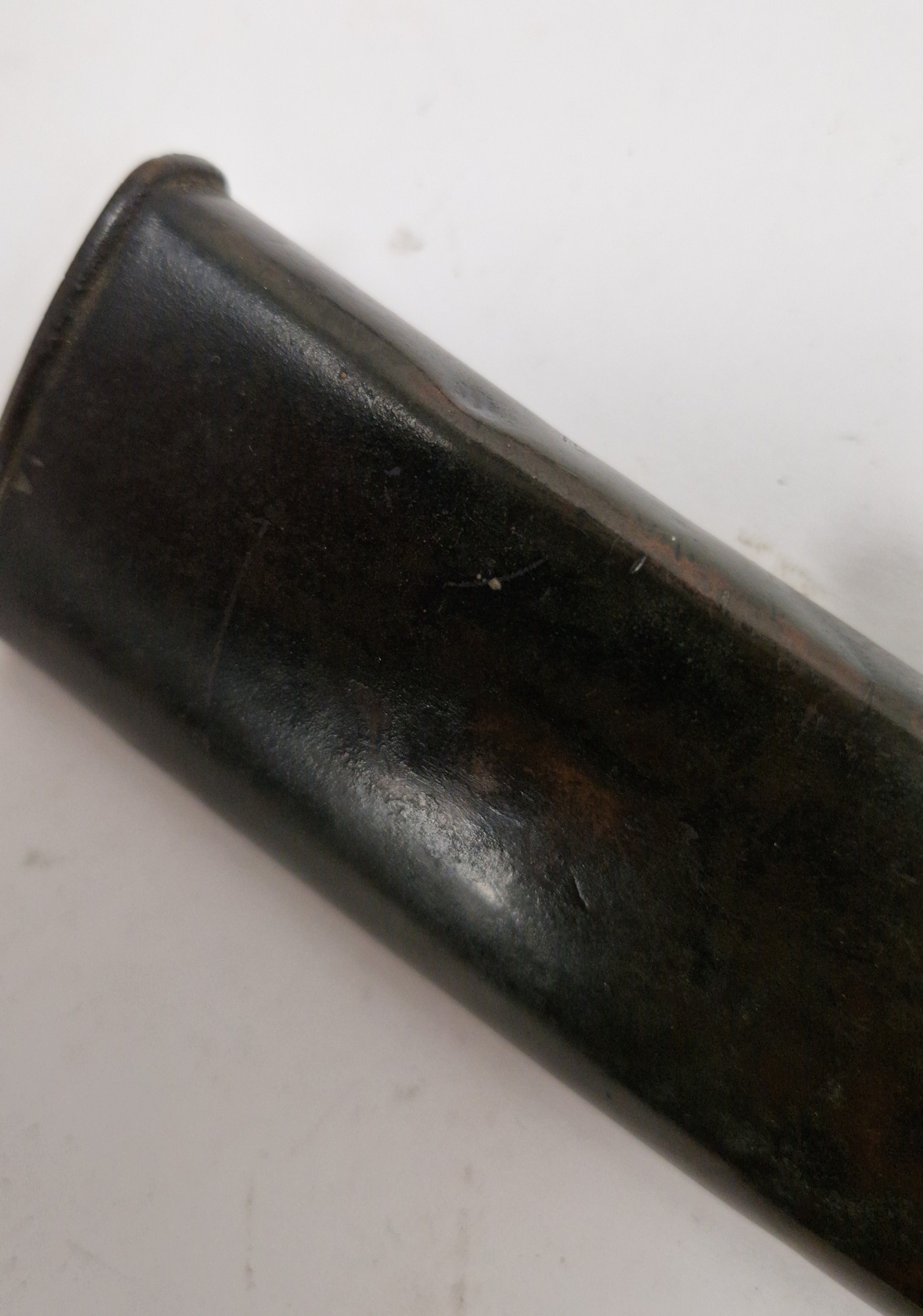 Blade - Surface scratches and scuffs. Some tiny nicks to the blade edge. Majority of bluing now gone, tarnishing and areas of rust to the blade. Blade is straight. Dents to the metal on back of handle and near guard. Area of loss to the wooden handle beneath the pommel. Scabbard - Scratches, scuffs, splits and perishing to the leather. Metal mounts with scratches, scuffs, dents and splits. Area of loss to the metal tip of scabbard. General wear and tear.