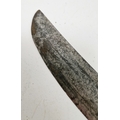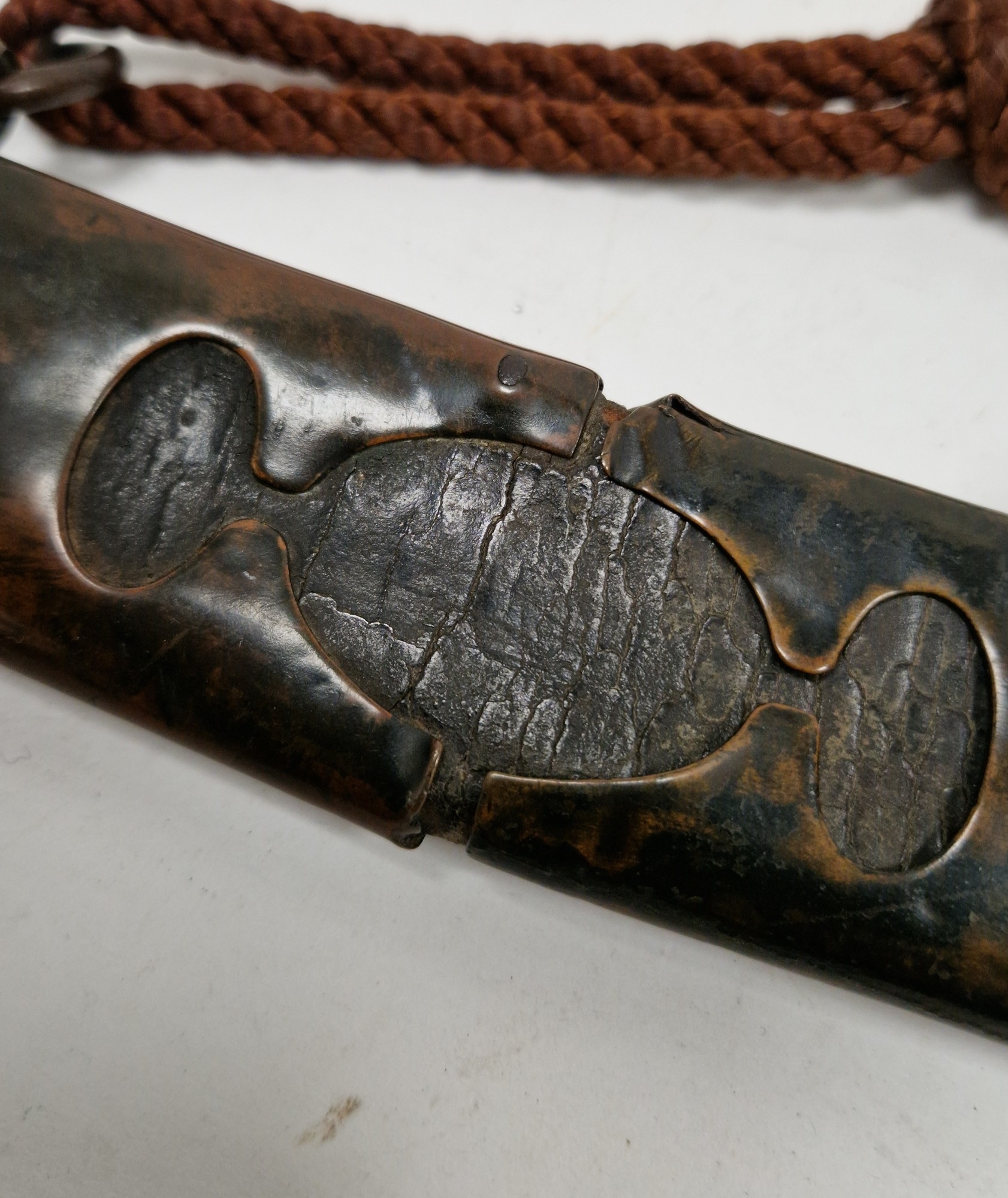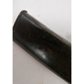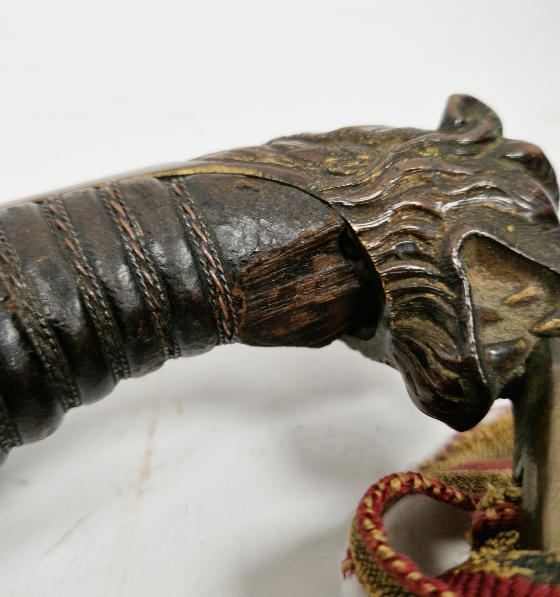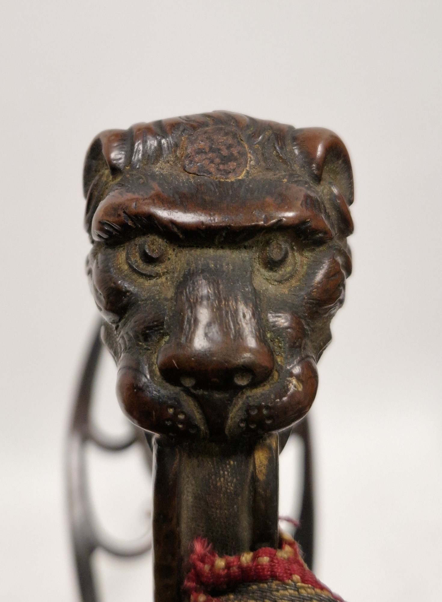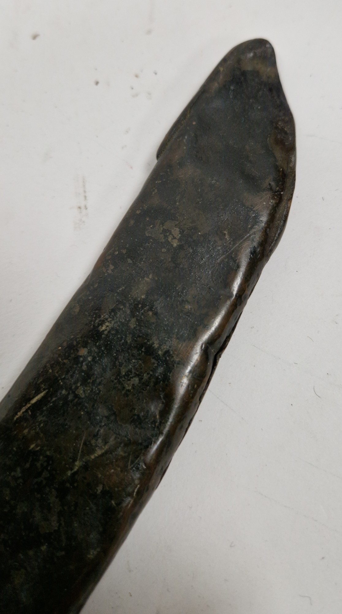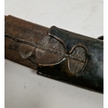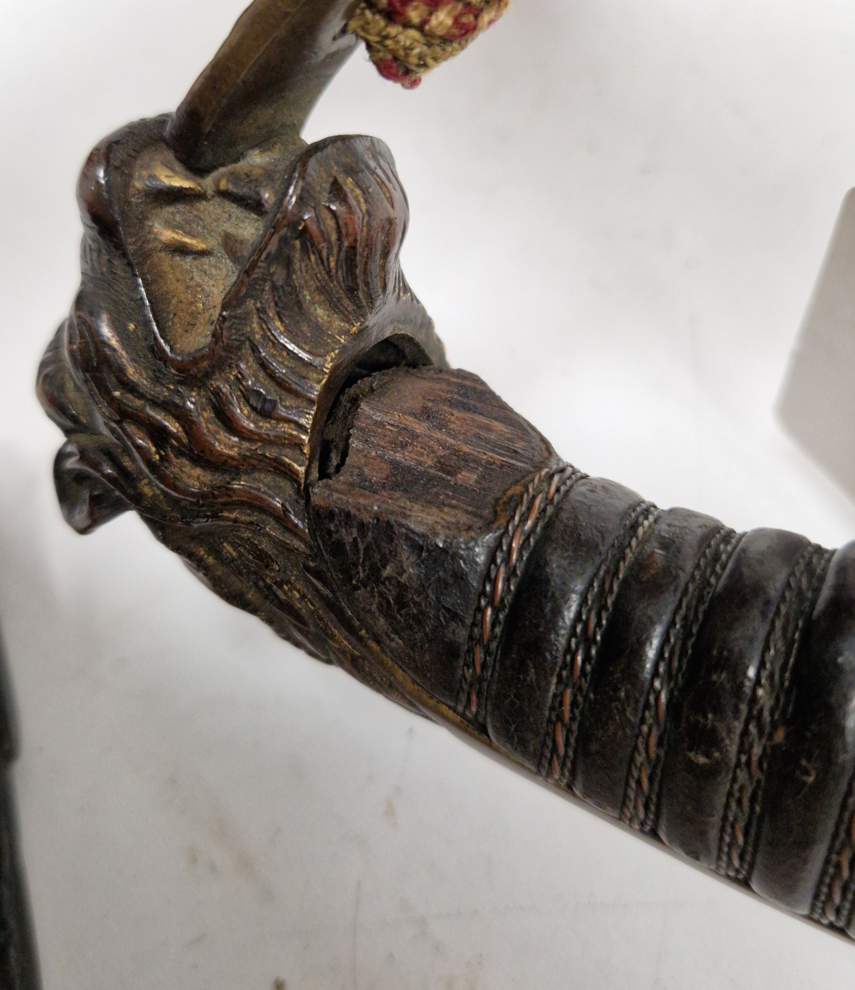 Blade - Surface scratches and scuffs. Some tiny nicks to the blade edge. Majority of bluing now gone, tarnishing and areas of rust to the blade. Blade is straight. Dents to the metal on back of handle and near guard. Area of loss to the wooden handle beneath the pommel. Scabbard - Scratches, scuffs, splits and perishing to the leather. Metal mounts with scratches, scuffs, dents and splits. Area of loss to the metal tip of scabbard. General wear and tear.