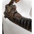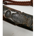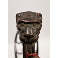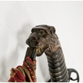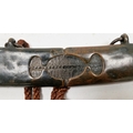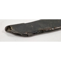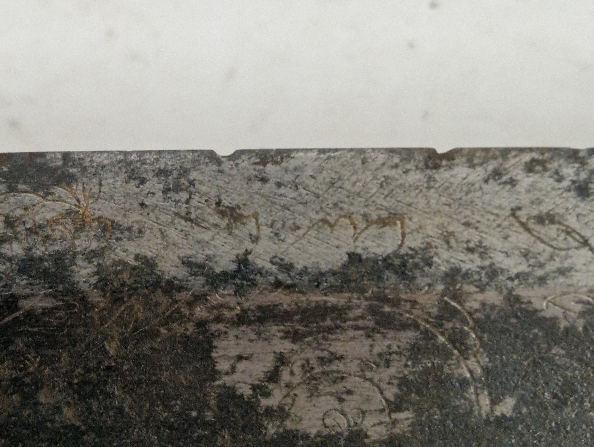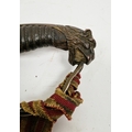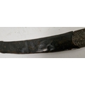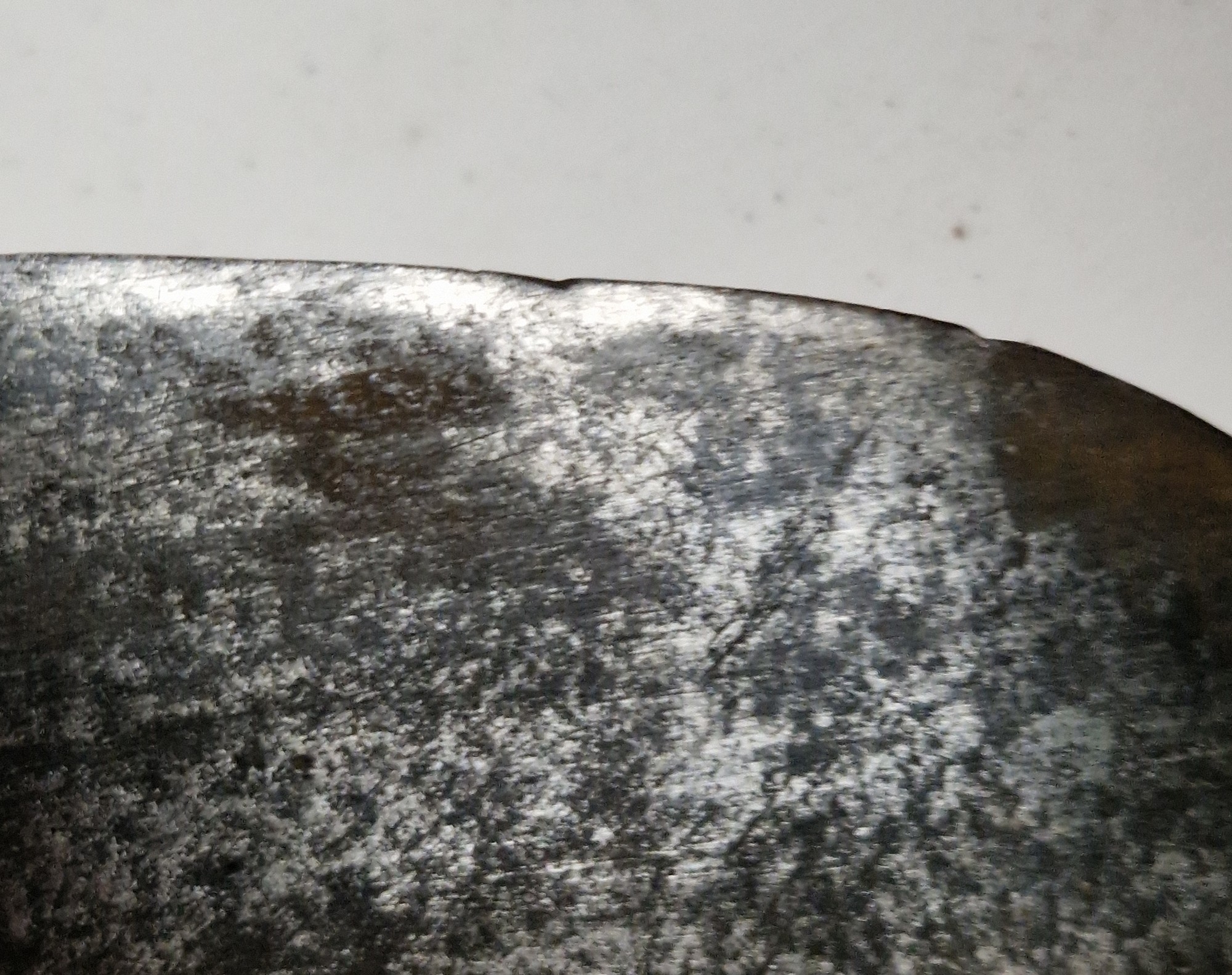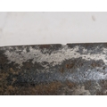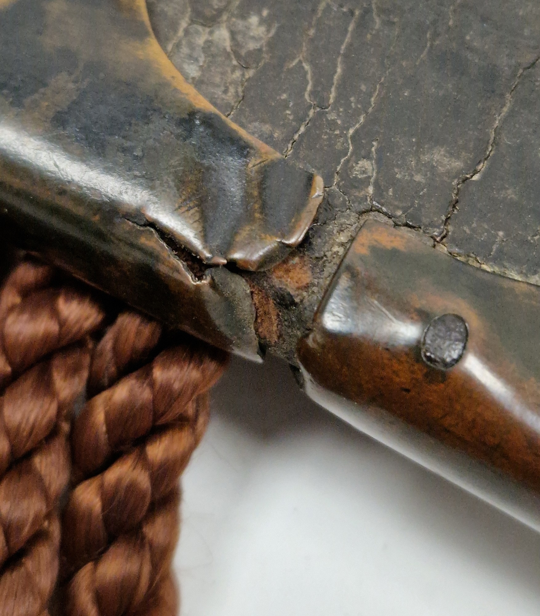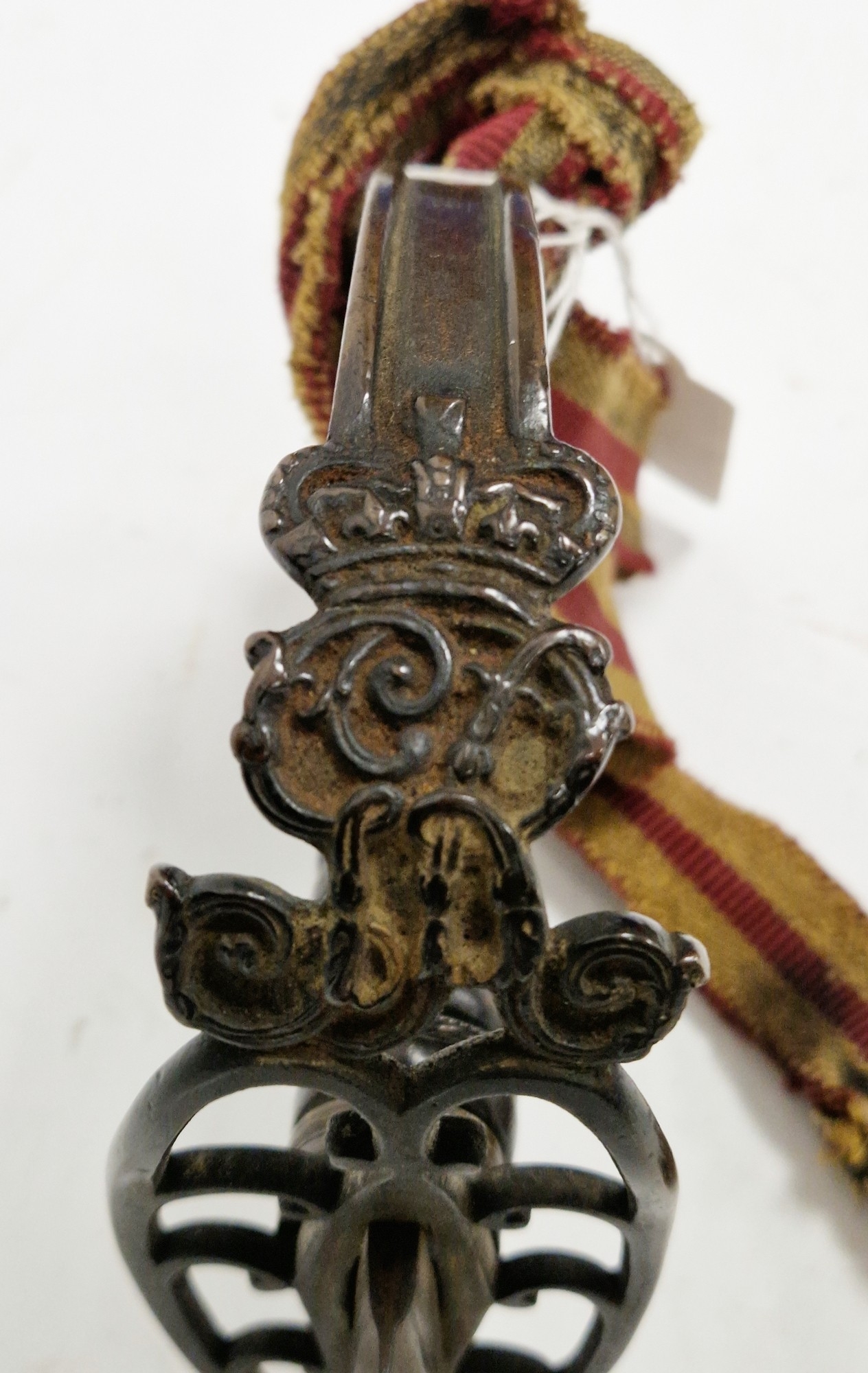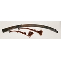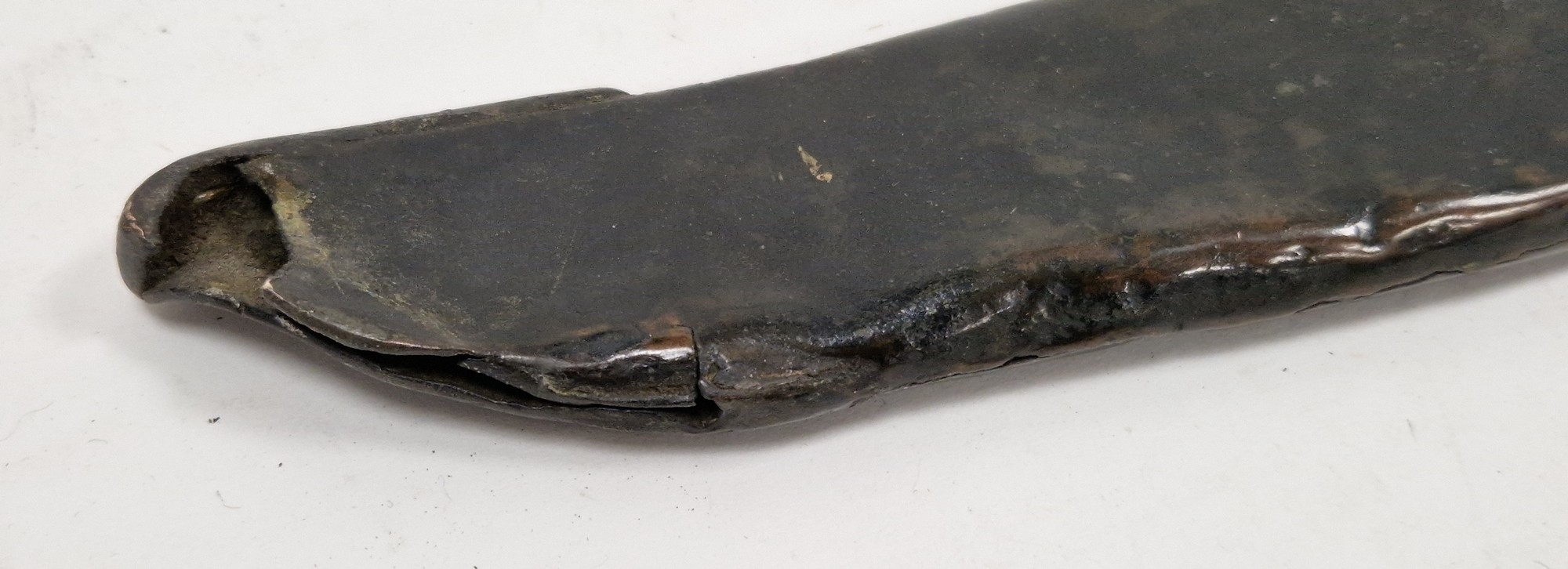 Blade - Surface scratches and scuffs. Some tiny nicks to the blade edge. Majority of bluing now gone, tarnishing and areas of rust to the blade. Blade is straight. Dents to the metal on back of handle and near guard. Area of loss to the wooden handle beneath the pommel. Scabbard - Scratches, scuffs, splits and perishing to the leather. Metal mounts with scratches, scuffs, dents and splits. Area of loss to the metal tip of scabbard. General wear and tear.