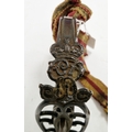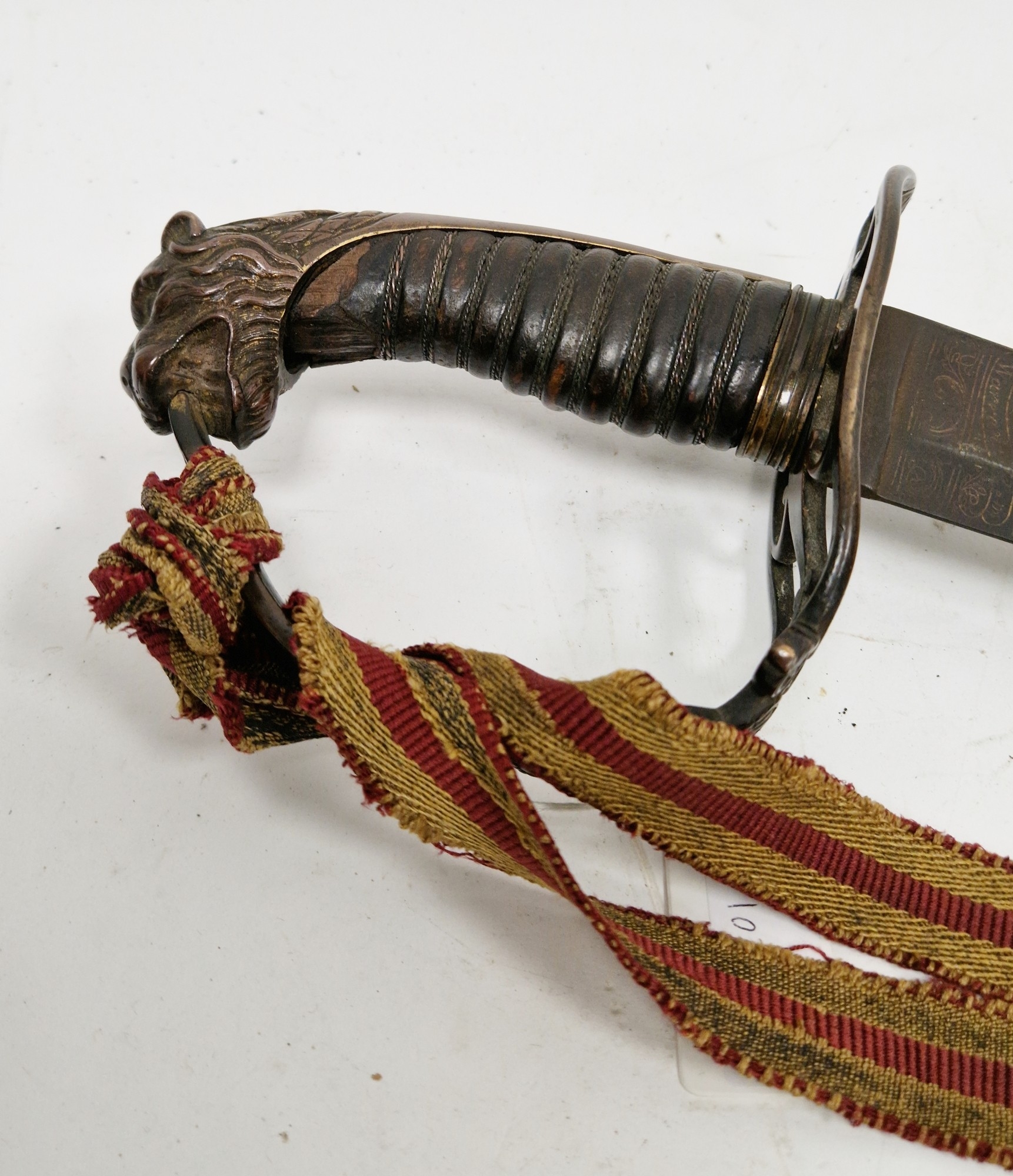 British 1803 pattern infantry flank officer's sword by Osborn & Gunby, etched foliate decoration throughout the curved blade, etched 'Osborn & Gunby, Warranted' with royal cypher to one side, pierced and moulded knucklebow guard with GR cypher, lion's head pommel, leather grip, with original leather and metal mounted scabbard, blade measures approximately 30 1/2 inch