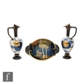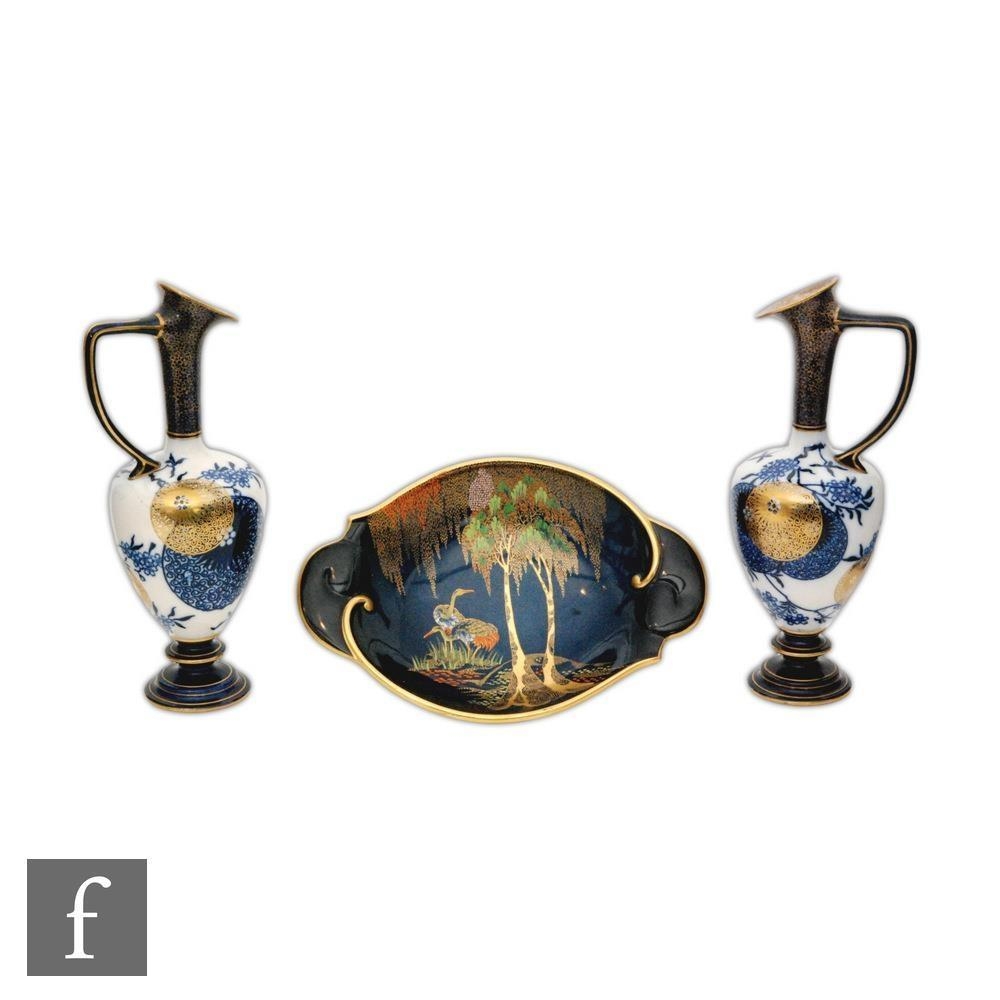 A pair of late 19th Century Doulton Aesthetic ewers decorated with mon motif and floral sprays, all in blue and white with gilt overlay, impressed marks, shape 3569, height 31cm, together with a 1930s Carlton Ware oval dish decorated in the New Stork pattern, length 29cm. (3)