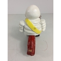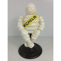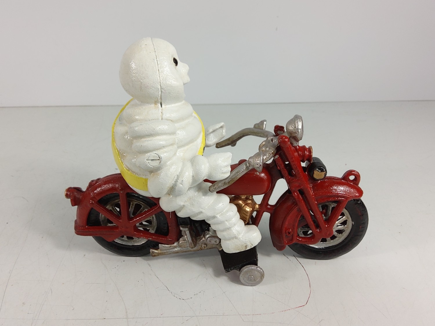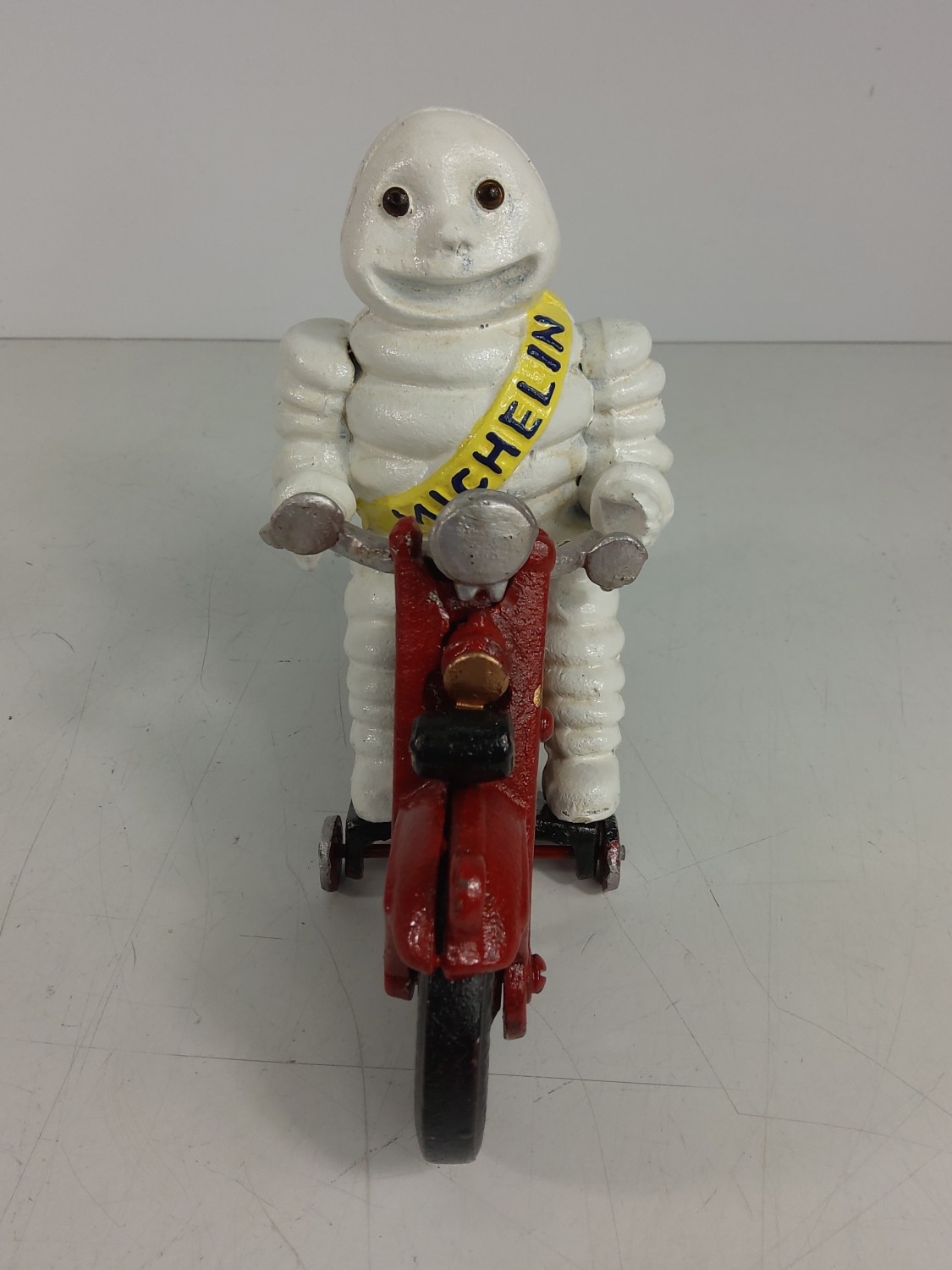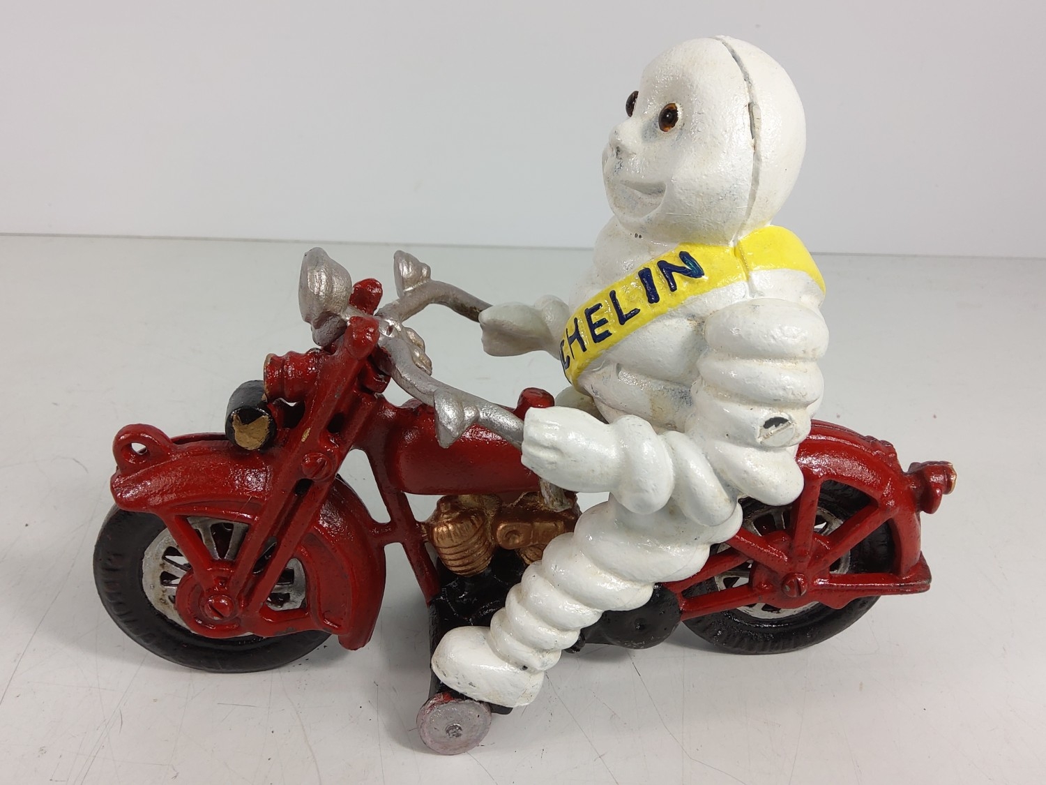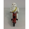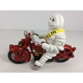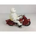 Cast metal Michelin man on motorbike