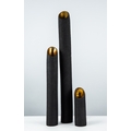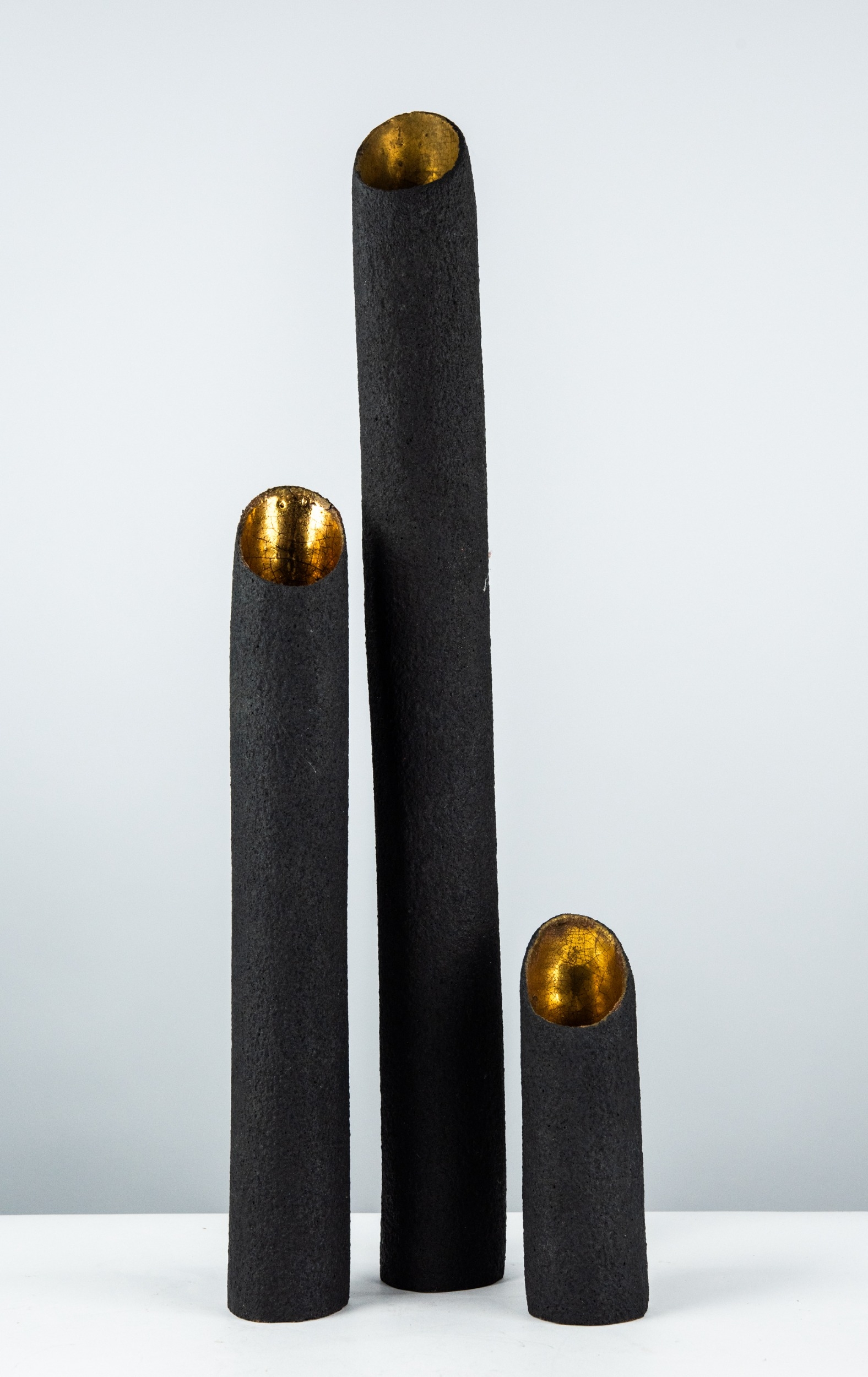 SOTIS FILIPPIDES SUITE OF THREE GRADUATED AND TEXTURED WALL MOUNTED CYLINDRICAL POTTERY VASES, each in matt black with 24k gold interiors, the neck cut at angle and with a mounting hole to the rear, 21 ¾” (55.2cm), 15” (38.1cm) and 7” (17.8cm) high, impressed marks to the bases, (3)