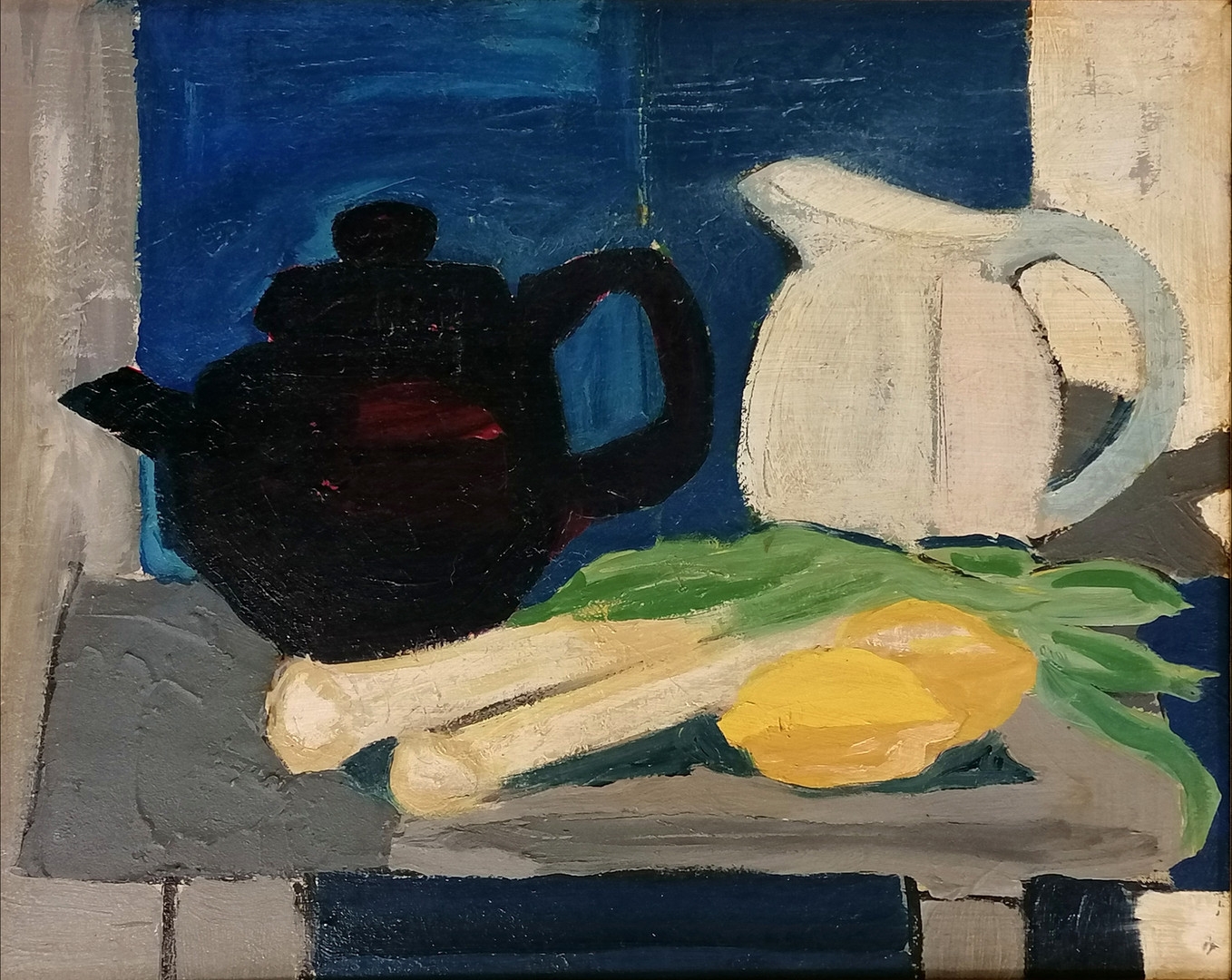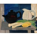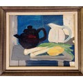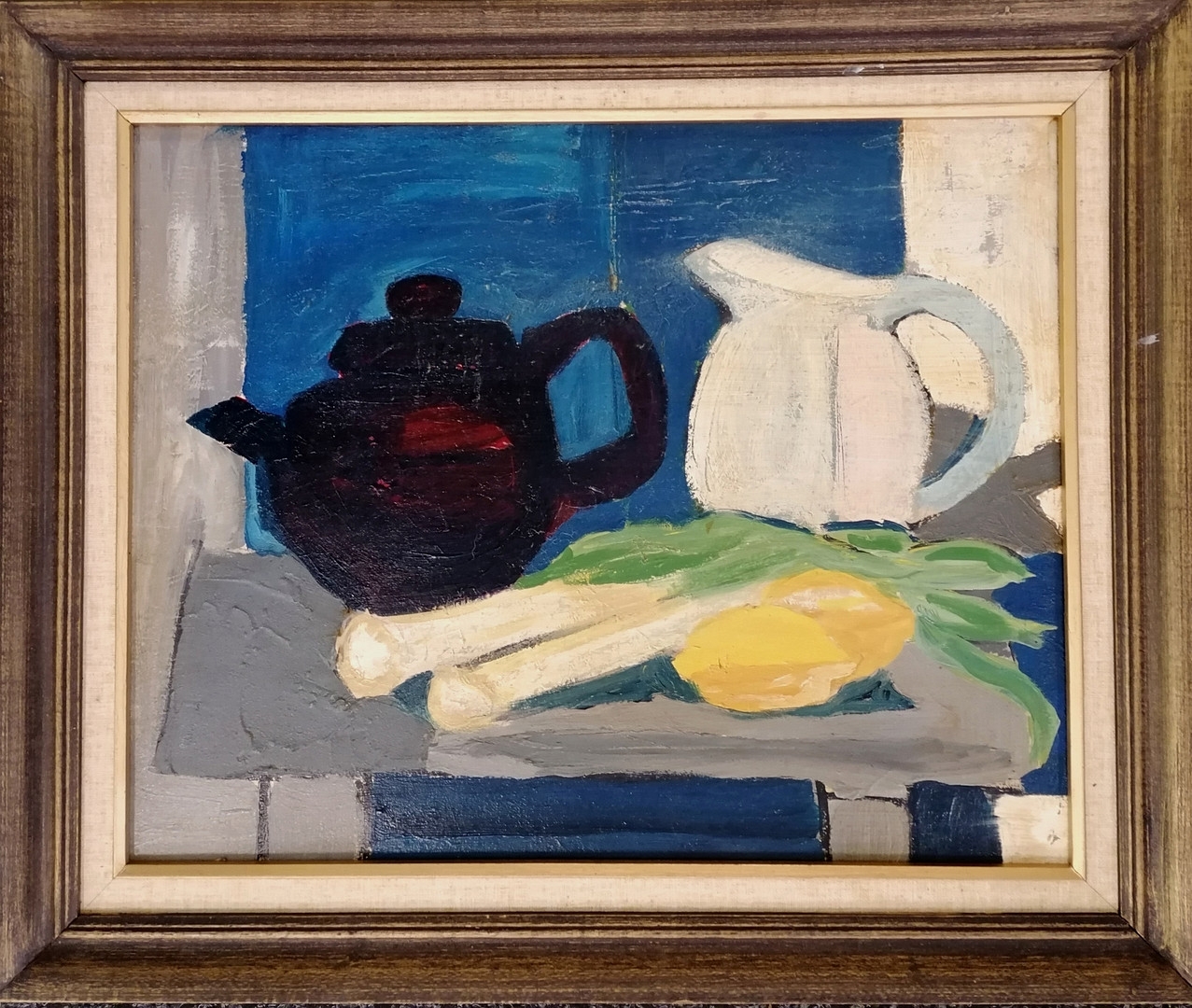 Mid century Swedish style oil painting on canvas of a teapot, jug, leeks and lemons unsigned frame 64cm x 53cm.
