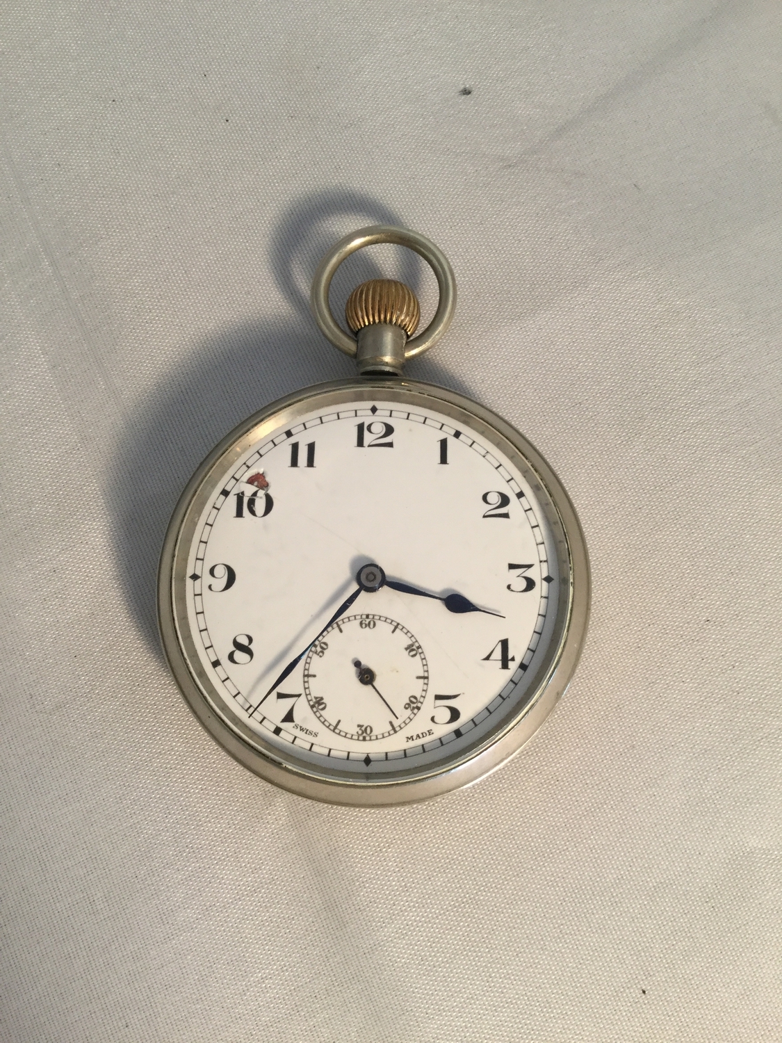 the white enamel dial, Arabic markers and subsidiary dial (damage to dial) -