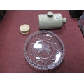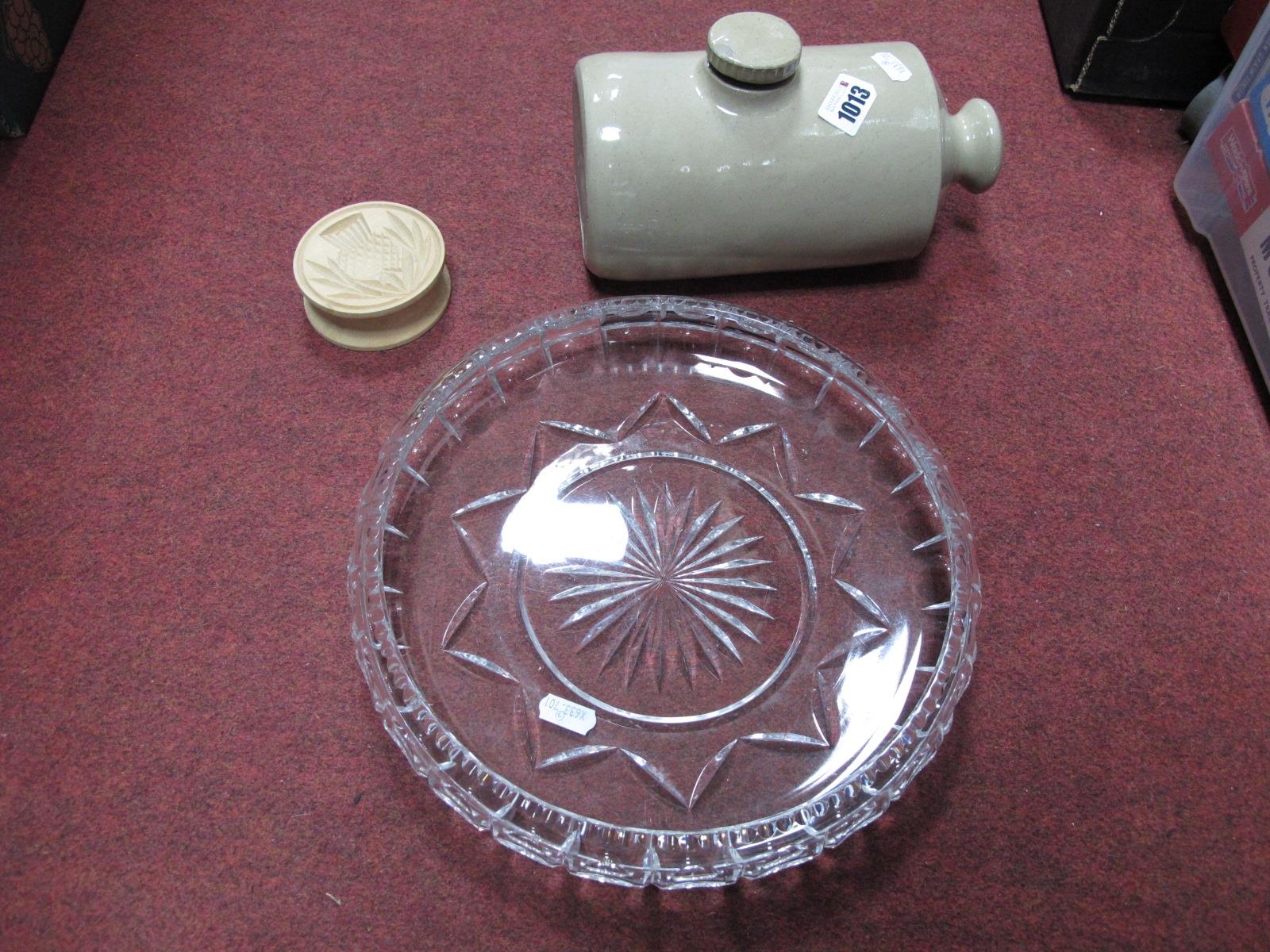 Stourbridge Cut Glass Fruit Bowl of Shallow Circular form, twin slice and globular bands, with star to base, etched"S" stamp 28cm diameter, butter mould, stoneware foot warmer (3)