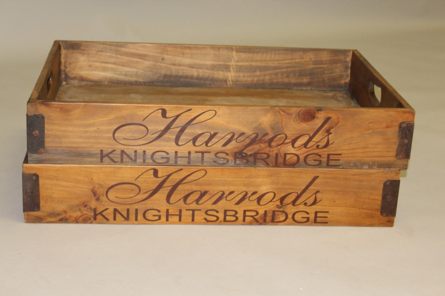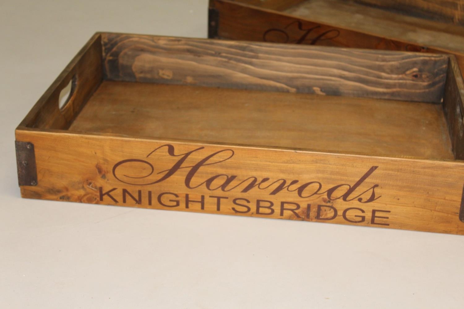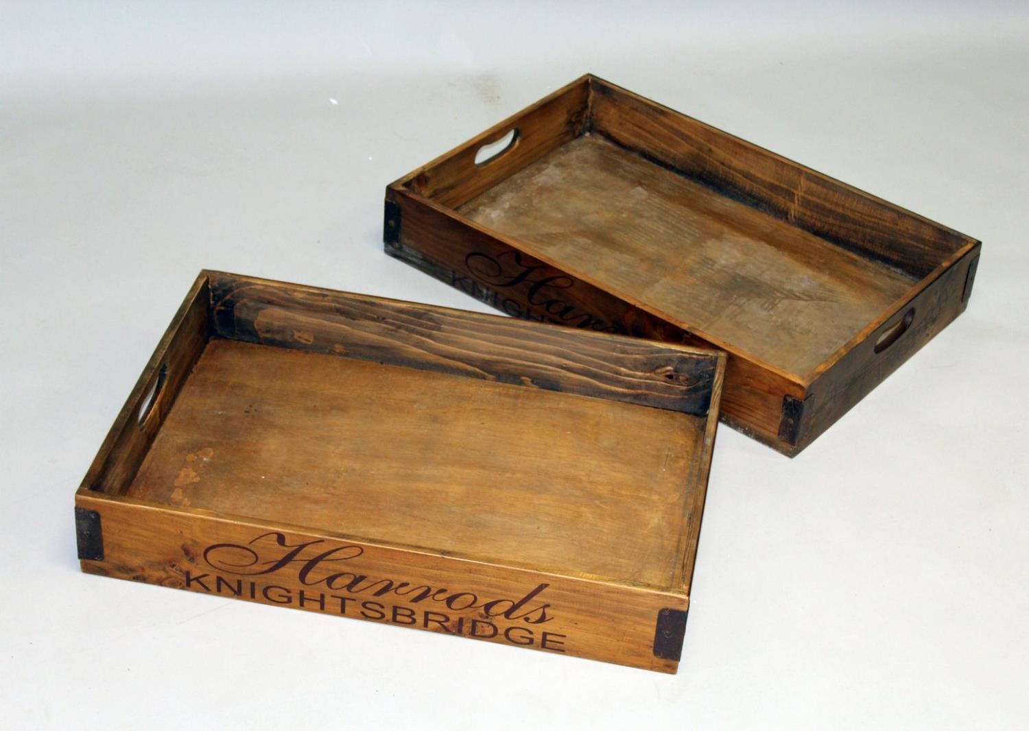 A PAIR OF HARRODS WOODEN TRAYS. 2ft 1ins.