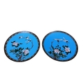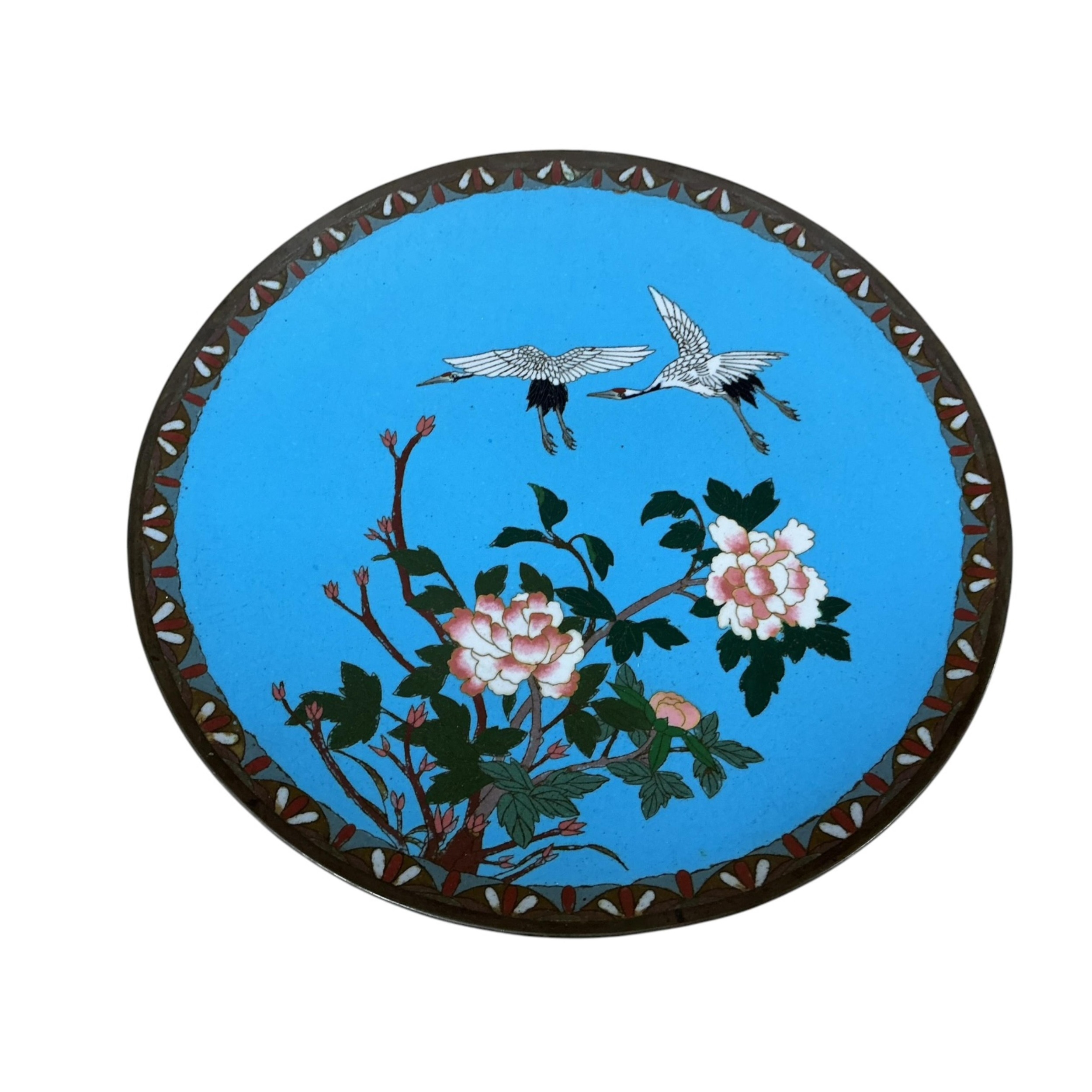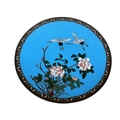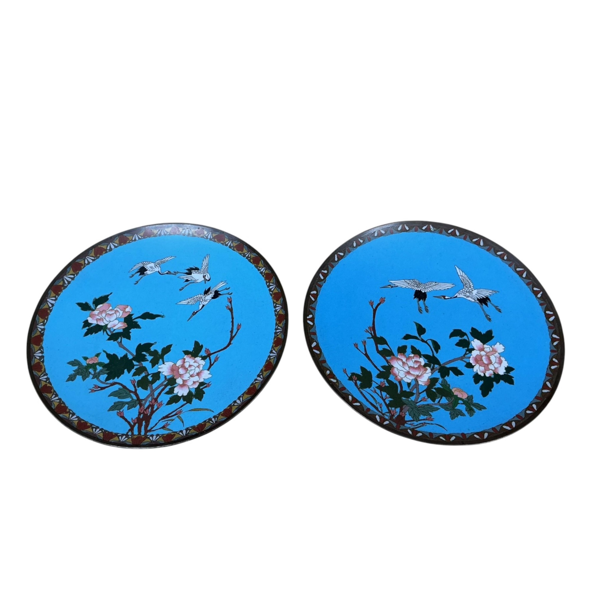 A pair of Japanese cloisonné plates enamelled with cranes and flowers, 30cm in diameter