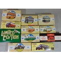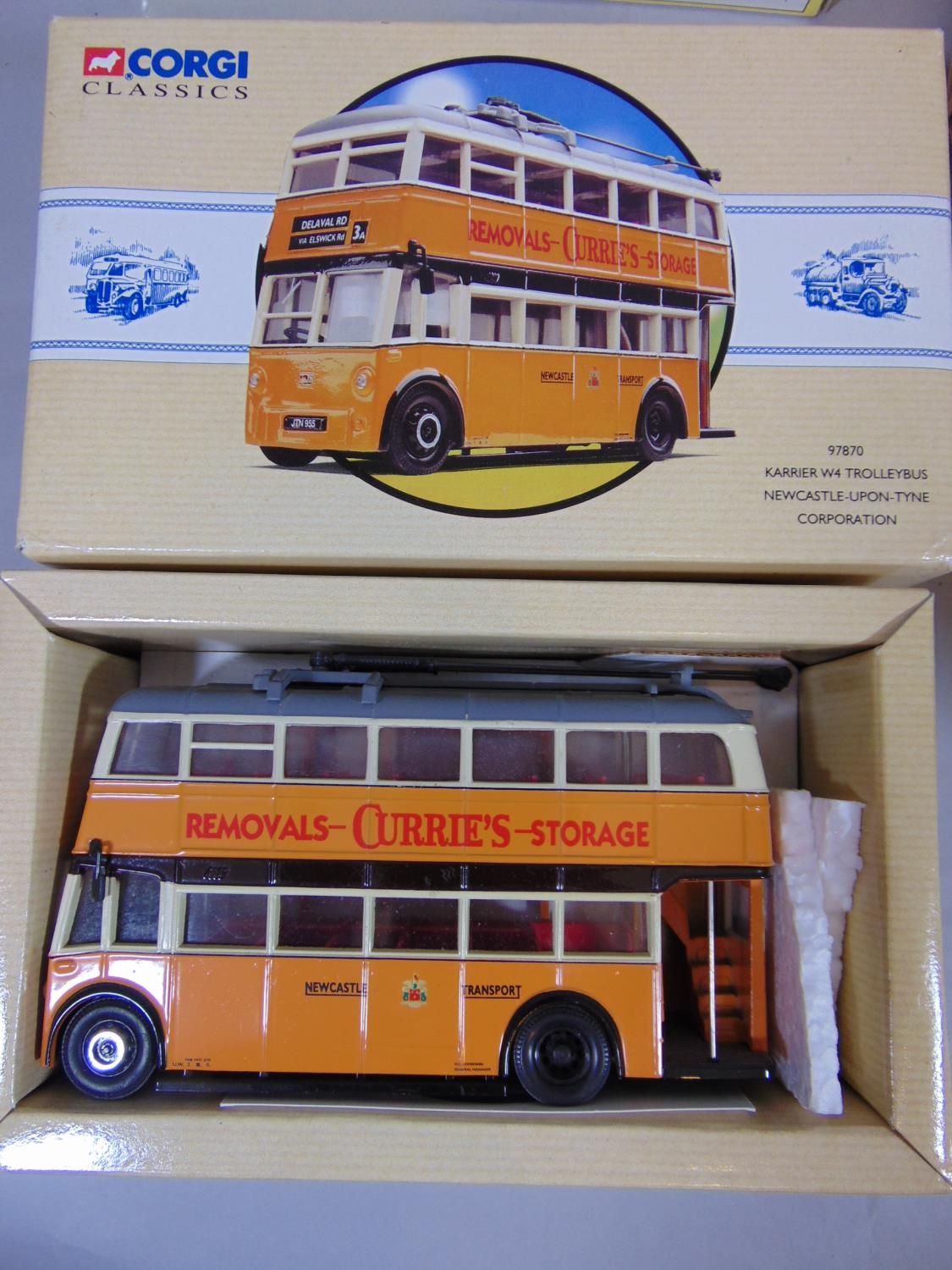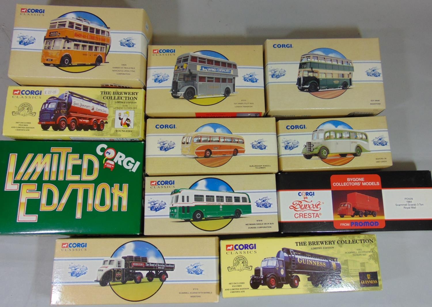 Collection of Corgi model buses and trucks, all boxed and in good condition, including 97870 trolleybus, 98163 Bedford OB, 97174 Burlingham Seagull, 3 further Classic Corgi buses, 3 from The Brewery Collection and 2 others (10)