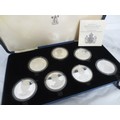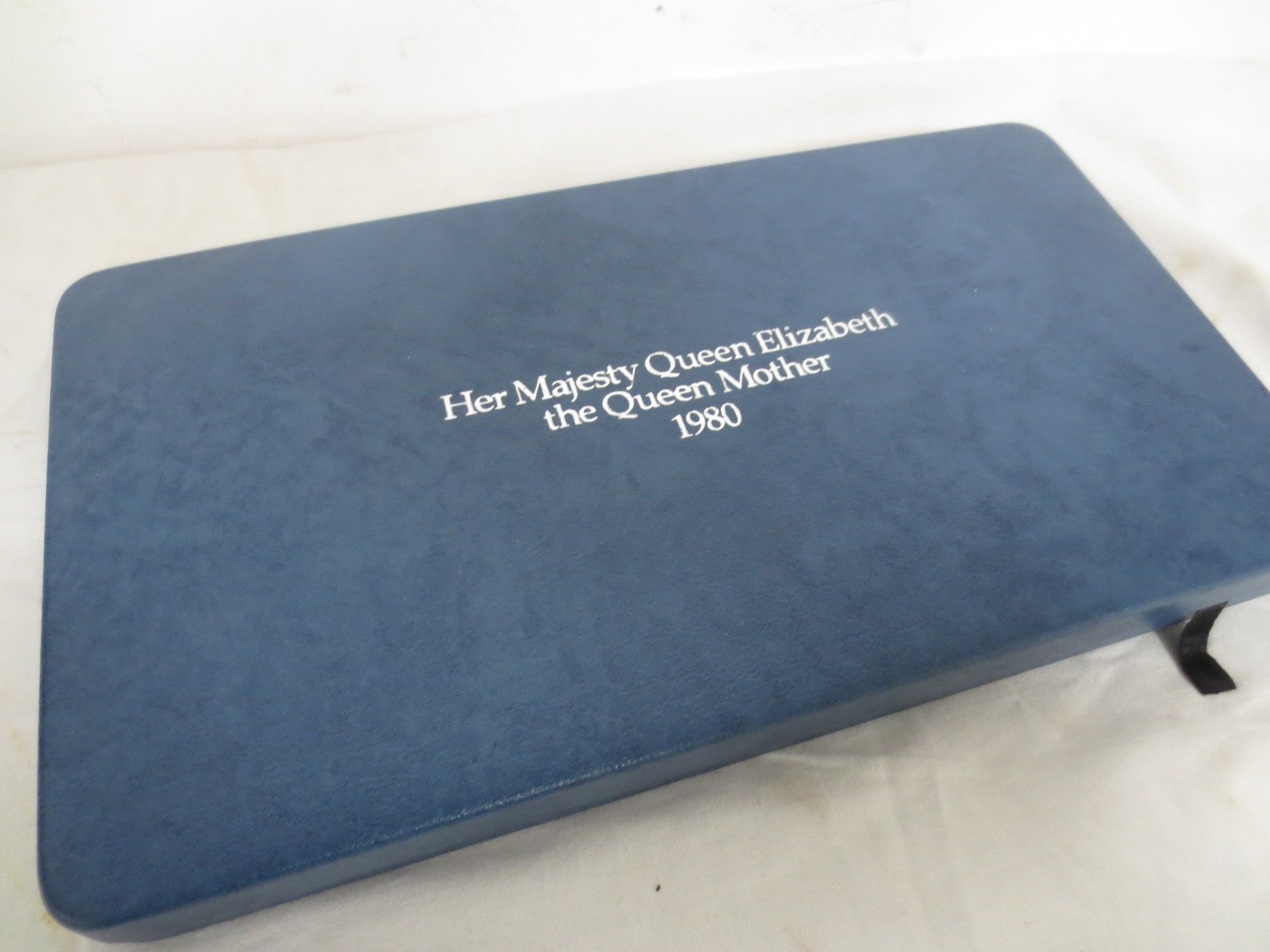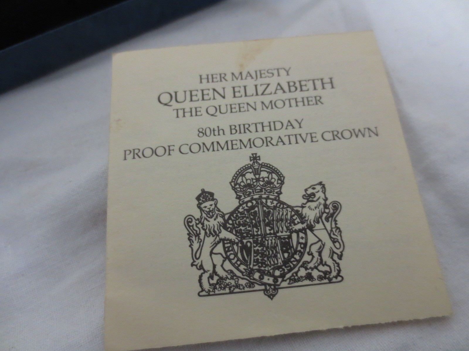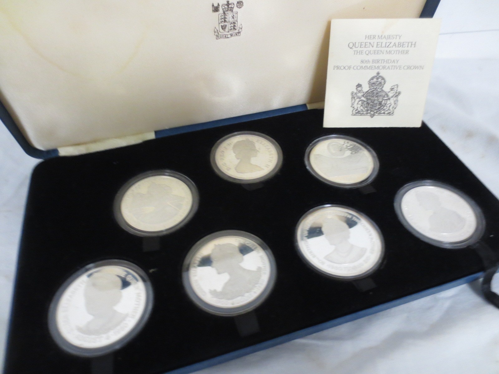 A 1980 proof set of sterling silver Queen Elizabeth the Queen Mother commemorative crowns, all encapsulated and in mint condition, with papers and in original presentation box