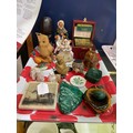 A mixed selection of assorted ornaments to include a Mackwoods fine tea caddy, a sea shell pin cushion, tribal bust etc