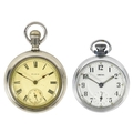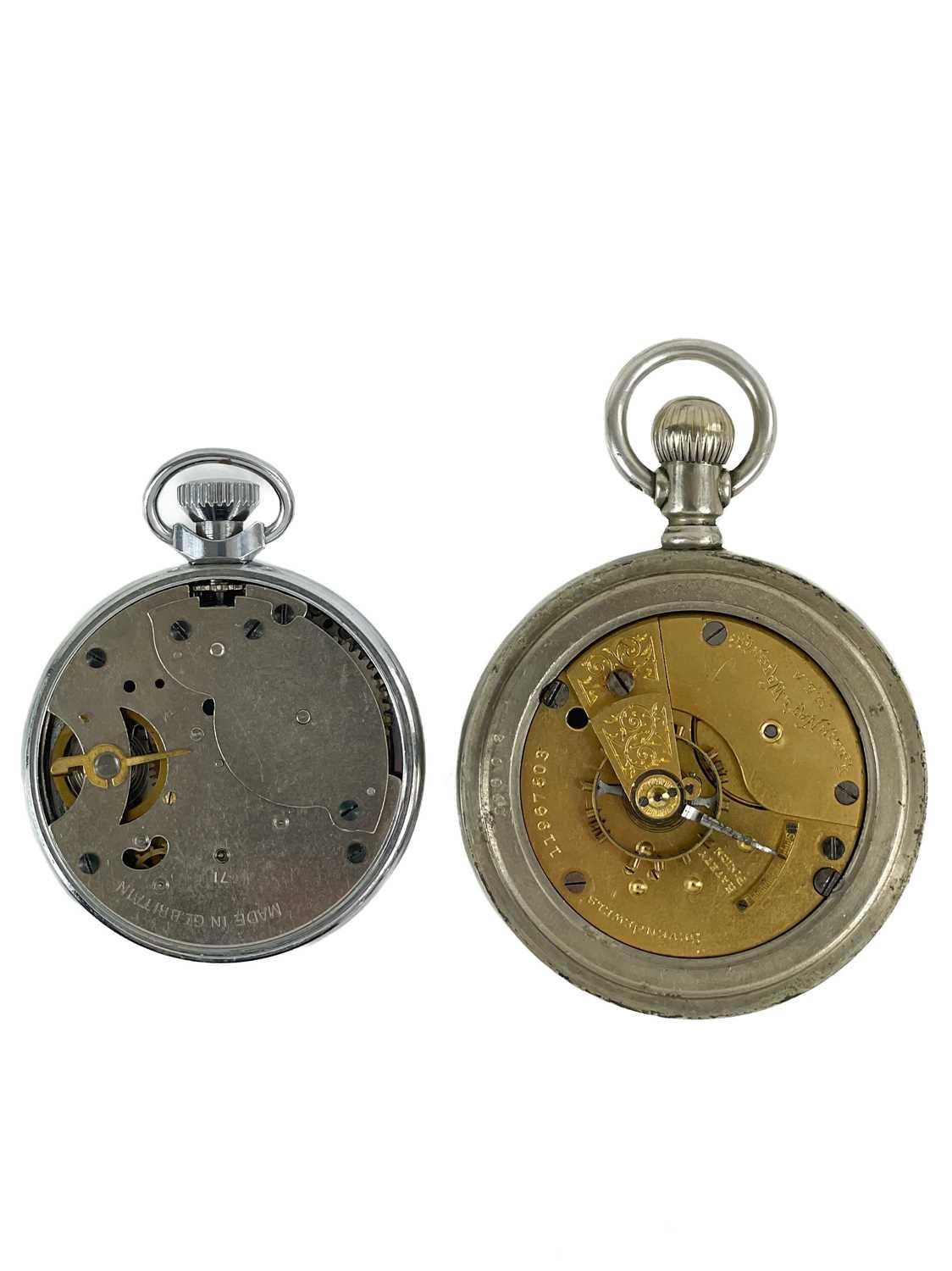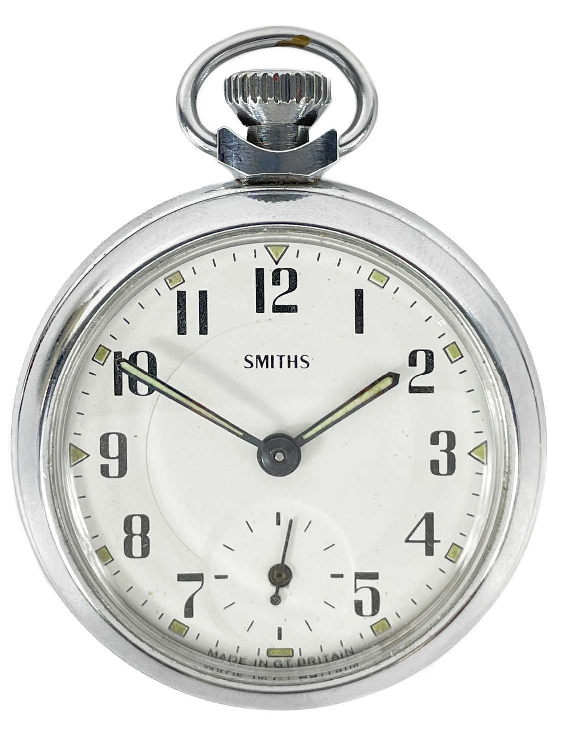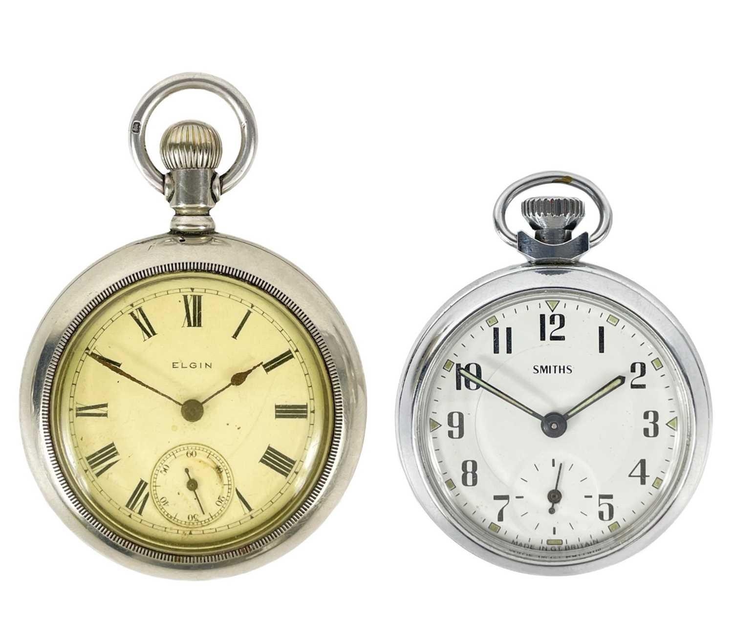 An Elgin crown wind pocket watch and a Smiths chrome cased crown wind pocket watch. The Elgin with signed 42mm dial, signed 7 jewel movement n0.11967803, keystone 'silveroid' 56mm case, not running; the Smiths pocket watch running.