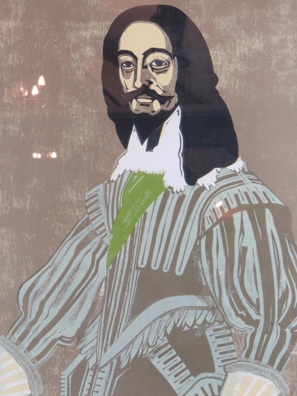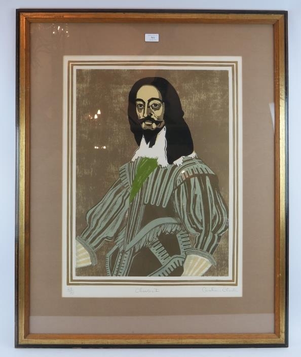 Graham Clarke (British, b.1941) - 'Charles I', pencil signed limited edition coloured woodcut print, number 68/75, 58cm x 43cm, framed.