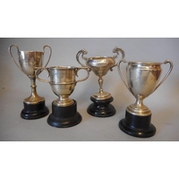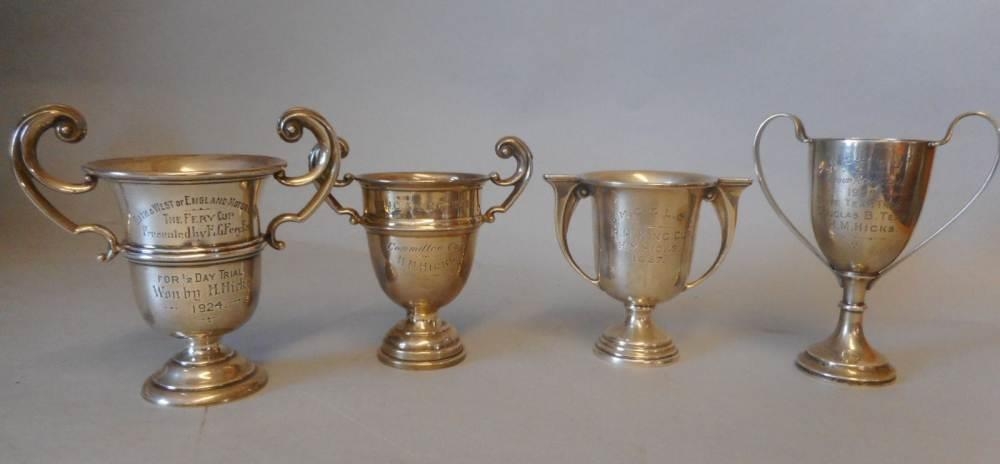 Four small silver trophy cups, various makers and dates: awarded to H.M.Hicks, includes; Bath & West of England Motor Club The Fery Cup For Half Day Trial, 1924; W.C.A.C.U. Stroud Team Trial 1928 Douglas B Team, 1928; B.M.C.&L.C.C. P.H.King Cup, 1927; and B.M.C.& L.C.C. Committee Cup,1929, total weight of silver 198gms, 6.38ozs. (4).