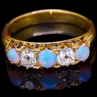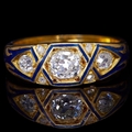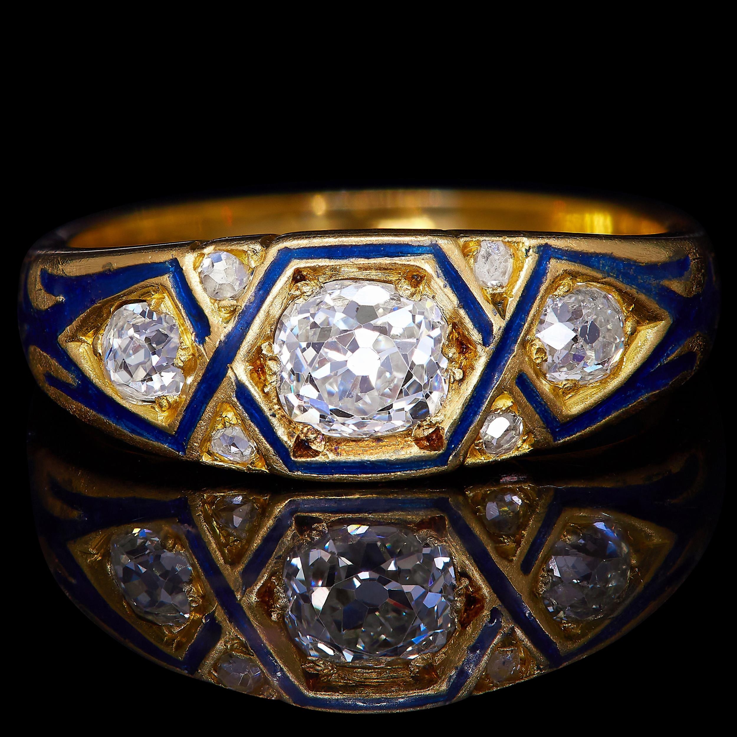 ANTIQUE VICTORIAN DIAMOND AND ENAMEL DRESS RING, set with 3 larger diamonds to the center, accentuated with blue enamel to the head and shoulders and 4 smaller diamonds. Size N. 6.1 grams.