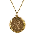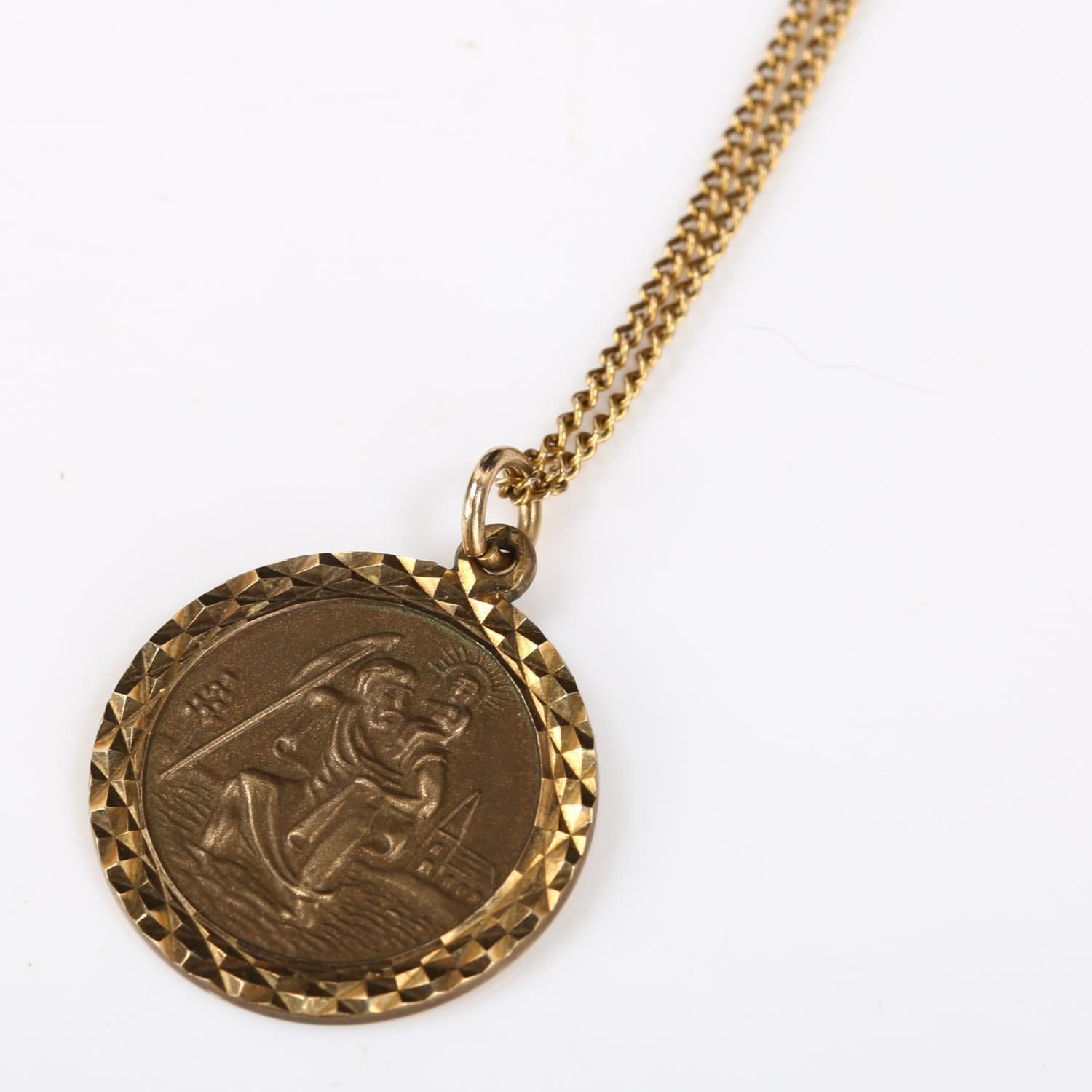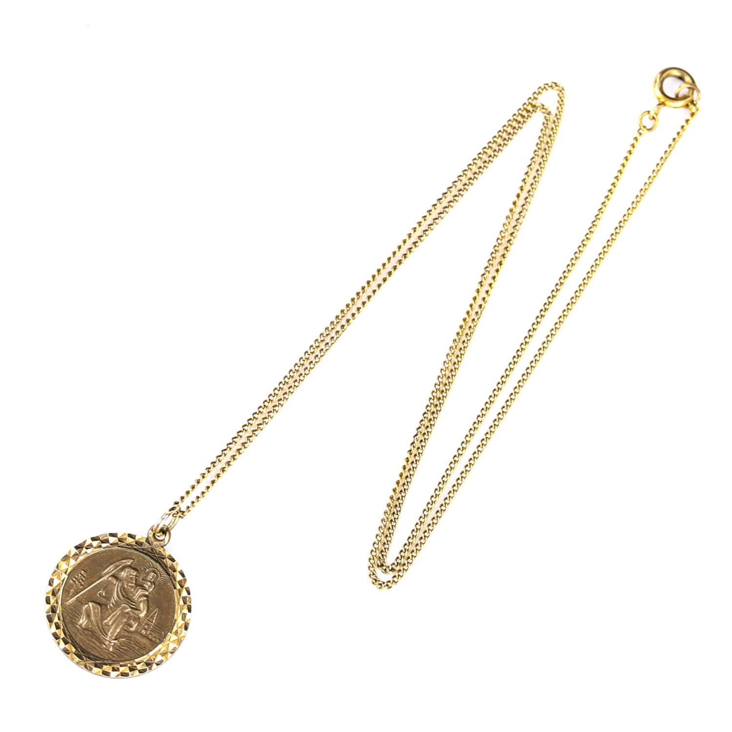 A mid-20th century 9ct gold St Christopher pendant necklace, on unmarked yellow metal fine curb link chain, pendant hallmarks London 1968, pendant height 21.6mm, chain length 46cm, 4.7g