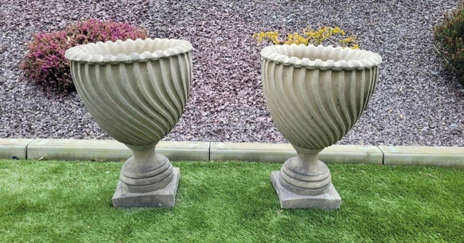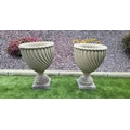 A PAIR OF STONE GARDEN RAVENNA URNS, design in relief to body, standing on square platform base. Dimensions: 30in high approx.
