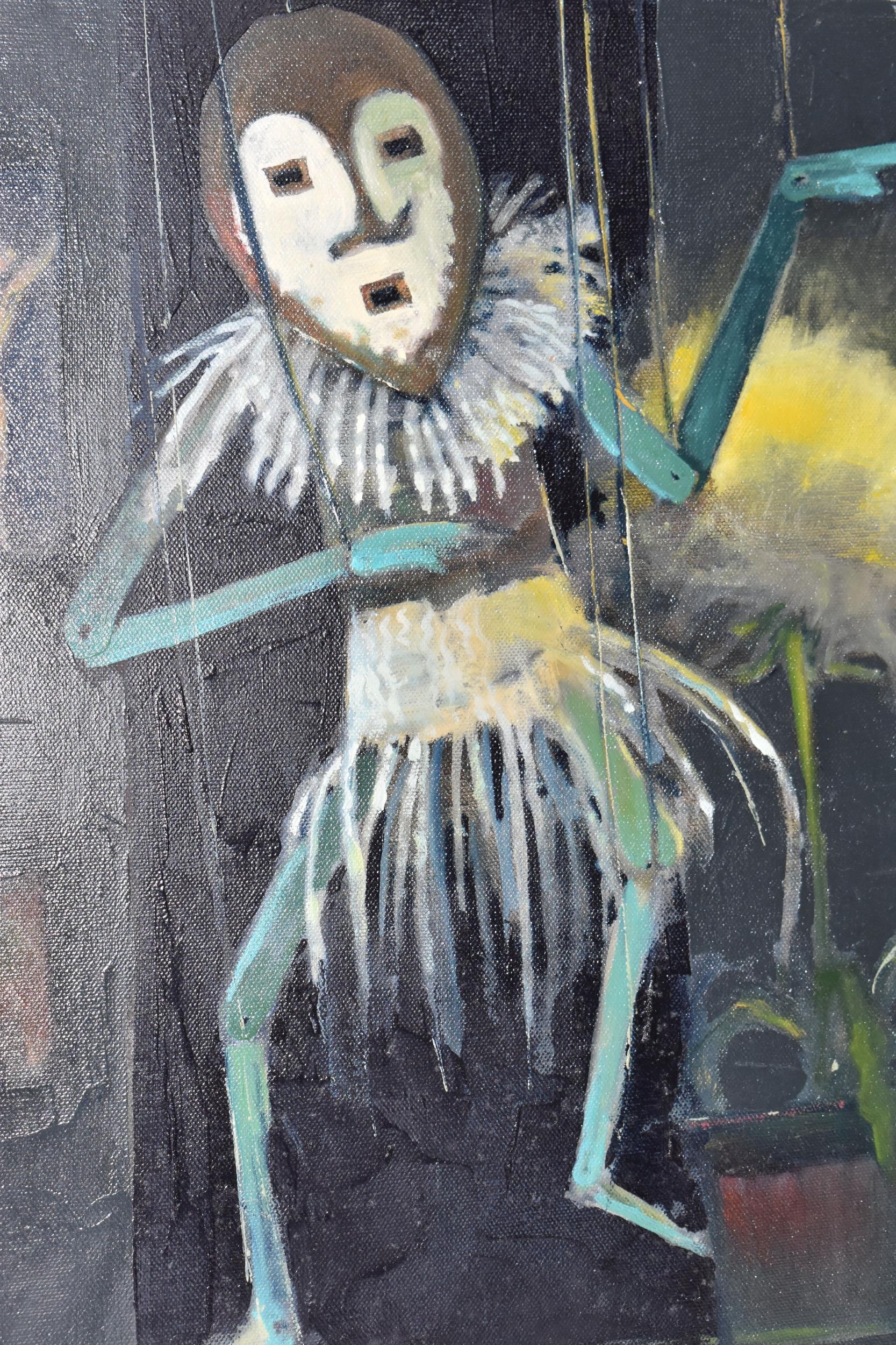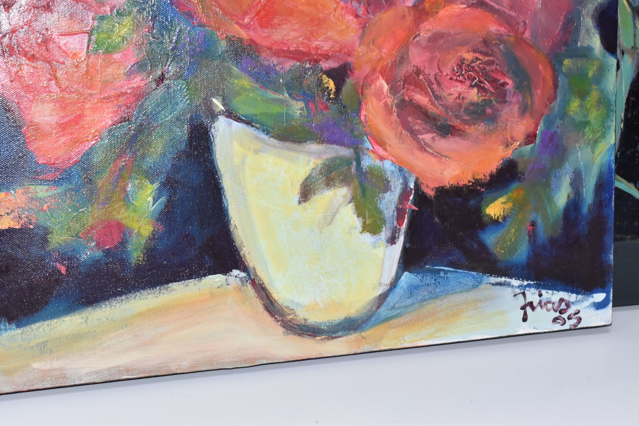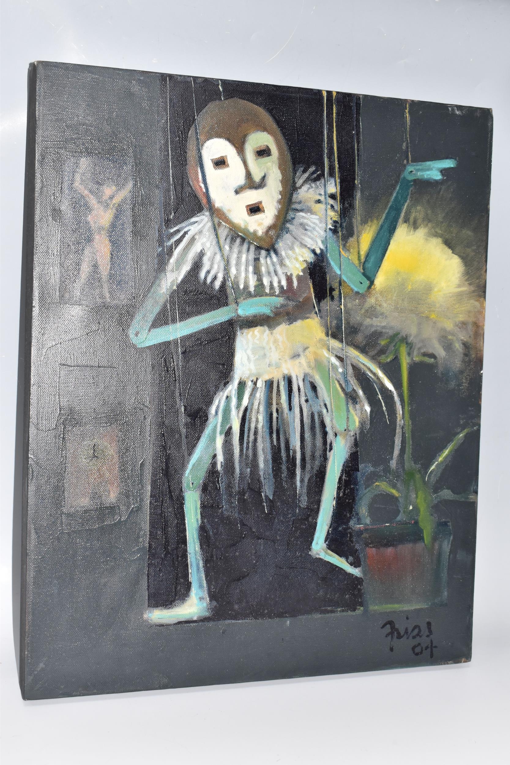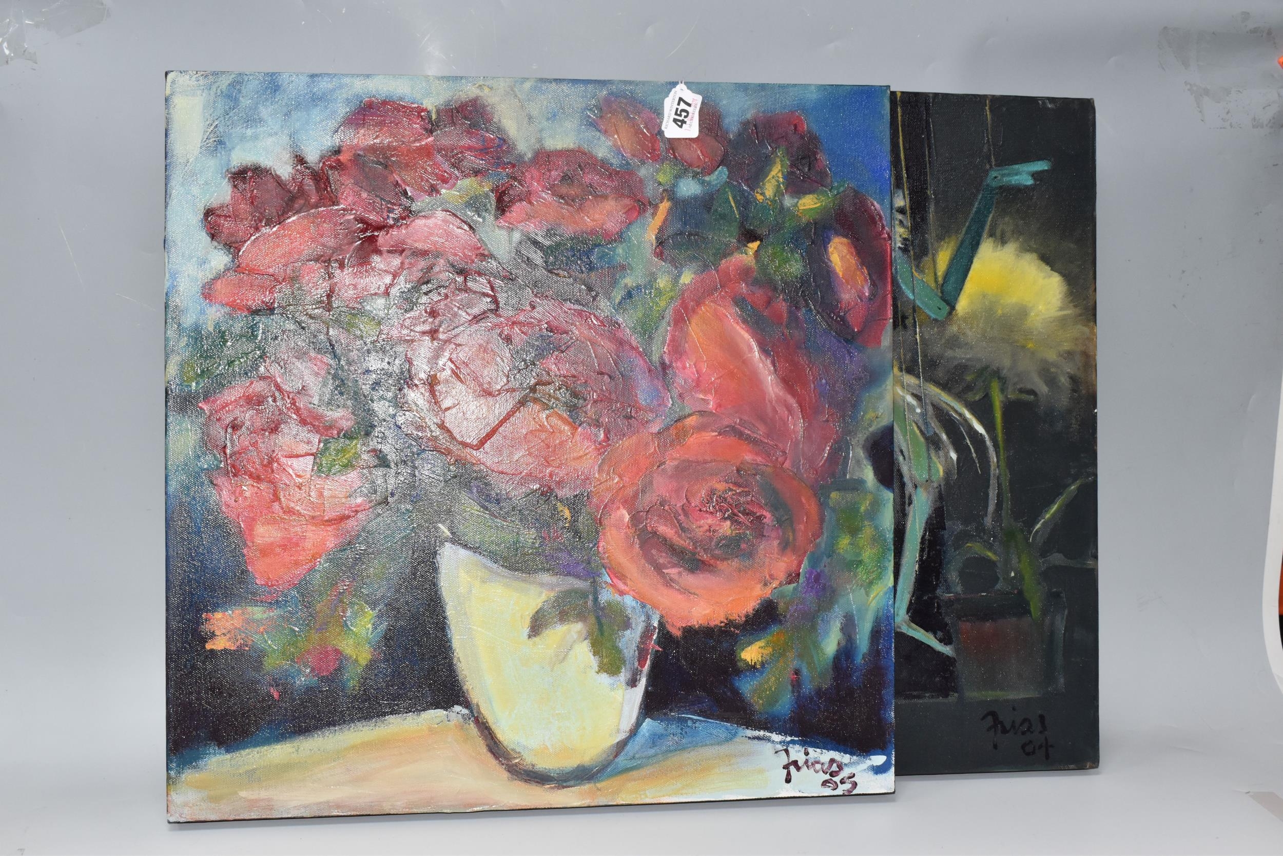PAUL MARTINEZ-FRIAS (BRITISH 1929-) A STILL LIFE STUDY OF FLOWERS IN A VASE, signed and dated (20)05 bottom right, oil on box canvas, approximate size 51cm x 51cm, together with a study of an African puppet by the same hand, signed and dated (20)04 bottom right, oil on box canvas, approximate size 51cm x 41cm, Condition Report: puppet picture has a spot of paint loss to the right edge, both have dirty marks to the sides (artist resale rights apply)