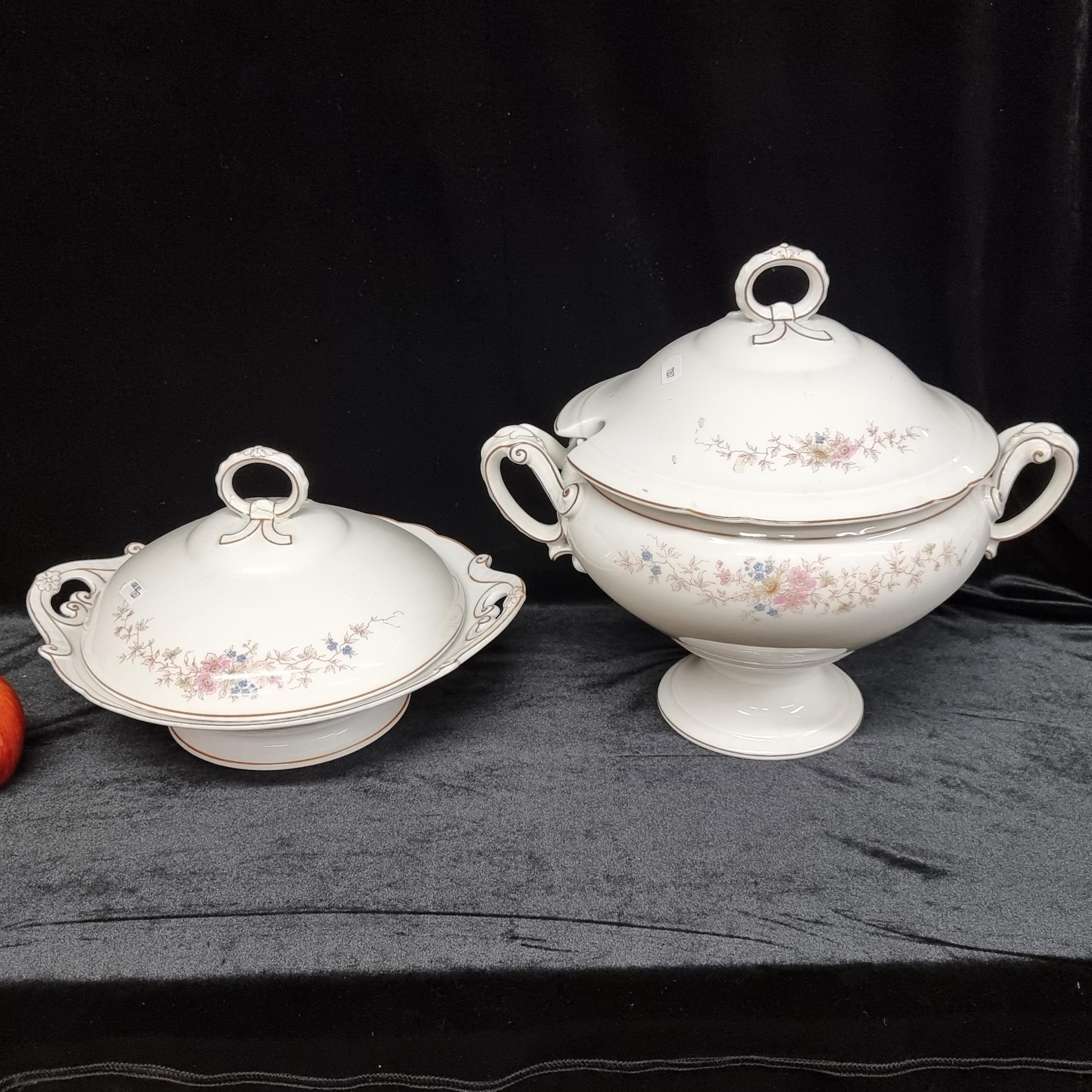 Two antique, fine china items by ''Bing Jr. & CC'' including a large tureen and a lidded bowl. Decorated with floral motifs and lid. Circa Frankfurt, 1890s