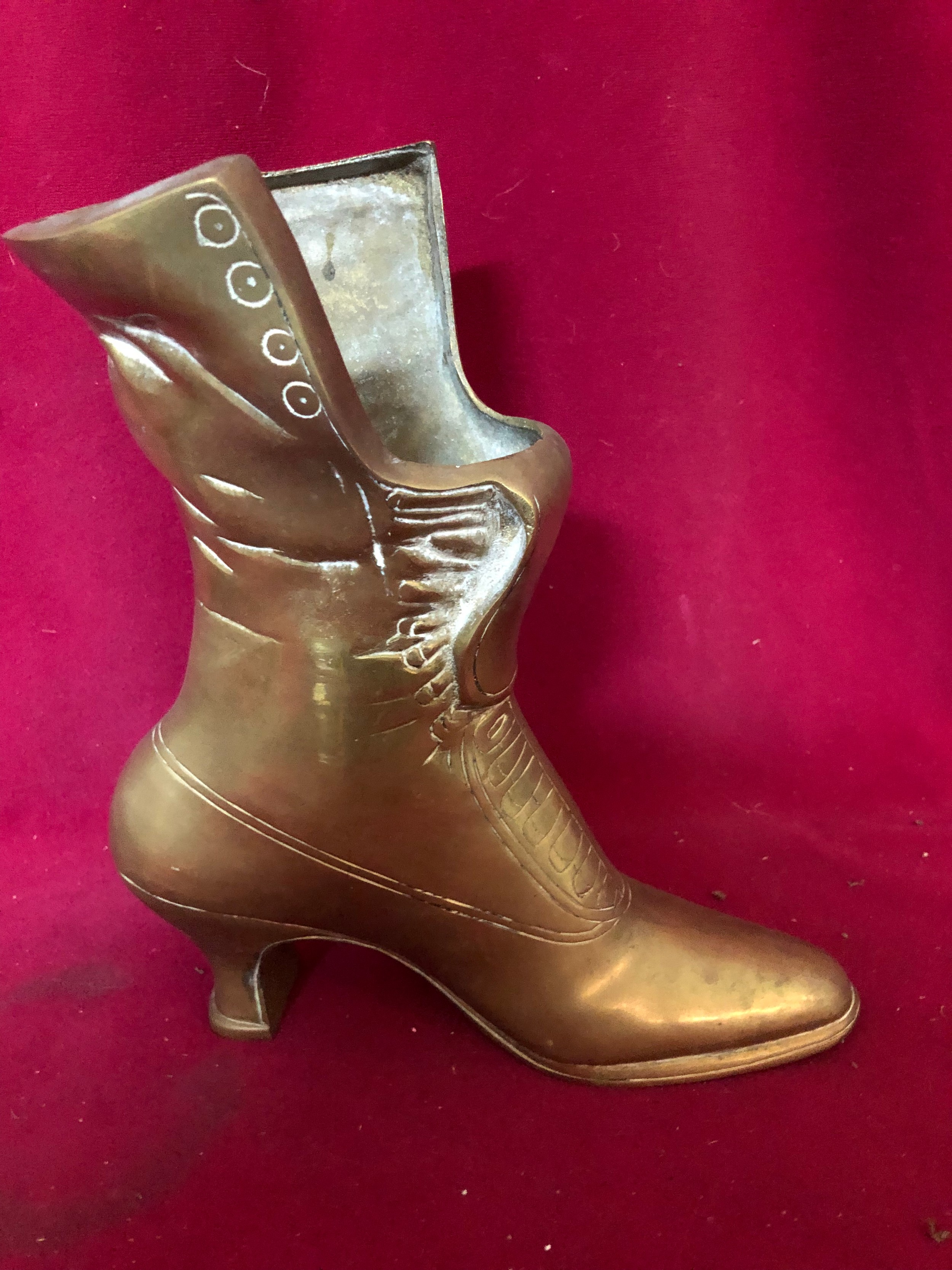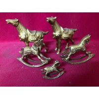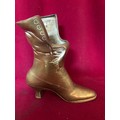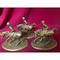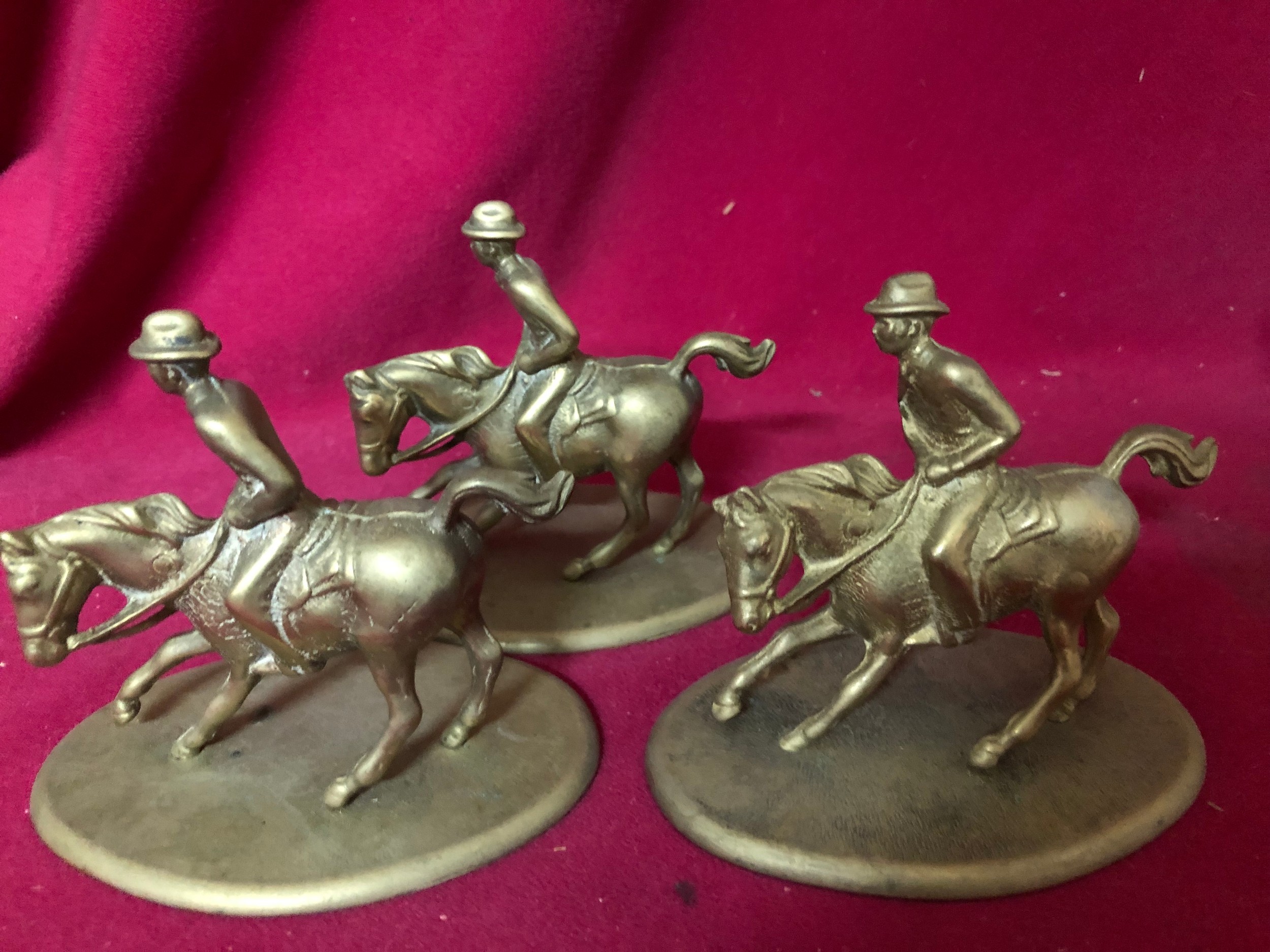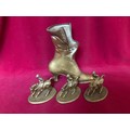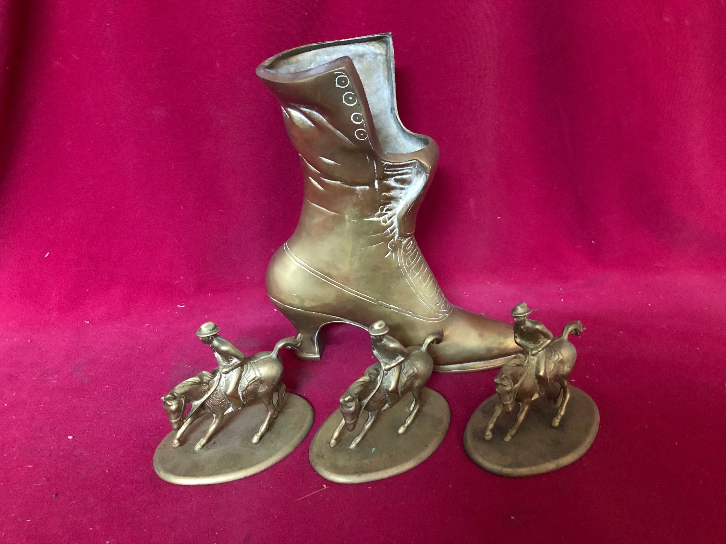 A brass boot measuring 22 cms tall and 3 brass figures on horseback made in Italy measuring 10cms tall