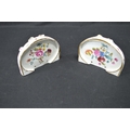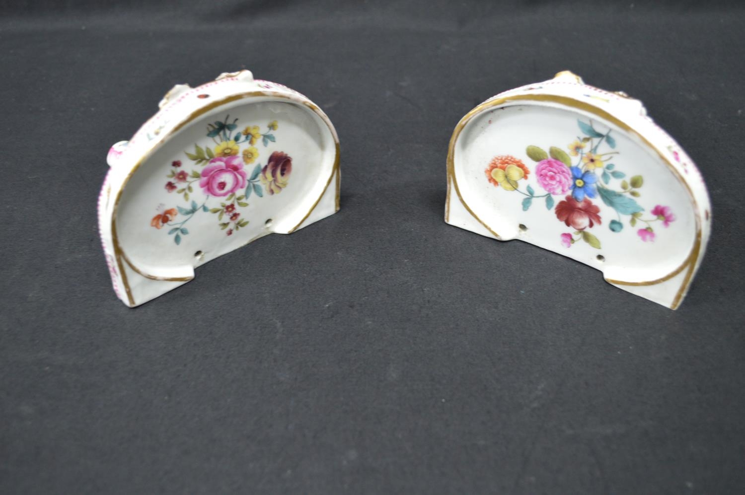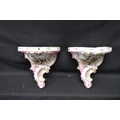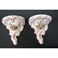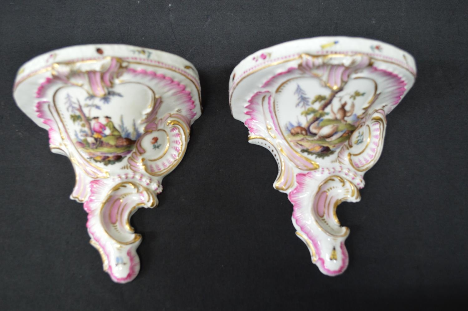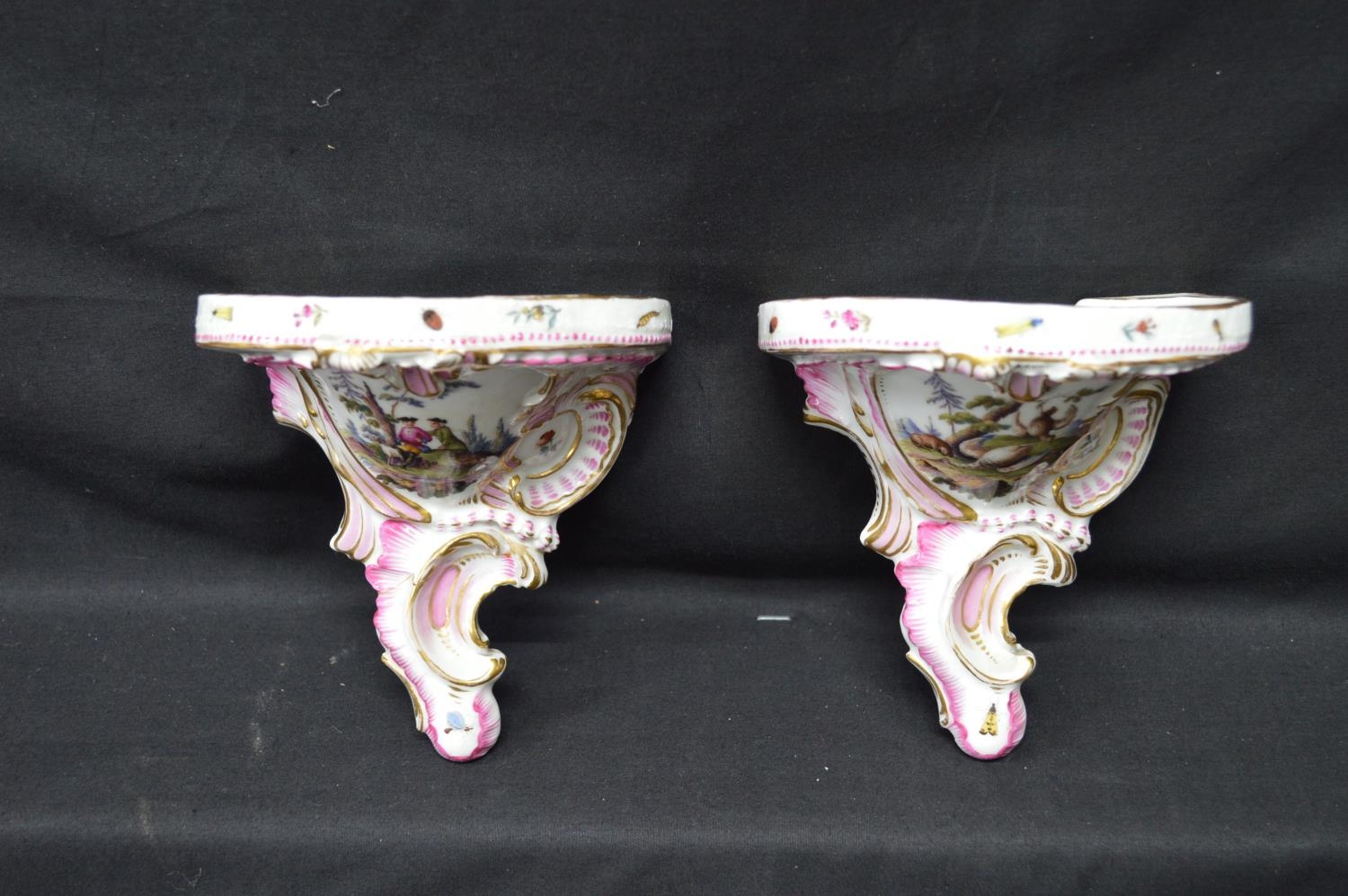 Pair of Meissen wall brackets having panels of figures, flowers and game surmounted by pink and gilt highlights with insects - 5" tall x 4.75" wide